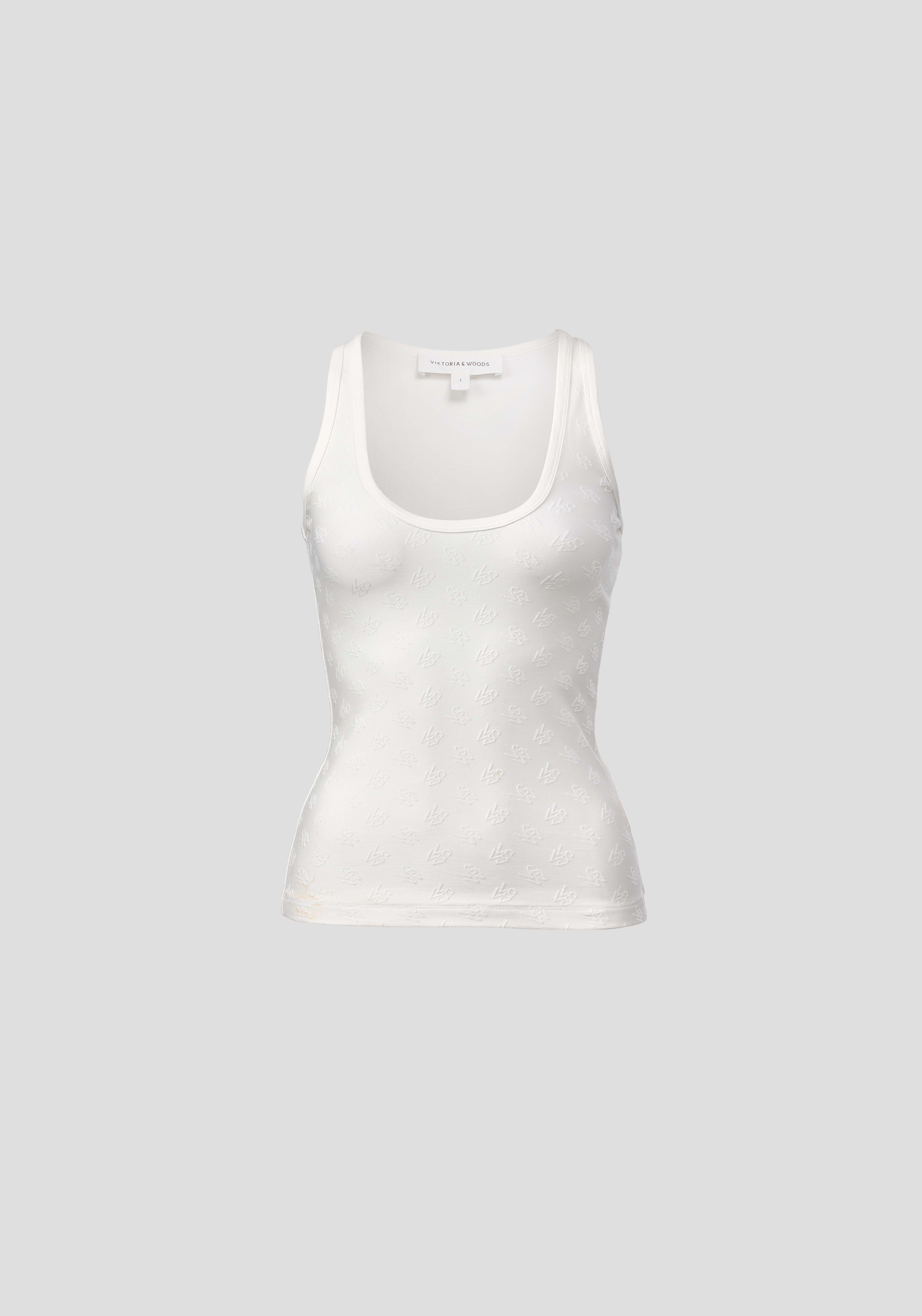Introducing the Saint Tank, a seasonless basic for the modern wardrobe. This effortless white tank features a fitted silhouette, scooped neckline, and fun V&W jacquard detailing. The perfect first layer for everyday dressing, it fuses refined simplicity with a considered touch.
