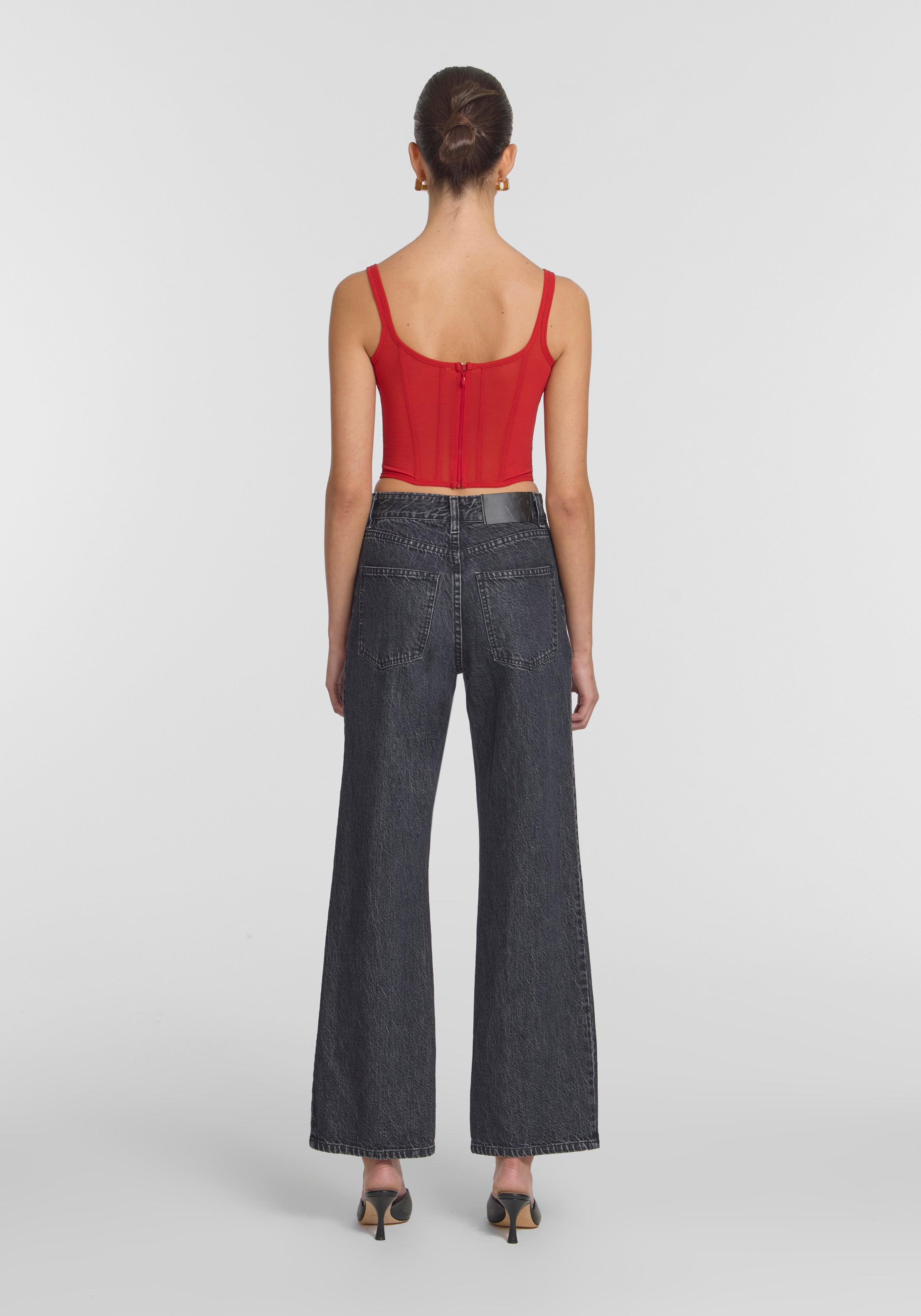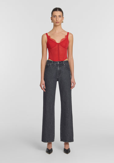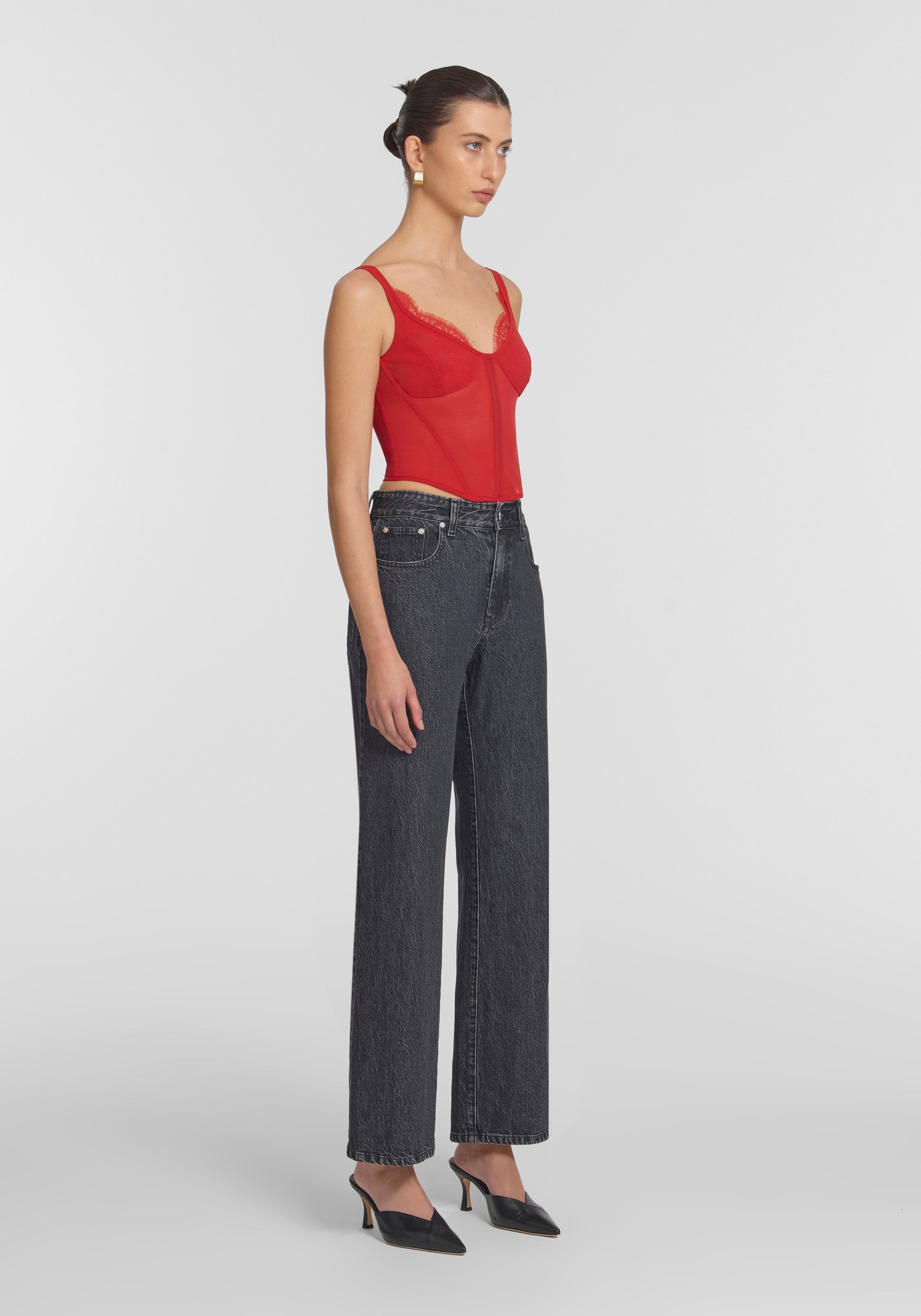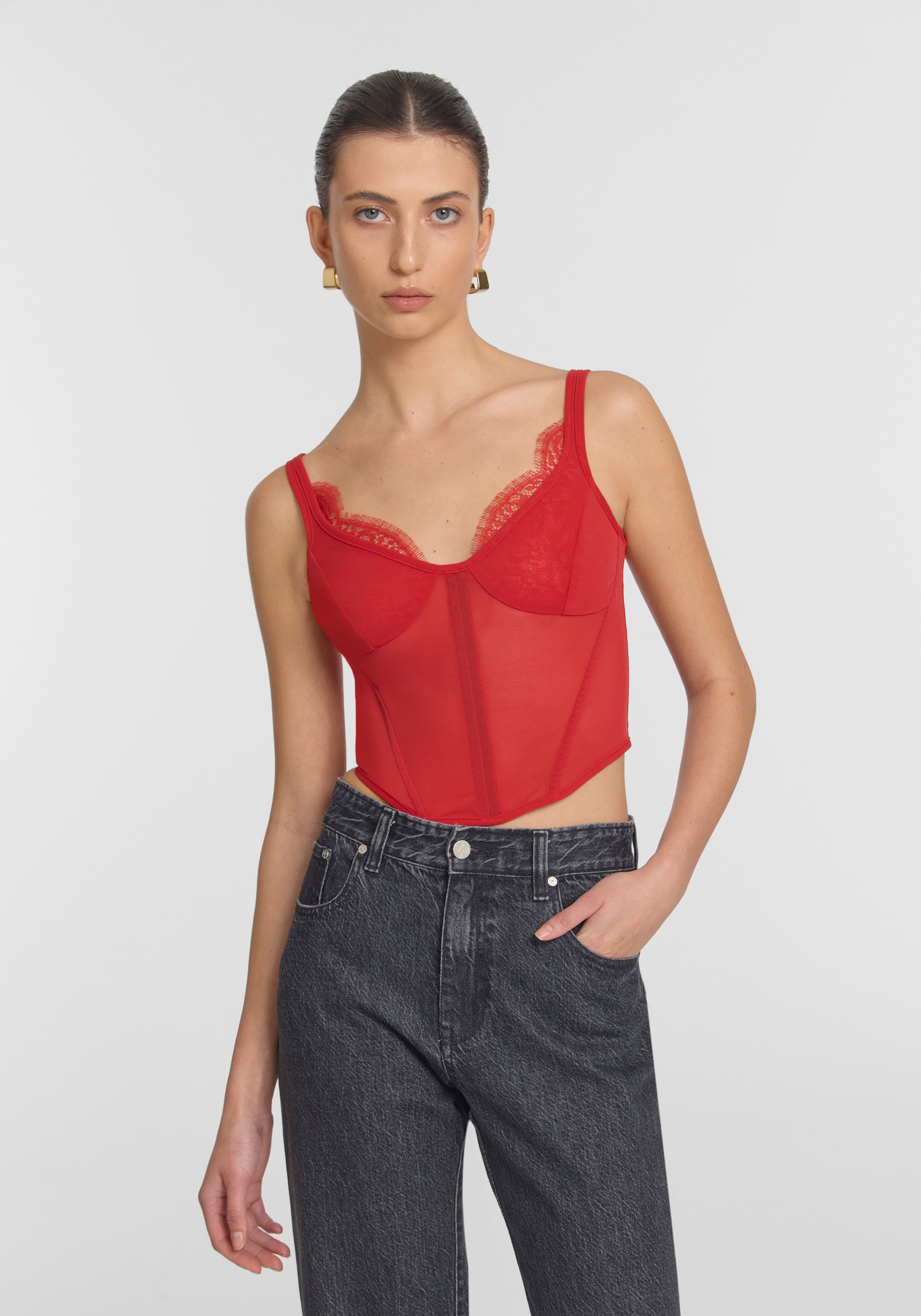 Introducing the Salacious Bustier in red, a captivating addition to the V&W power mesh narrative. Featuring a scooped neckline with delicate lace detailing at the bust, a soft curved hem, and panel boning for added structure, this red corset top is your go-to for nights out, effortlessly marrying femininity with edgy allure. Pair it with the matching Whirlwind Pant for bold look or with any bottoms for versatile take.