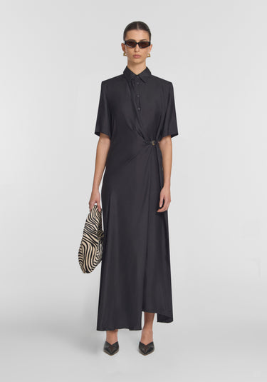 The Scorpius Dress, crafted in luxurious black silk twill, reimagines the shirt dress with modern detailing. Featuring a structured collar, relaxed short sleeves and an engineered wrap design with a branded leather belt, it’s finished with an asymmetrical hem and front split. Effortlessly refined, it’s the perfect workwear style that will carry you into the evening.