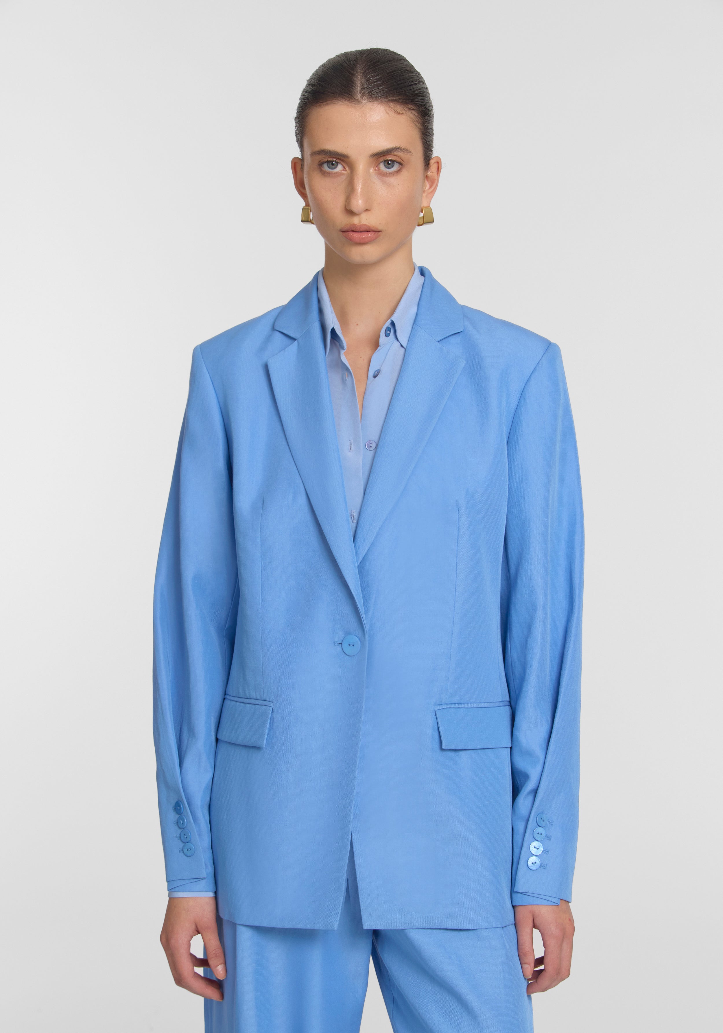 The Shoreline Blazer, inspired by LA’s coastal calm, refreshes your tailoring for the season. Crafted from a Tencel-linen blend with a subtle sheen, it features sculptural sleeve detailing, welt pockets, textured buttons, and double back vents. Pair with the matching Tanner Pant for a fresh, sophisticated set that radiates effortless ease.