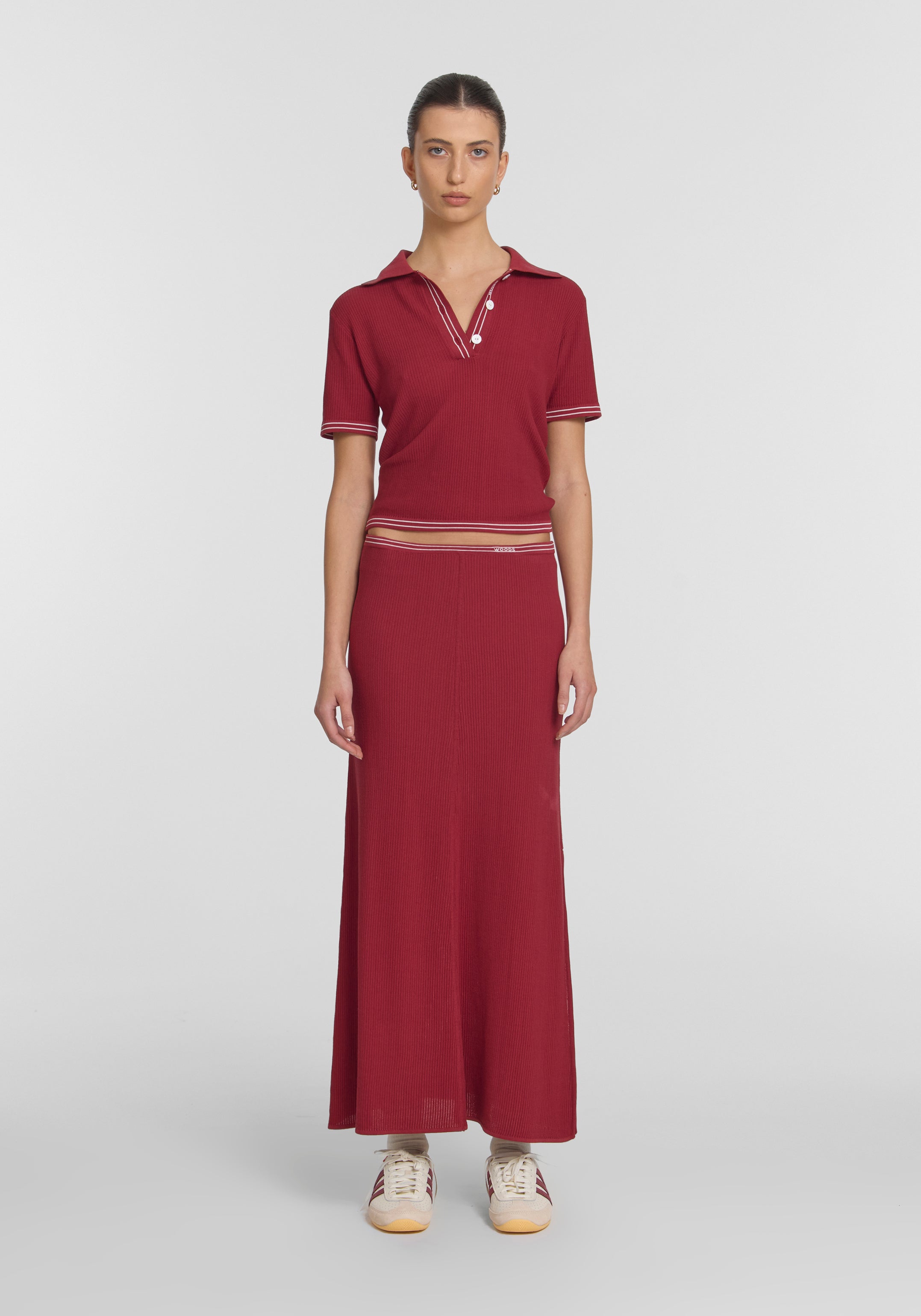 Designed for refined leisure, the Showtime Skirt is crafted from a luxurious cotton-silk blend in deep red. Featuring an elasticated waistband for a neat fit at the waist, it gently flares at the hem for a flattering silhouette, adorned with contrast WOODS embroidery and detailing. Pair with the Masquerade Polo for a sporty set or style with your essentials for an effortless look.