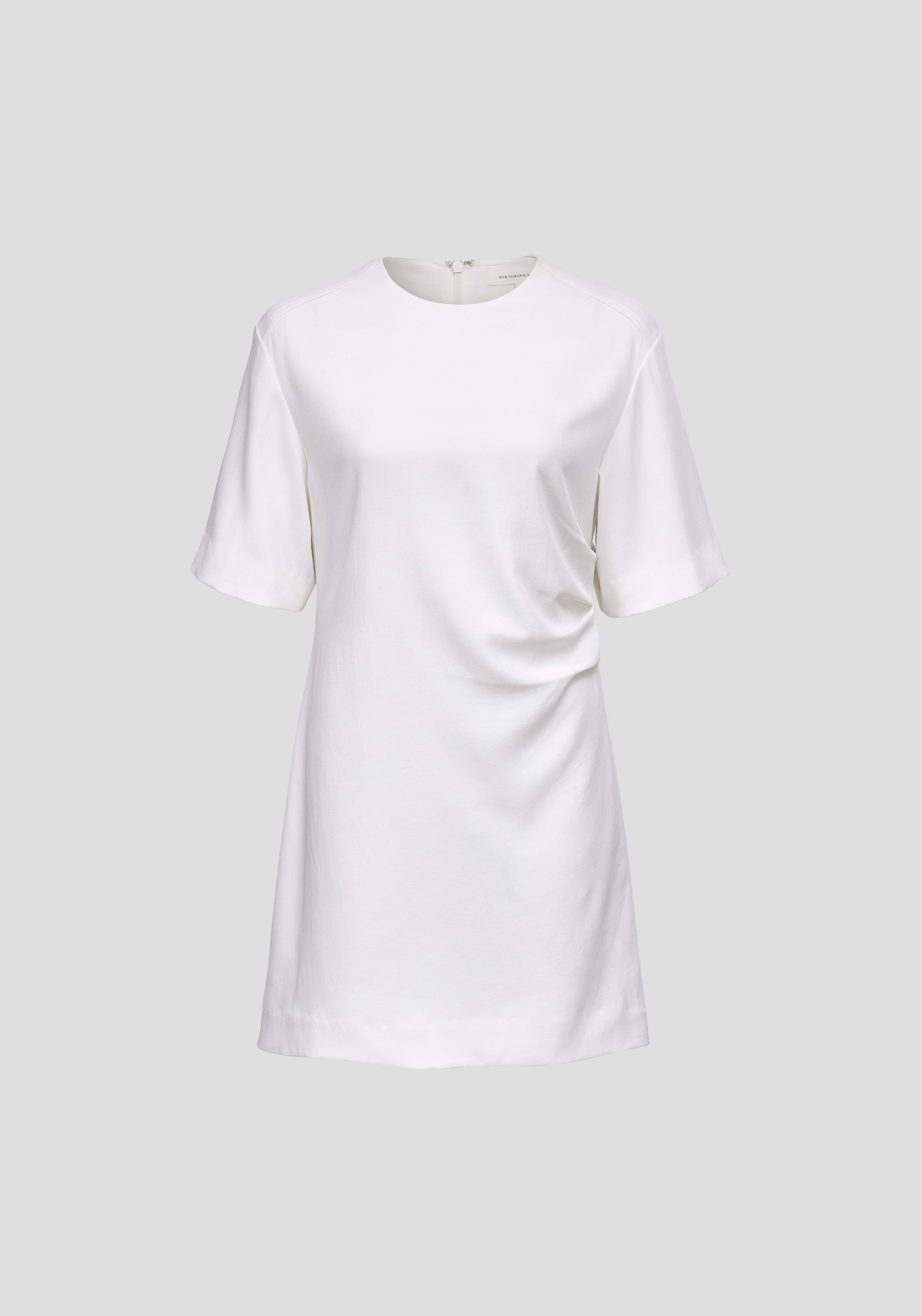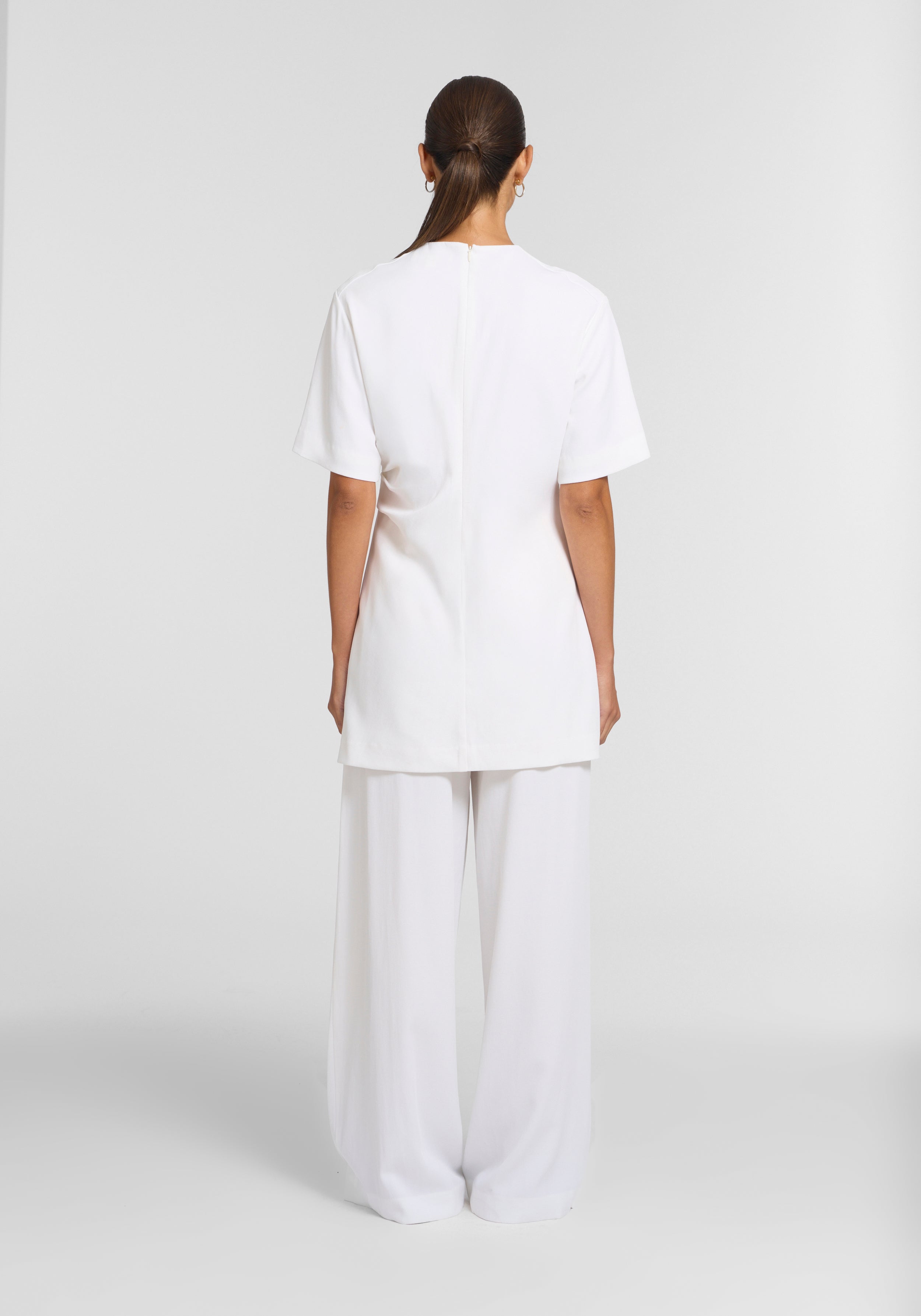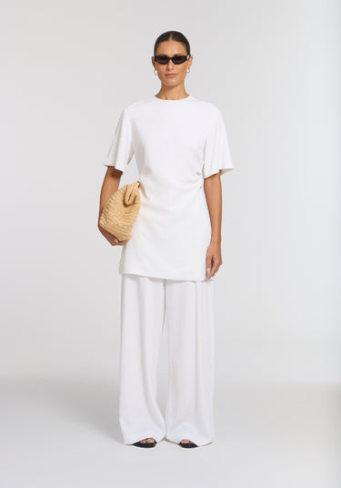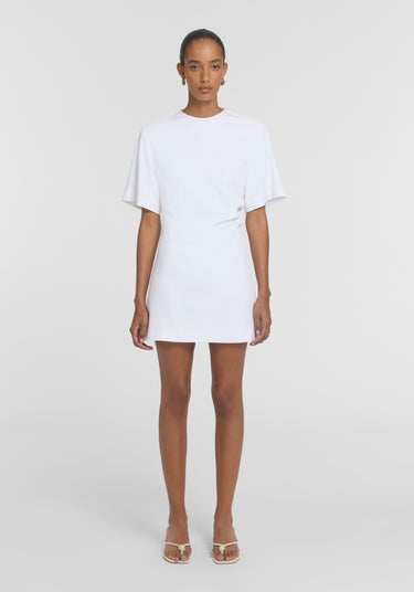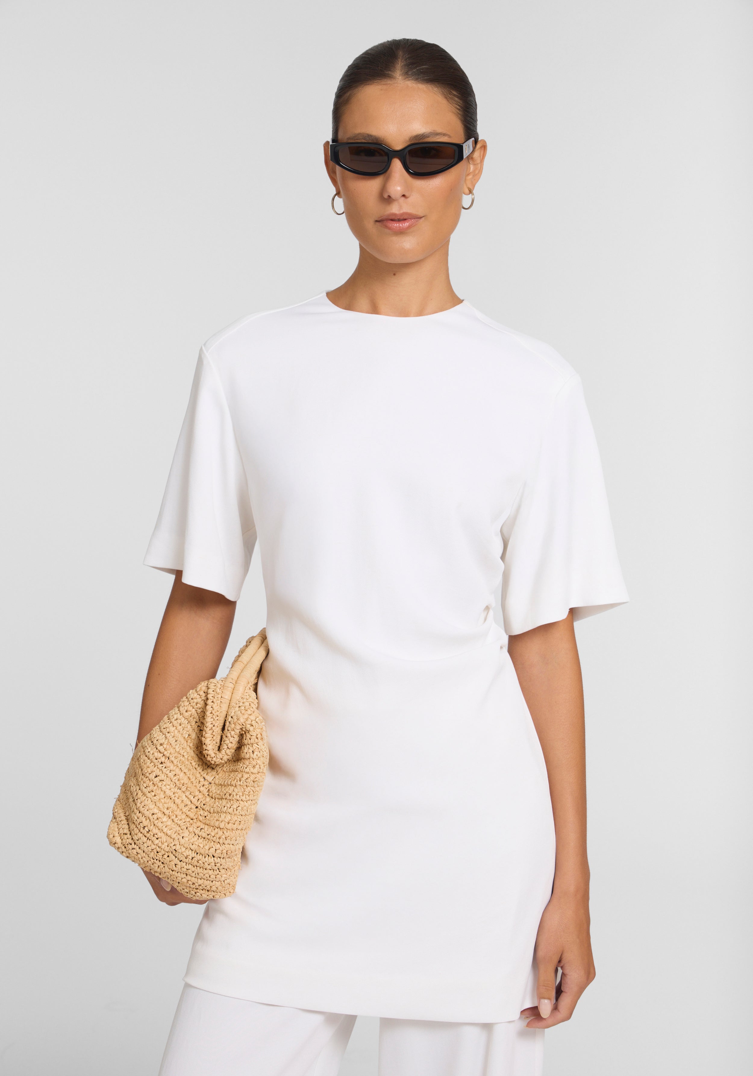 A hardworking essential, the Snowbird Mini Dress is meticulously woven from recycled plastics in crisp white. Its short-sleeve, mini silhouette is defined by a subtle asymmetric tuck at the waist for an air of architectural ease. Endlessly versatile, it can be worn alone or layered over the Fitzroy Pant, making it the perfect travel companion for any destination.