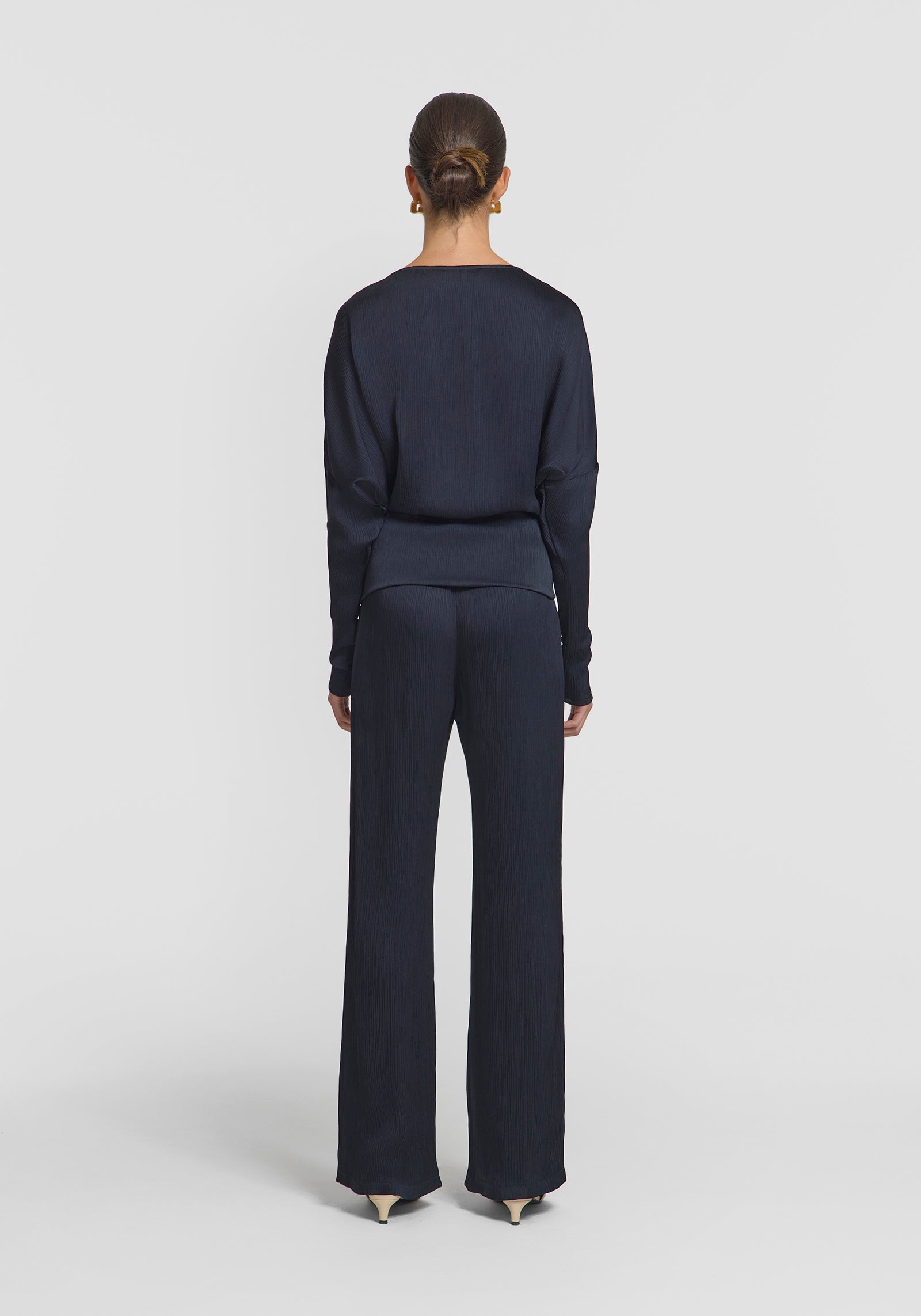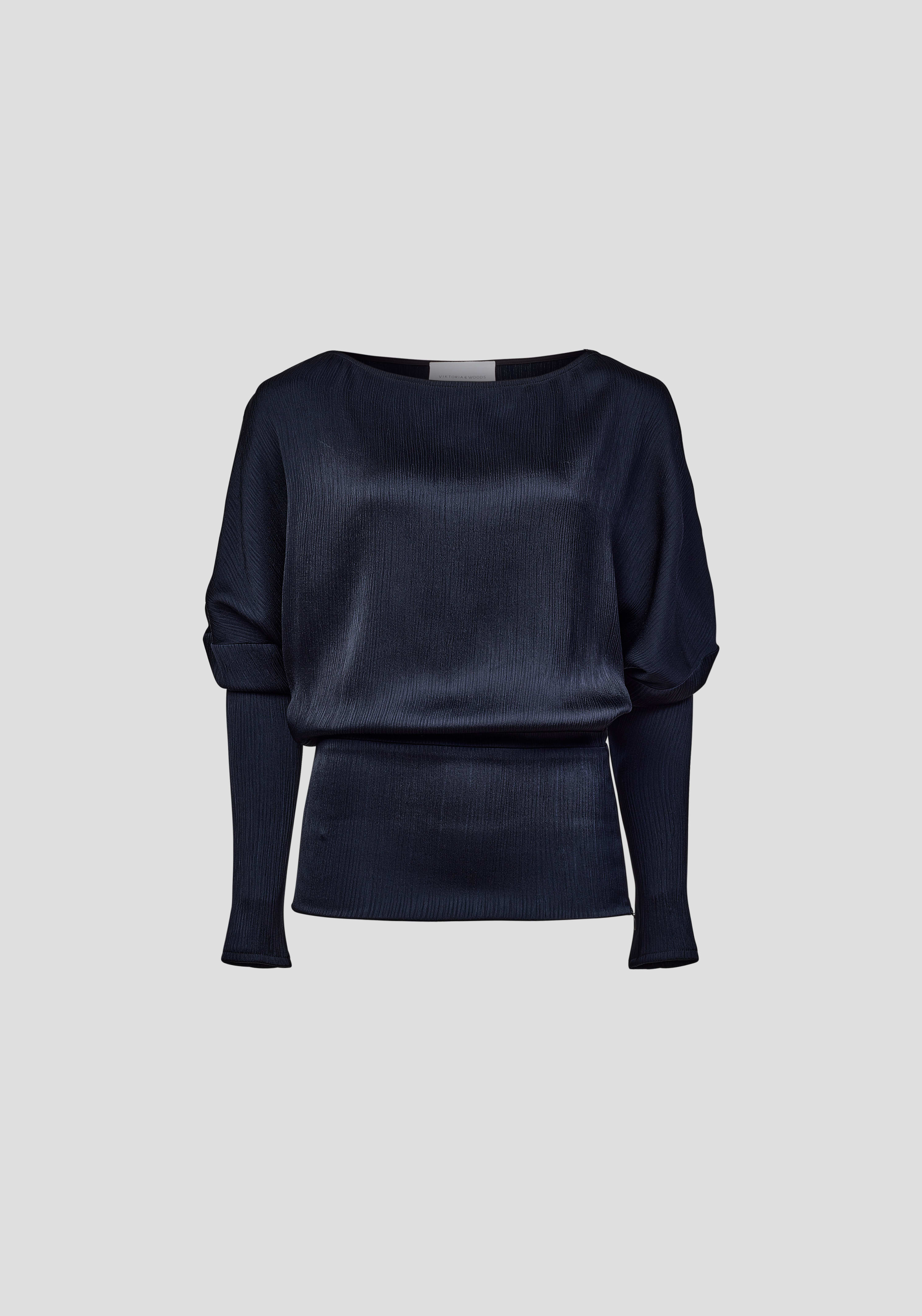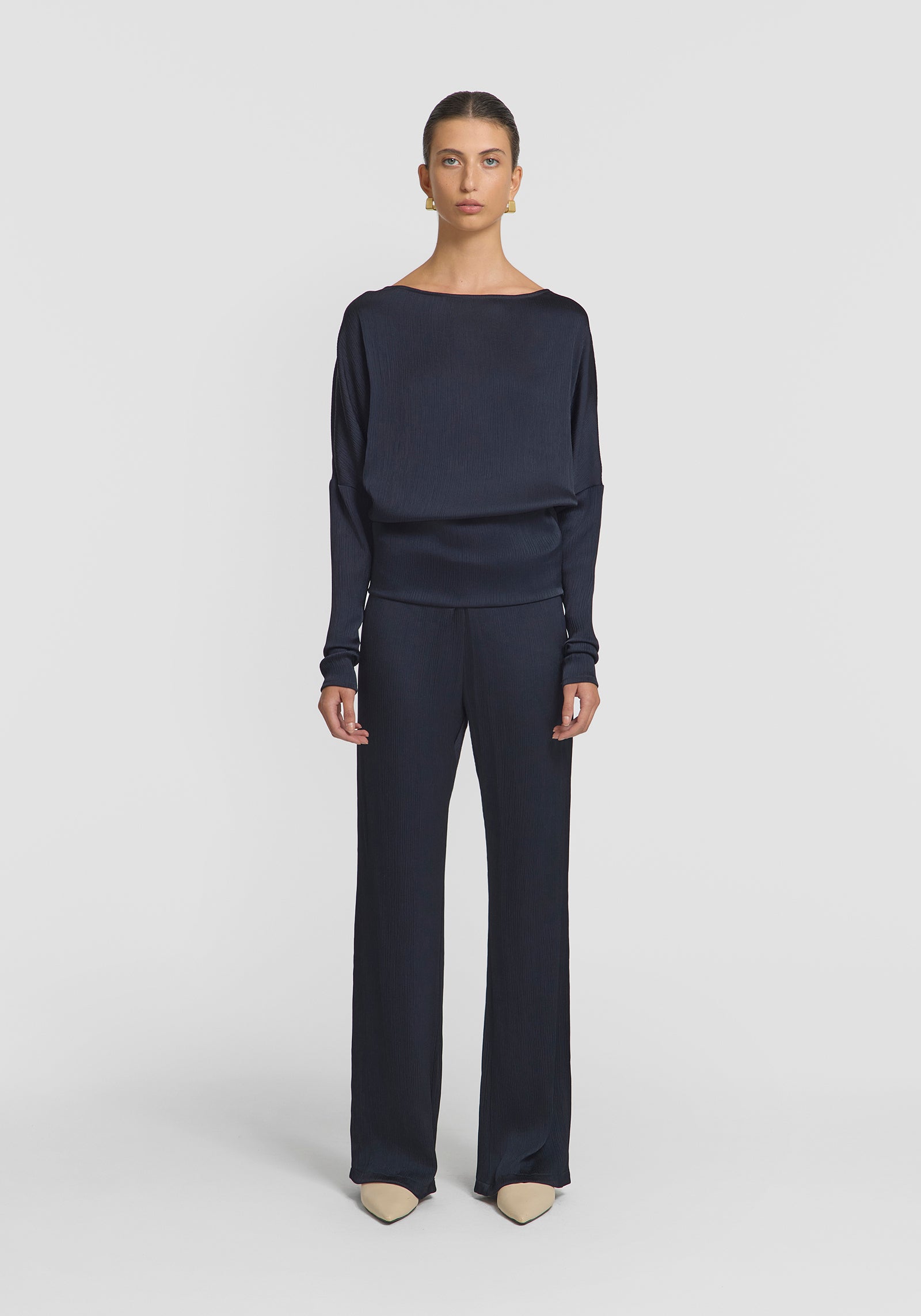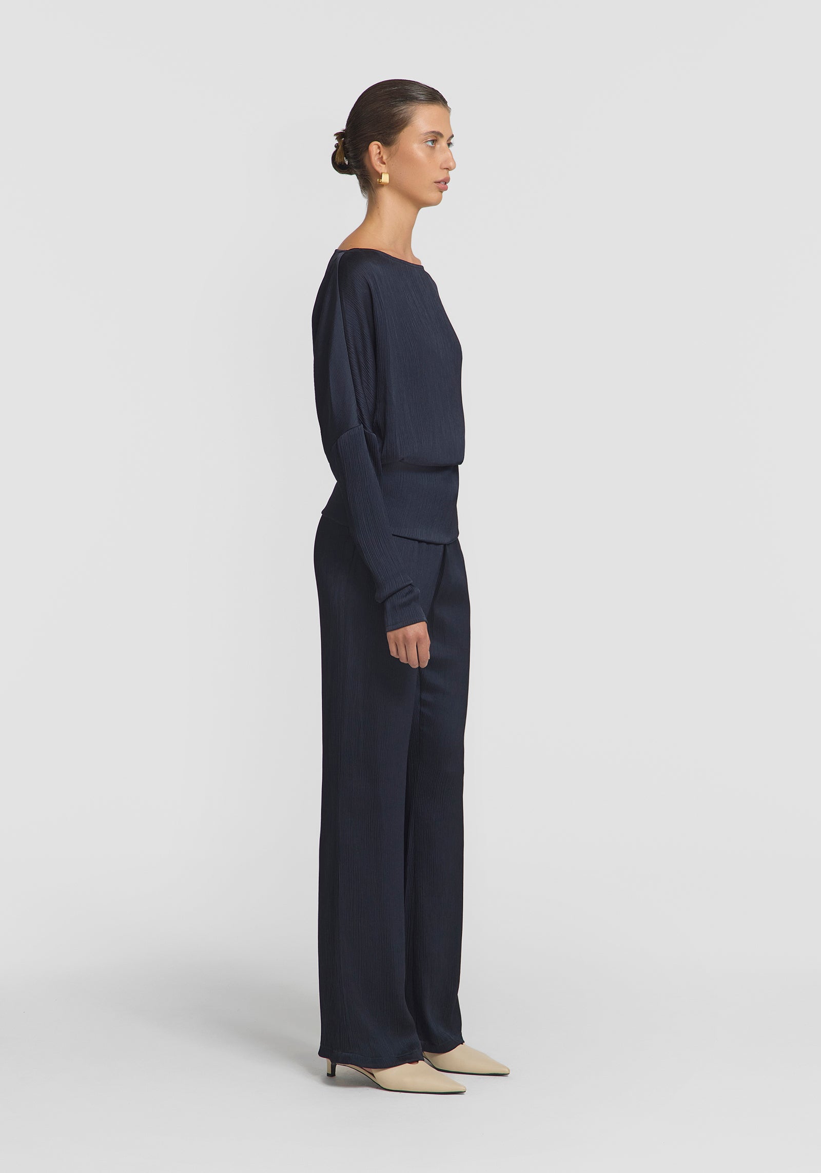 The Solomon Top embodies understated sophistication, crafted from softly pleated satin in a classic navy hue. Featuring a soft boat neckline, it’s fitted through the waist and sleeves, offering a flattering, feminine silhouette. For a set dressing moment, complete the look with the Turner Pant, or pair with black or denim for effortless sophistication.