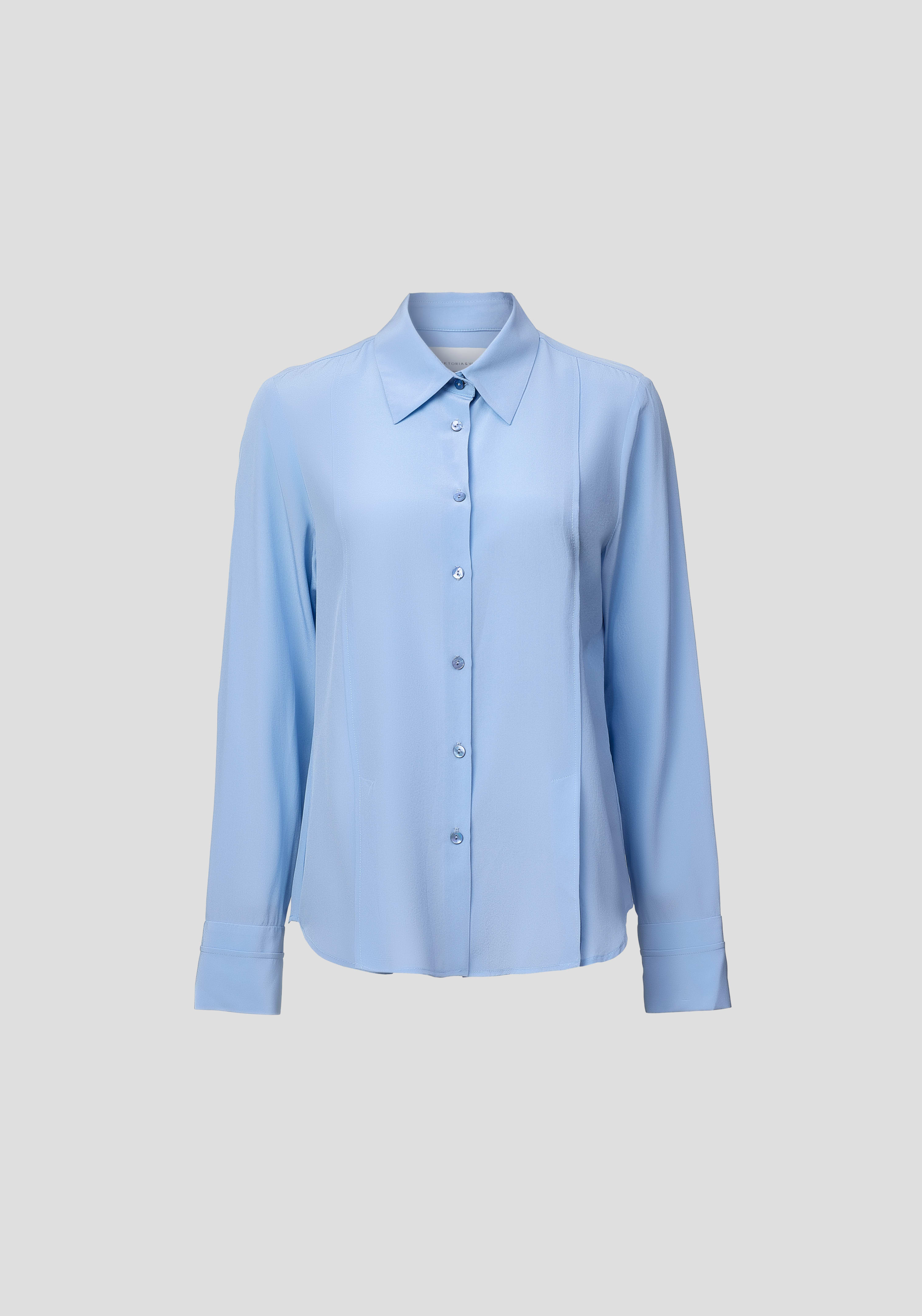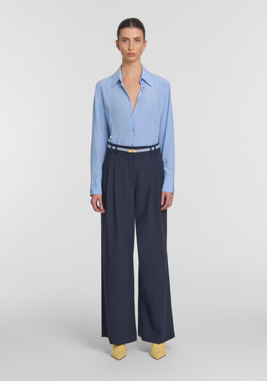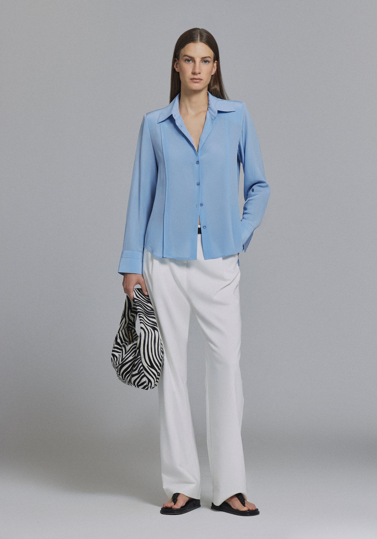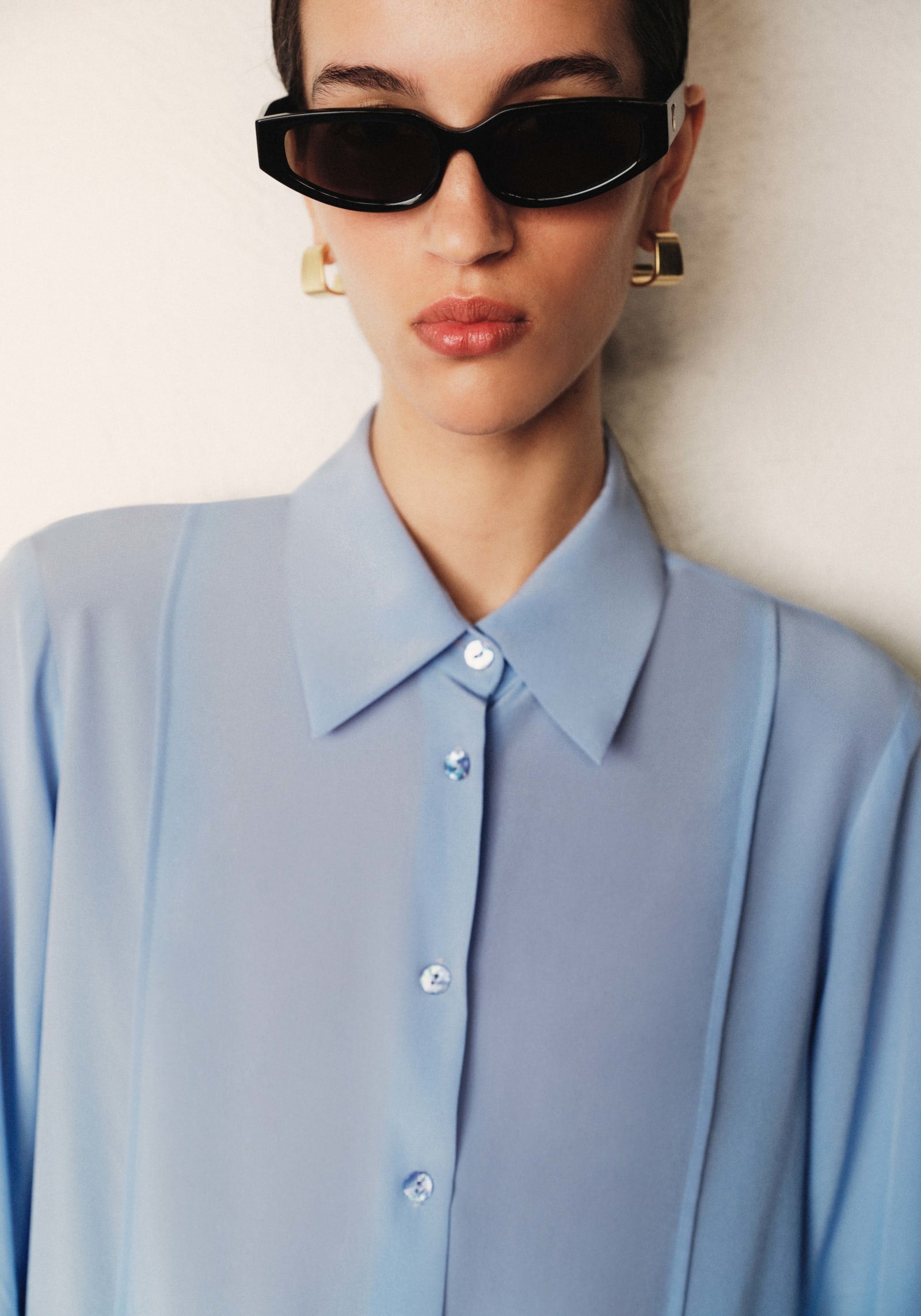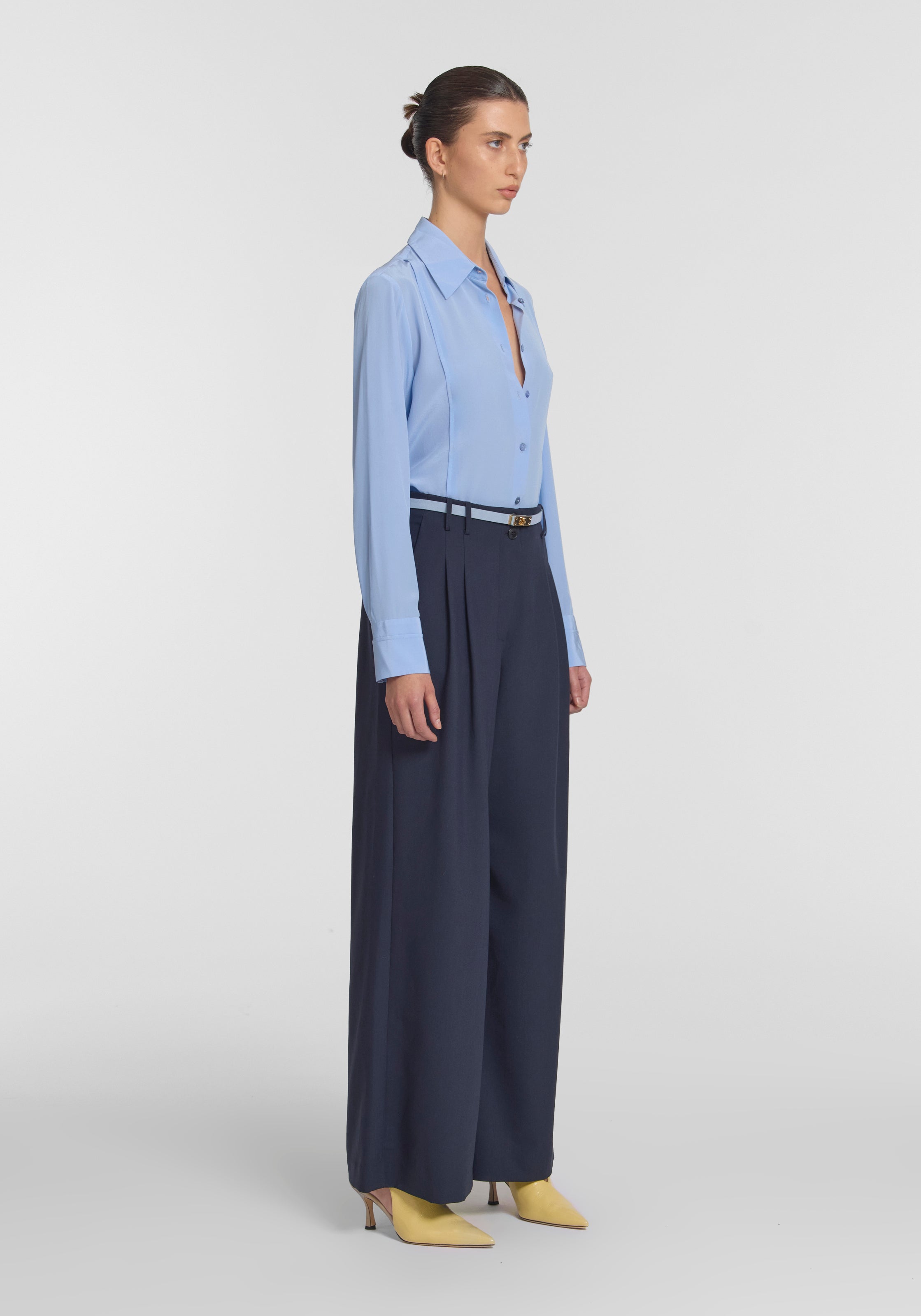 The feminine Solstice Shirt, crafted from silk in a coastal blue hue, features traditional shirt detailing, natural shell buttons, and delicate pin-tuck accents. With a relaxed silhouette that falls into vents at both the front and back, it offers effortless elegance. Pair with this season’s blue tailoring for a sophisticated play on tonal hues.