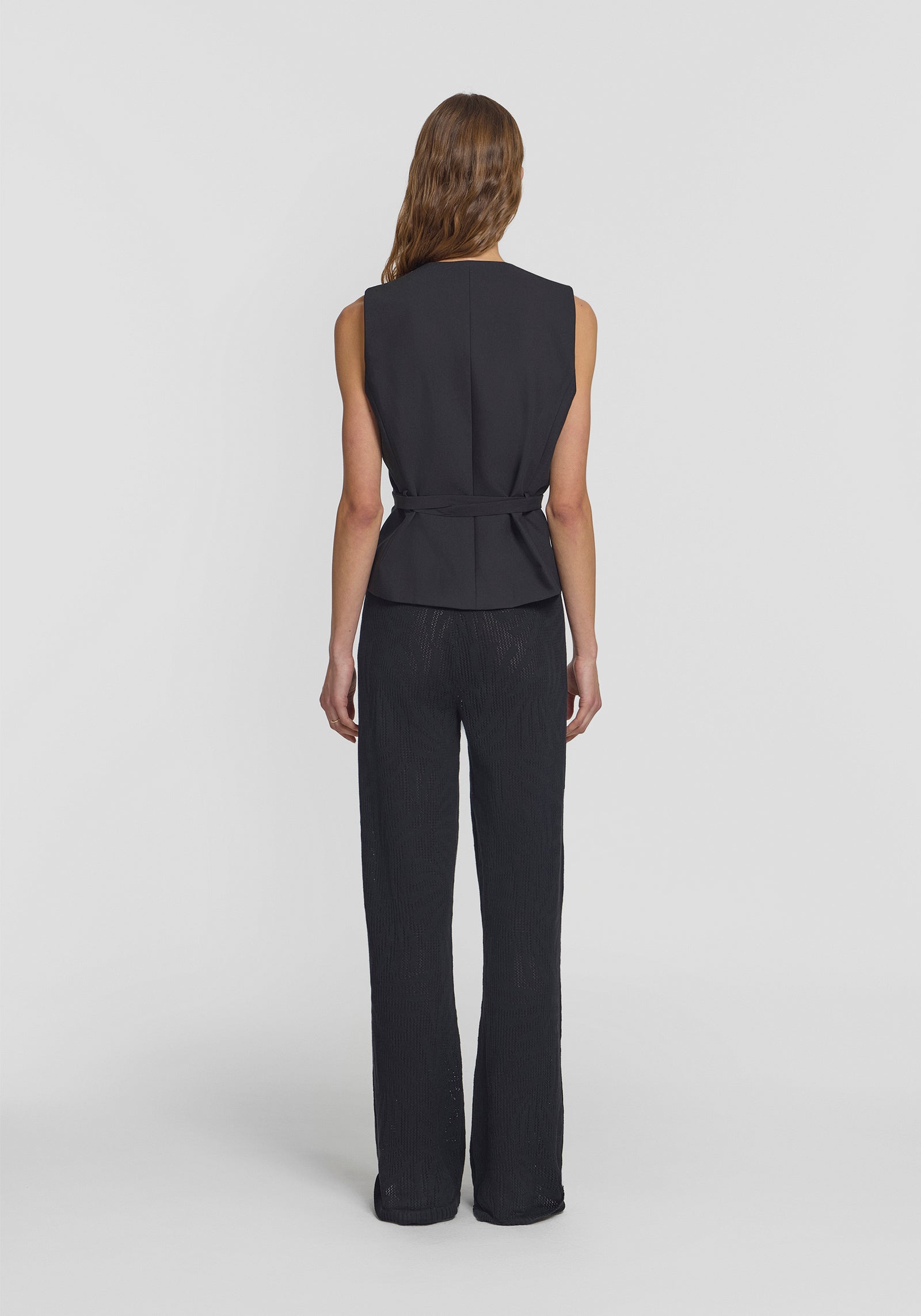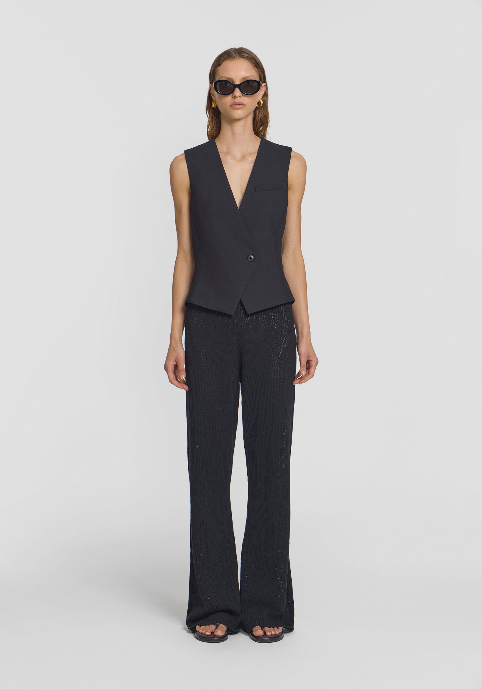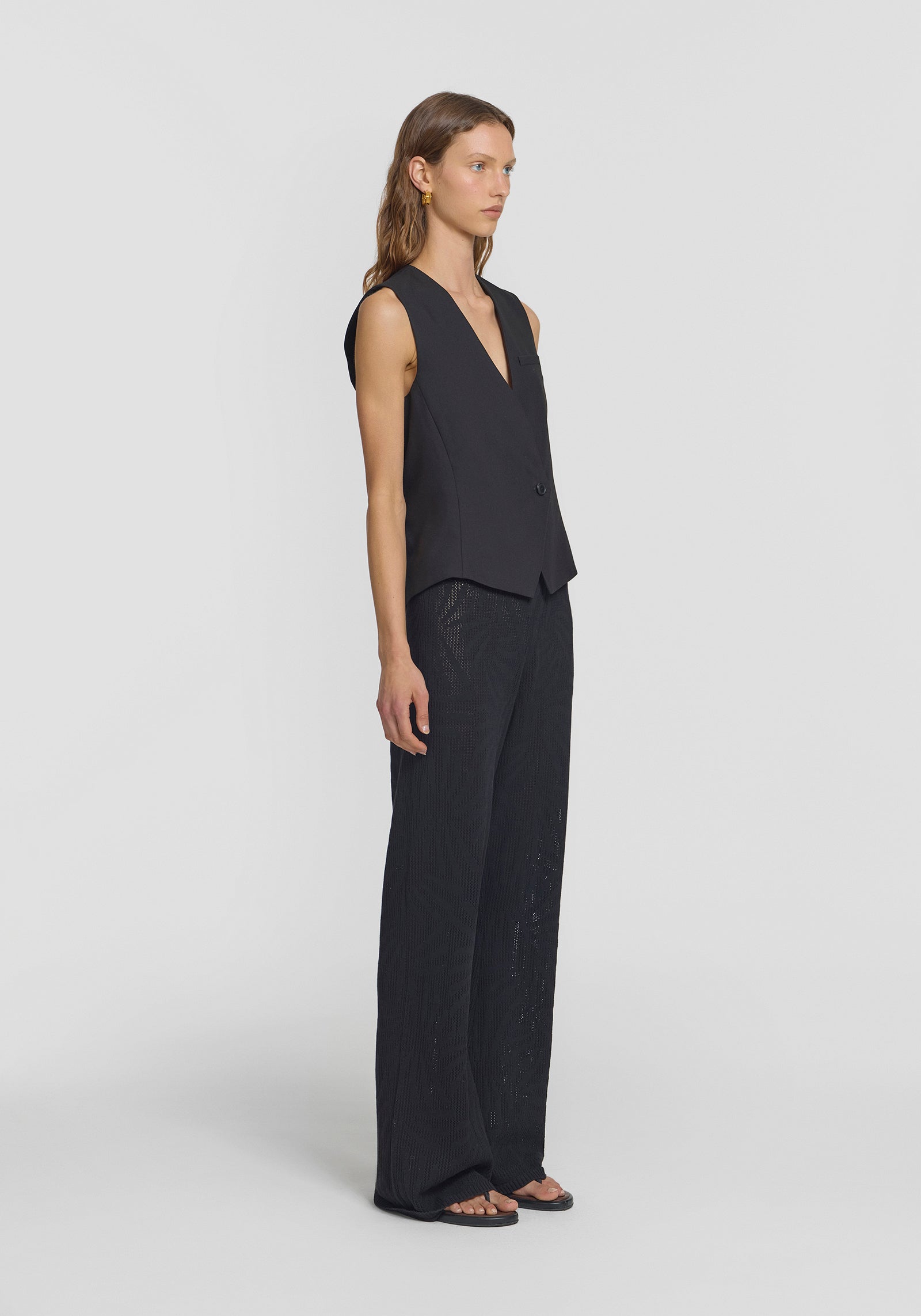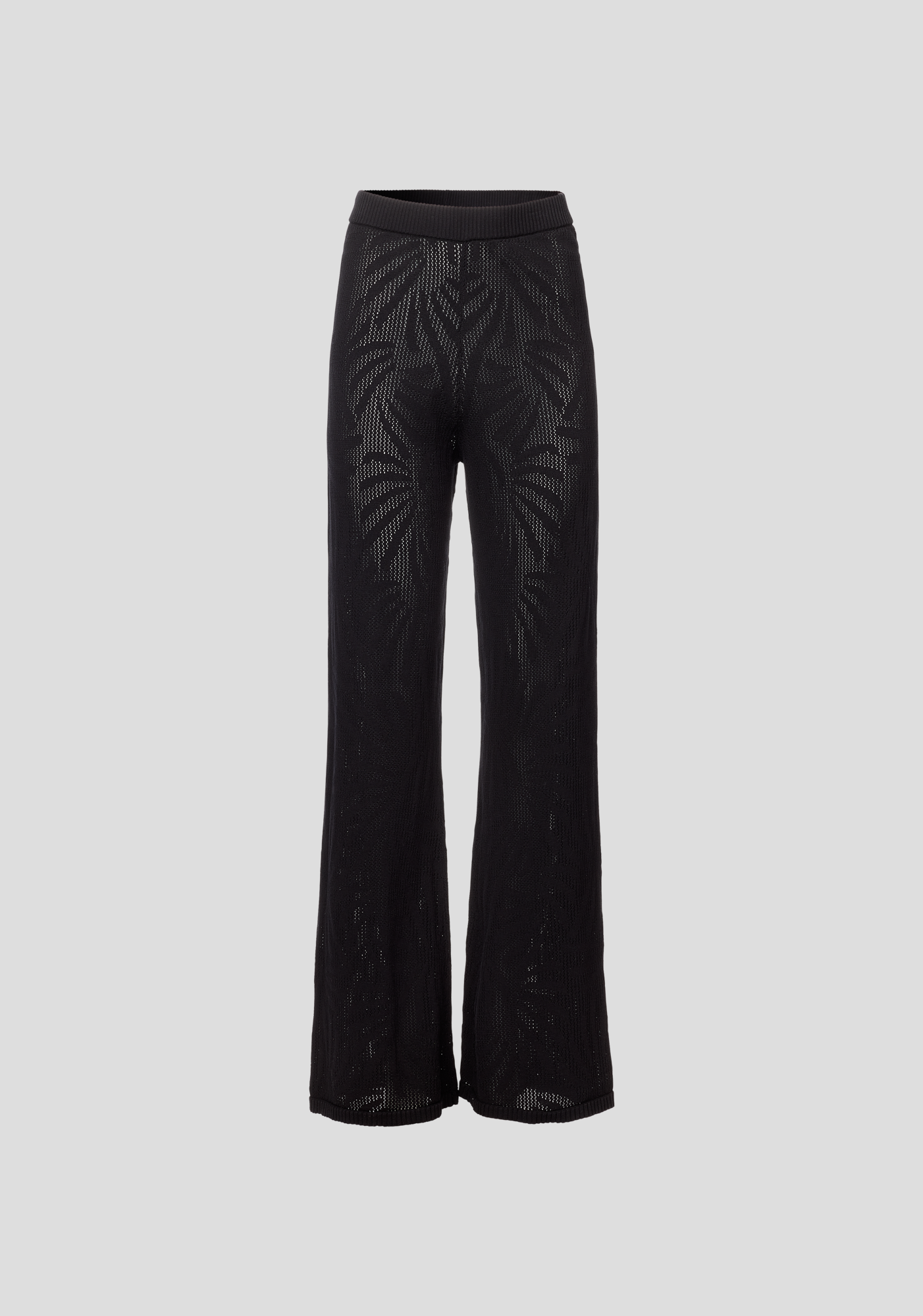 Embrace relaxed ease with the Spain Pant, crafted from organic black cotton and delicately adorned with abstract palm leaf motifs. This fully fashioned knit pant offers an unlined, sheer finish, complemented by a ribbed waistband and a flowing palazzo leg profile. An essential this season, pair it effortlessly with the Valencia Shirt for a refined and effortless ensemble.