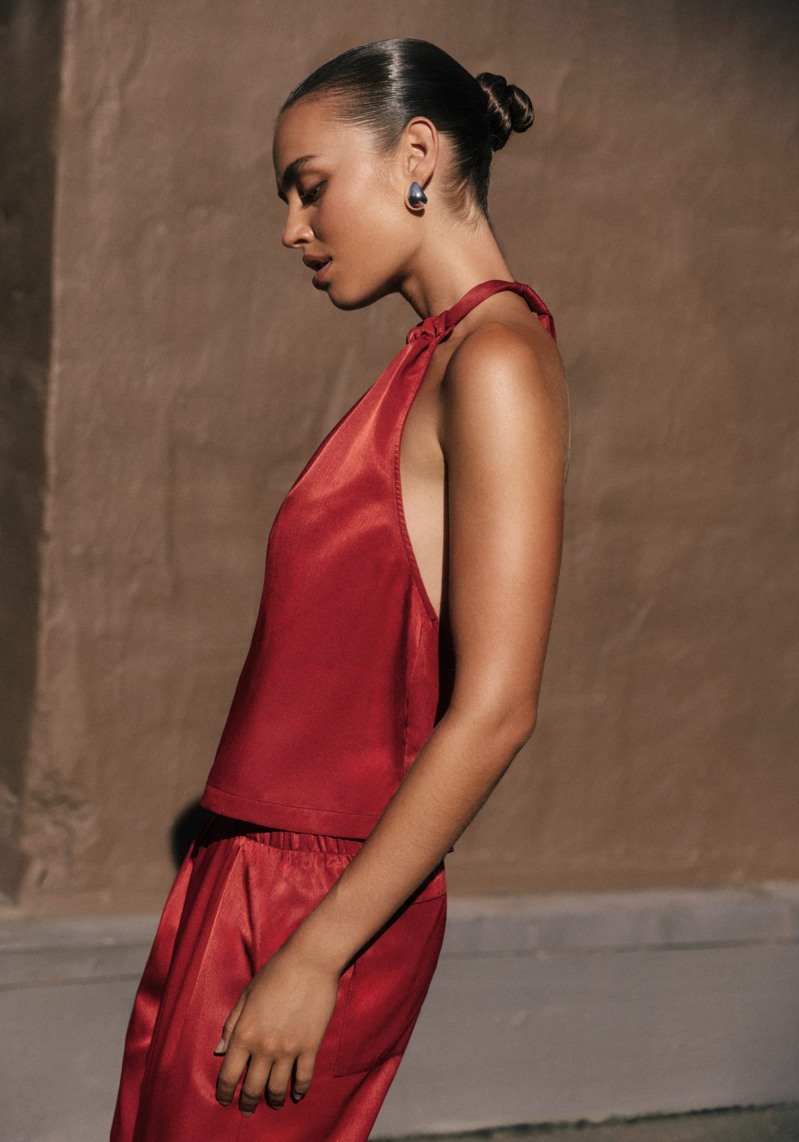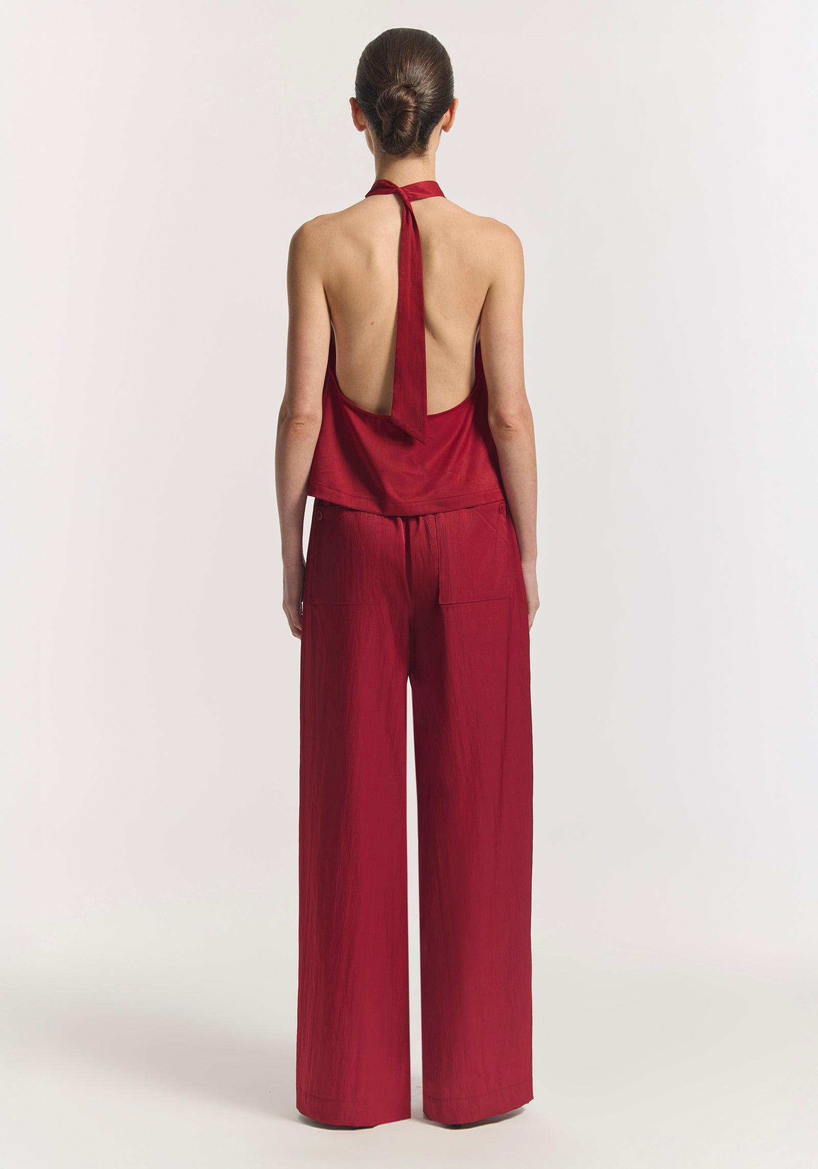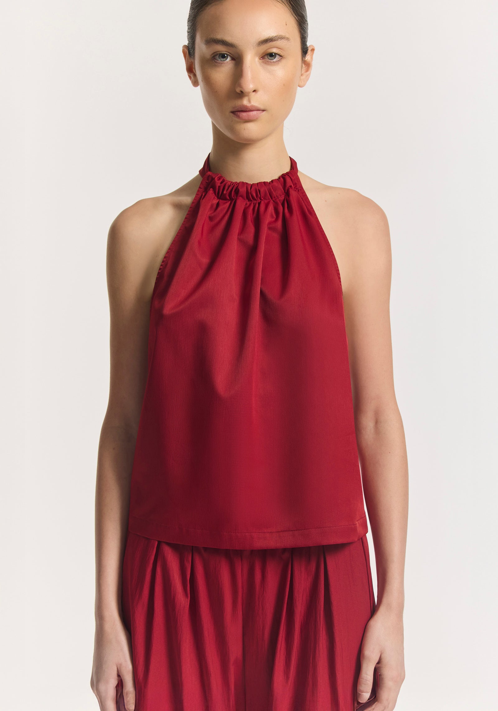 The architecturally bold Sparrow Top, crafted in a lightweight, sport-infused fabrication in a vibrant scarlet hue. Featuring a halter neckline with an adjustable tie, soft gathers, and a low scoop back, it delivers a modern, captivating silhouette. Pair with the Madden Pant for polished athleticism, inspired by the sleek vernacular of trackside style.