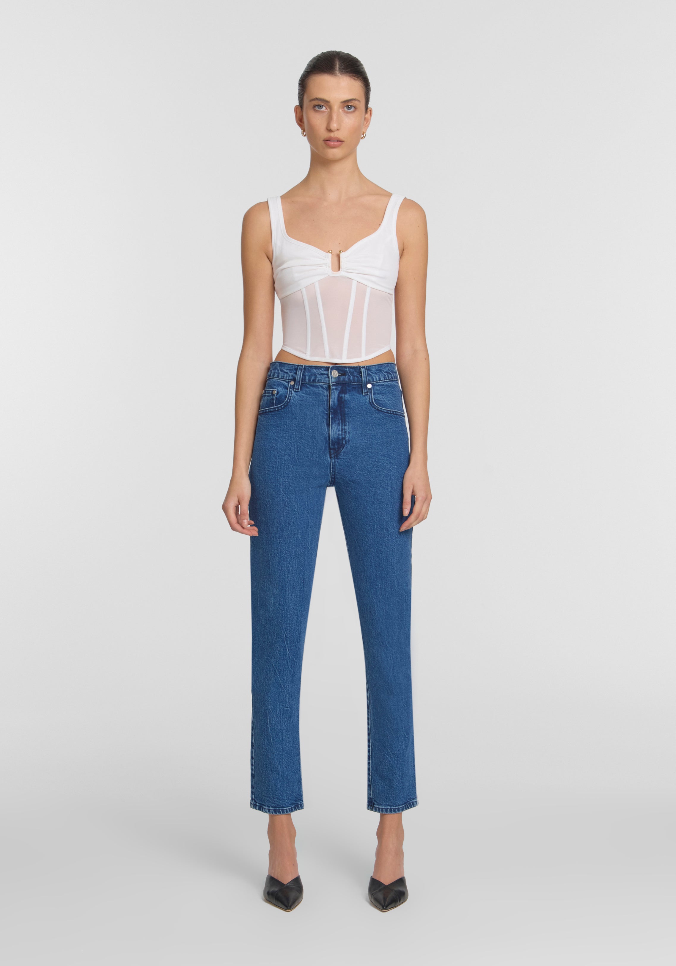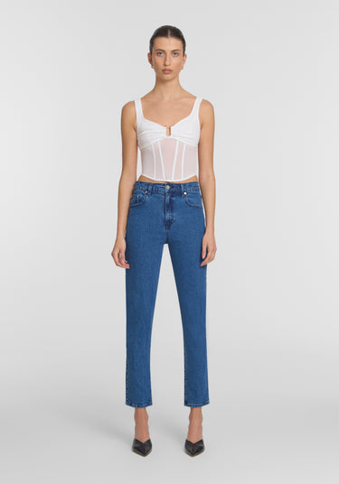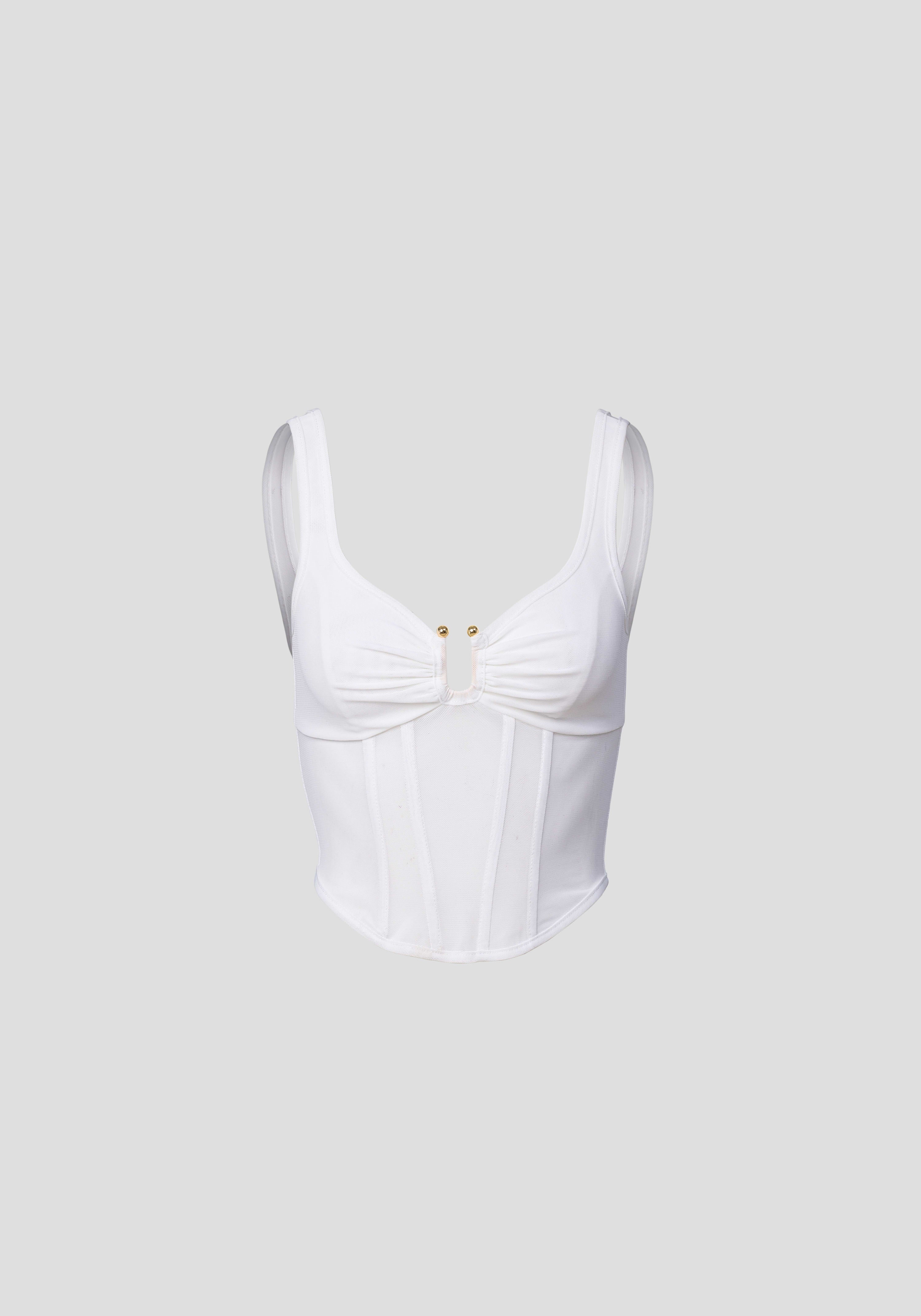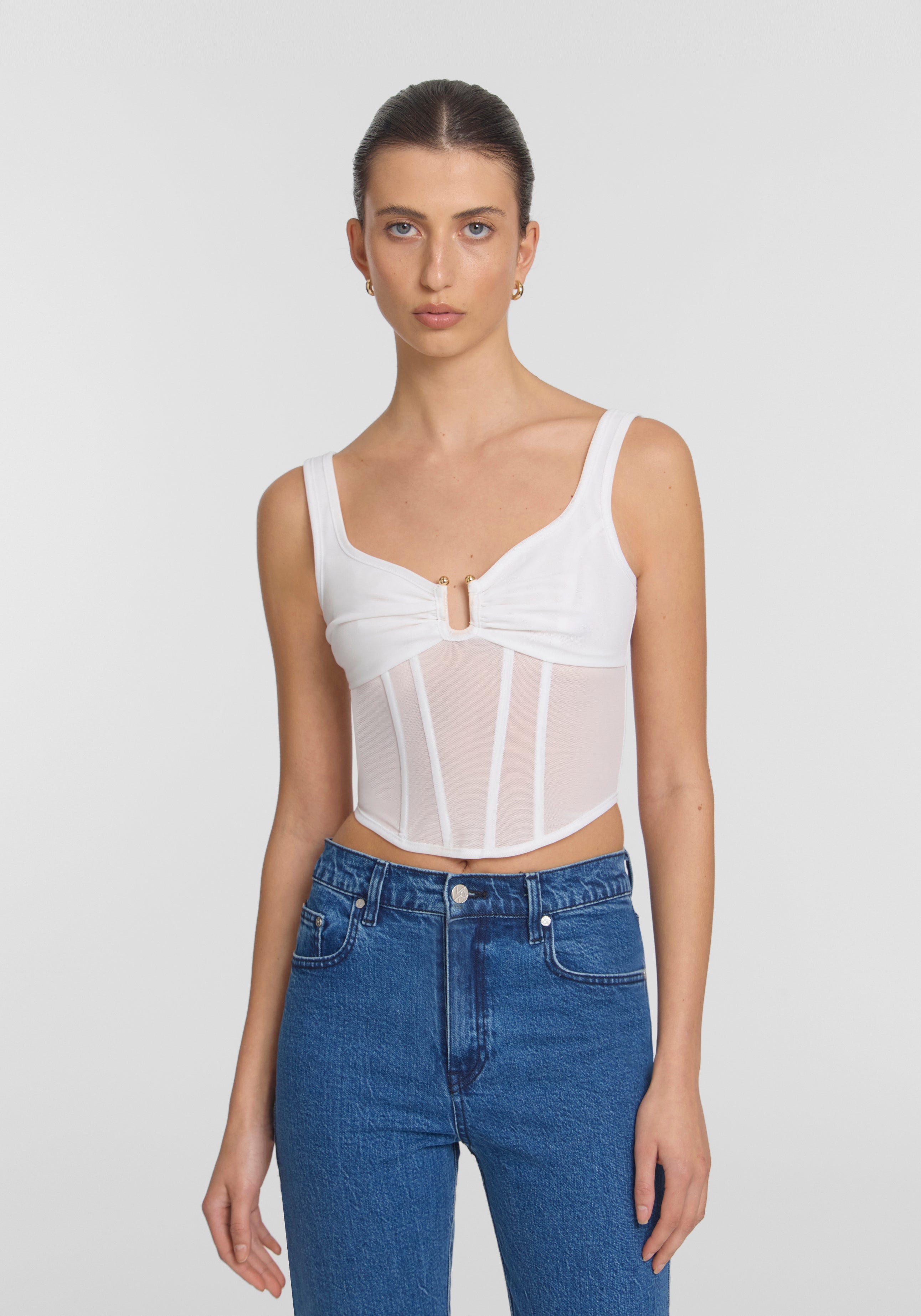 A V&W mainstay, the Spellbound Bustier extends the powermesh narrative in classic ivory. Featuring a sweetheart neckline, panelled boning and metal stud detailing at the centre front, it marries femininity with edge - making it the perfect top for an event or night out.