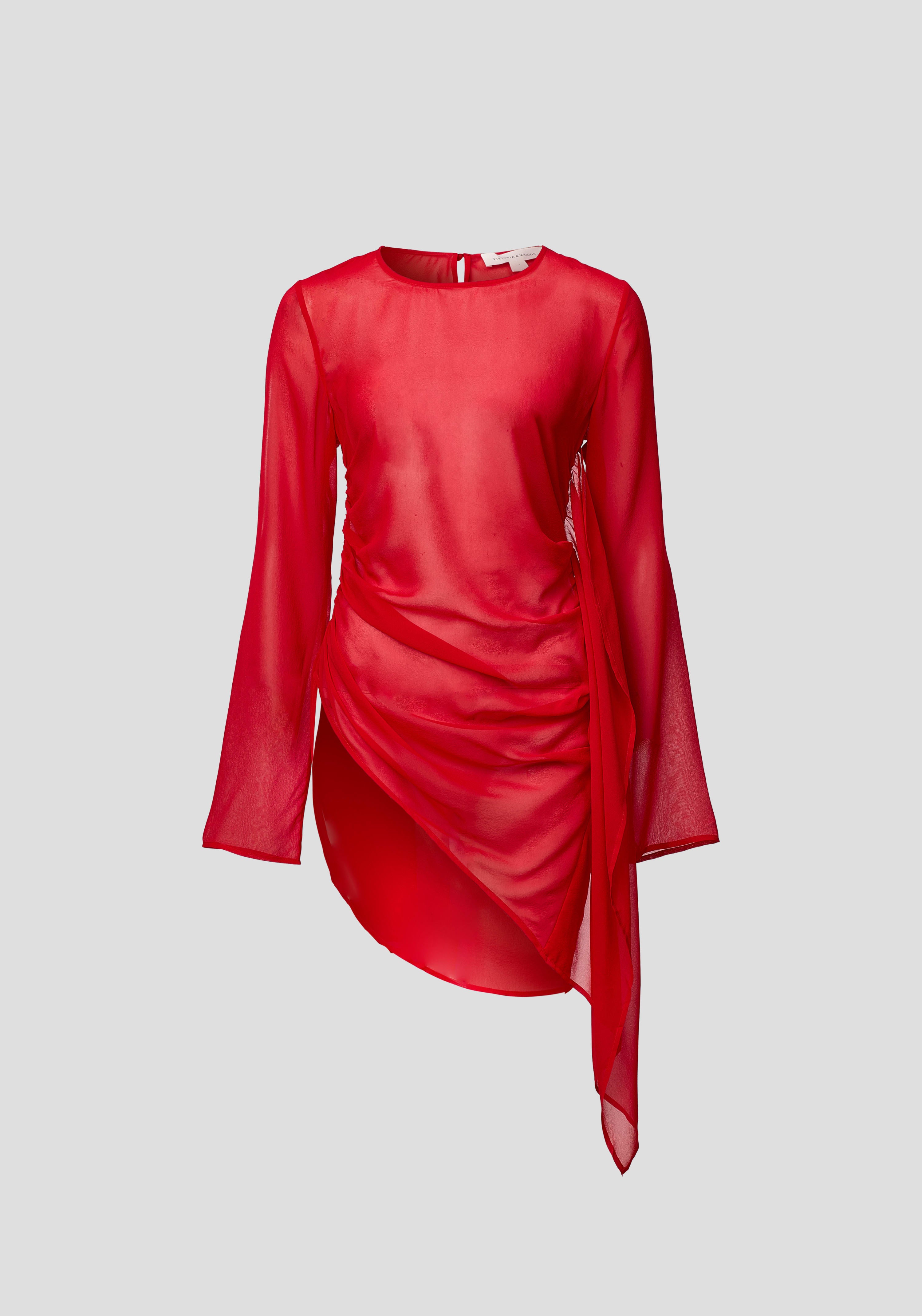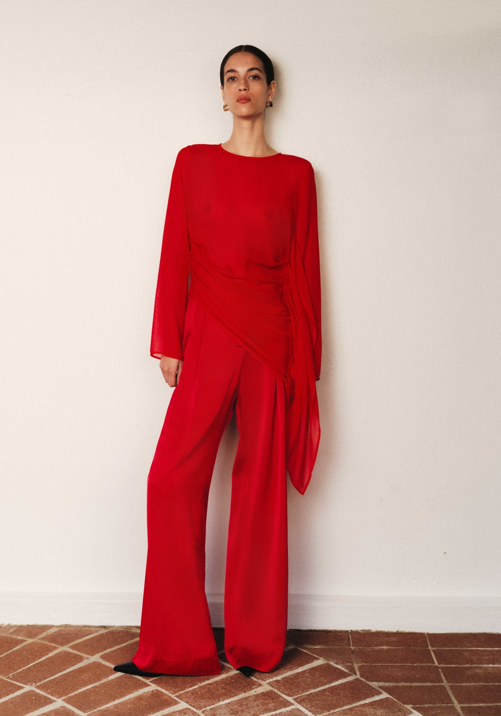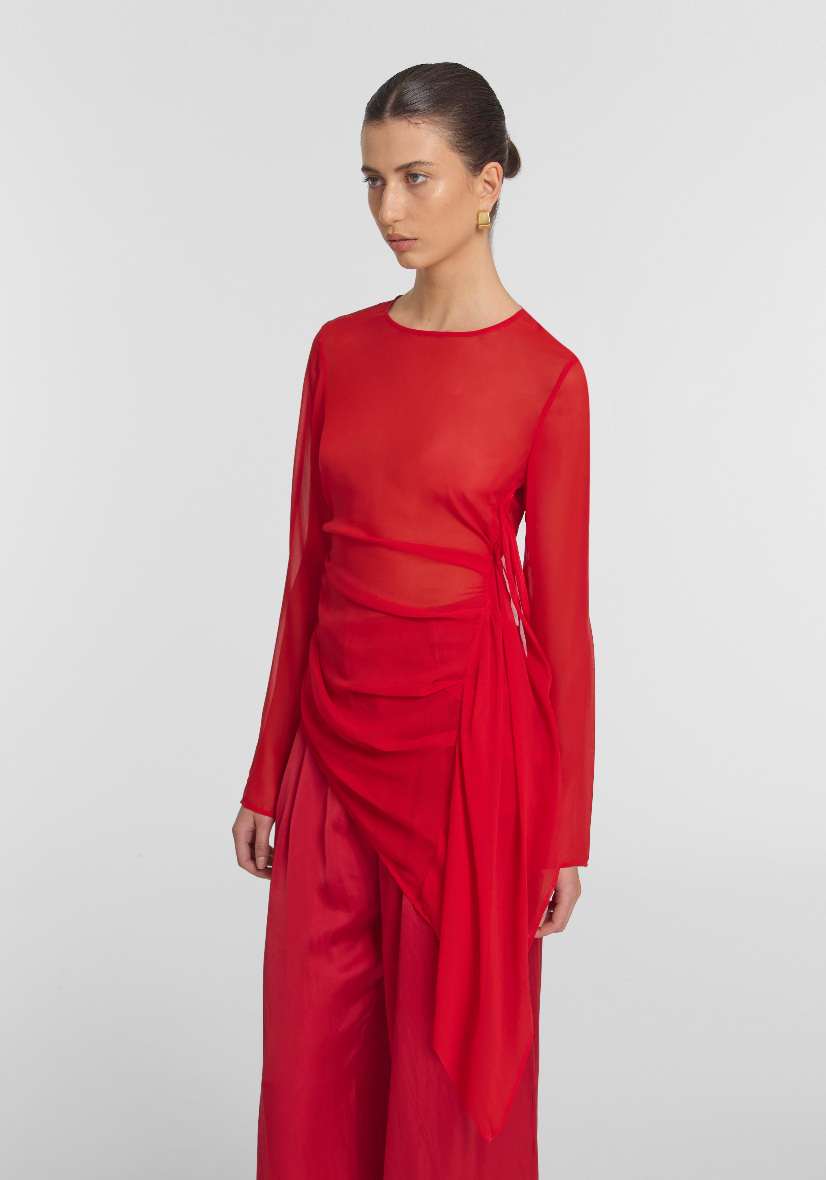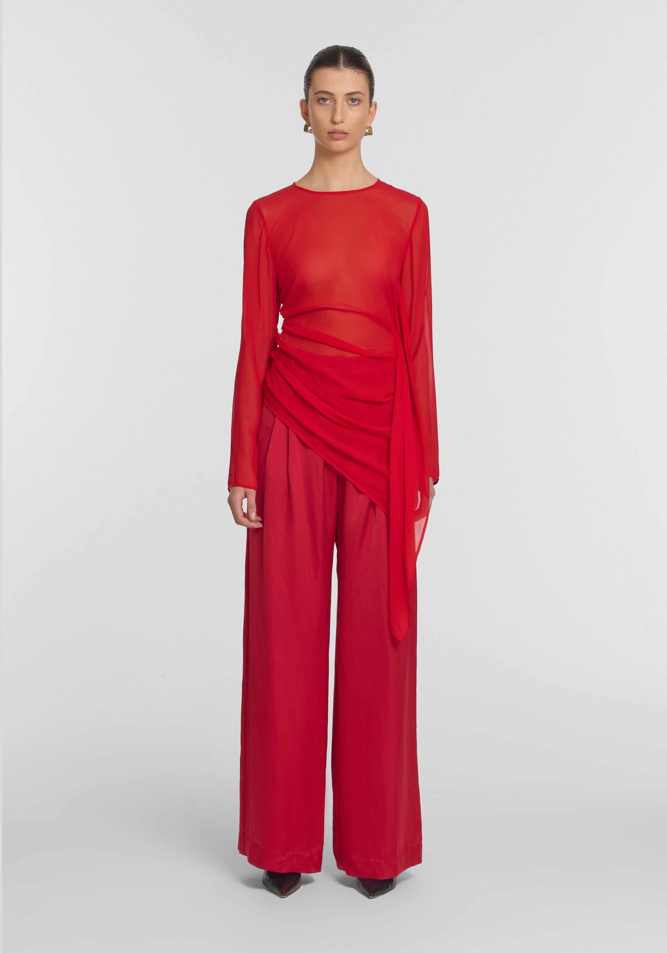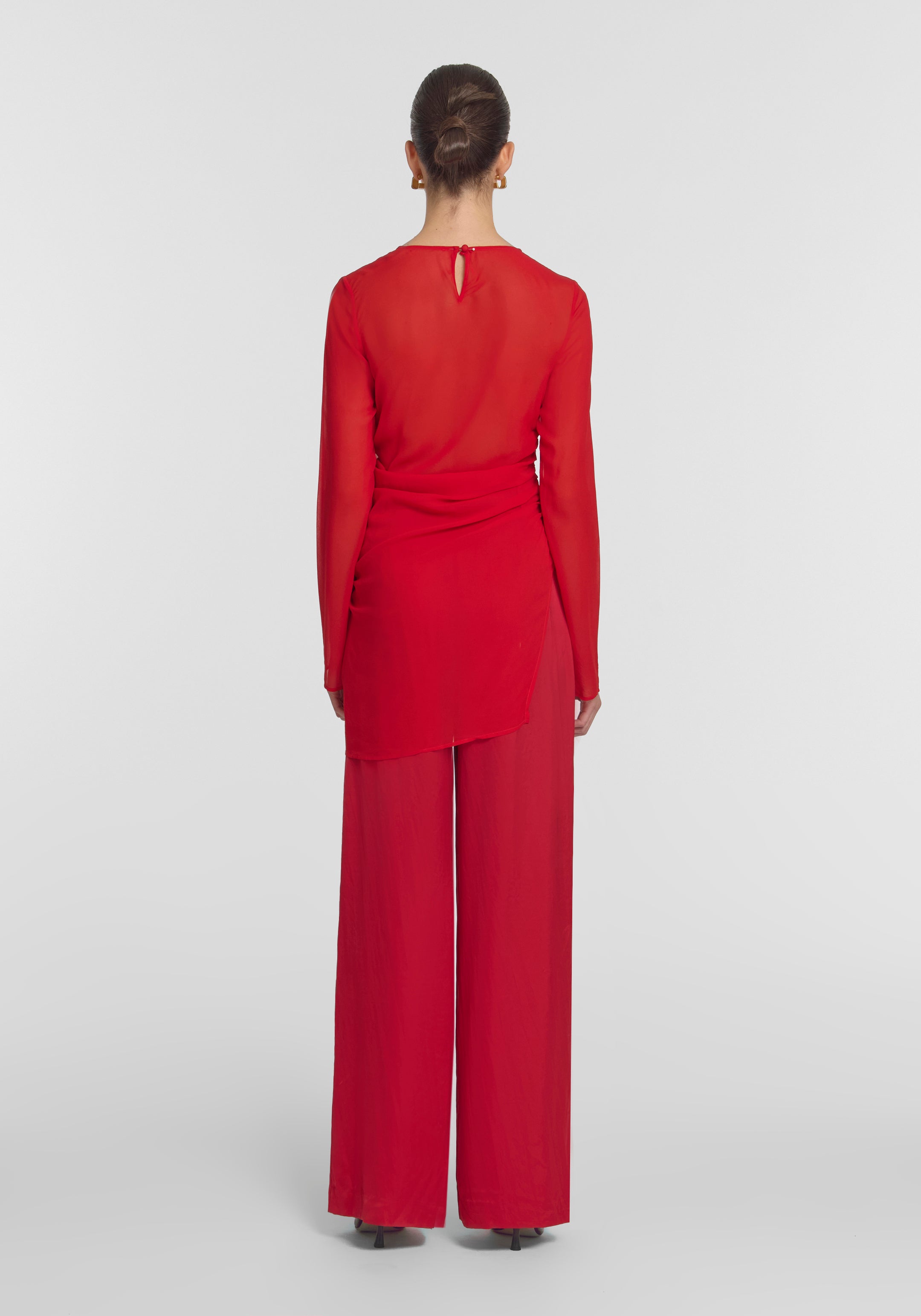 The Stardust Tunic Top captures dramatic elegance in lightweight, sheer silk georgette in a fiery sunset red hue. Tailored through the shoulders and sleeves, it features soft tucks and draping at the side seams, with an asymmetrical hem. Pair it with the Whirlwind Pant for a look that commands attention.
