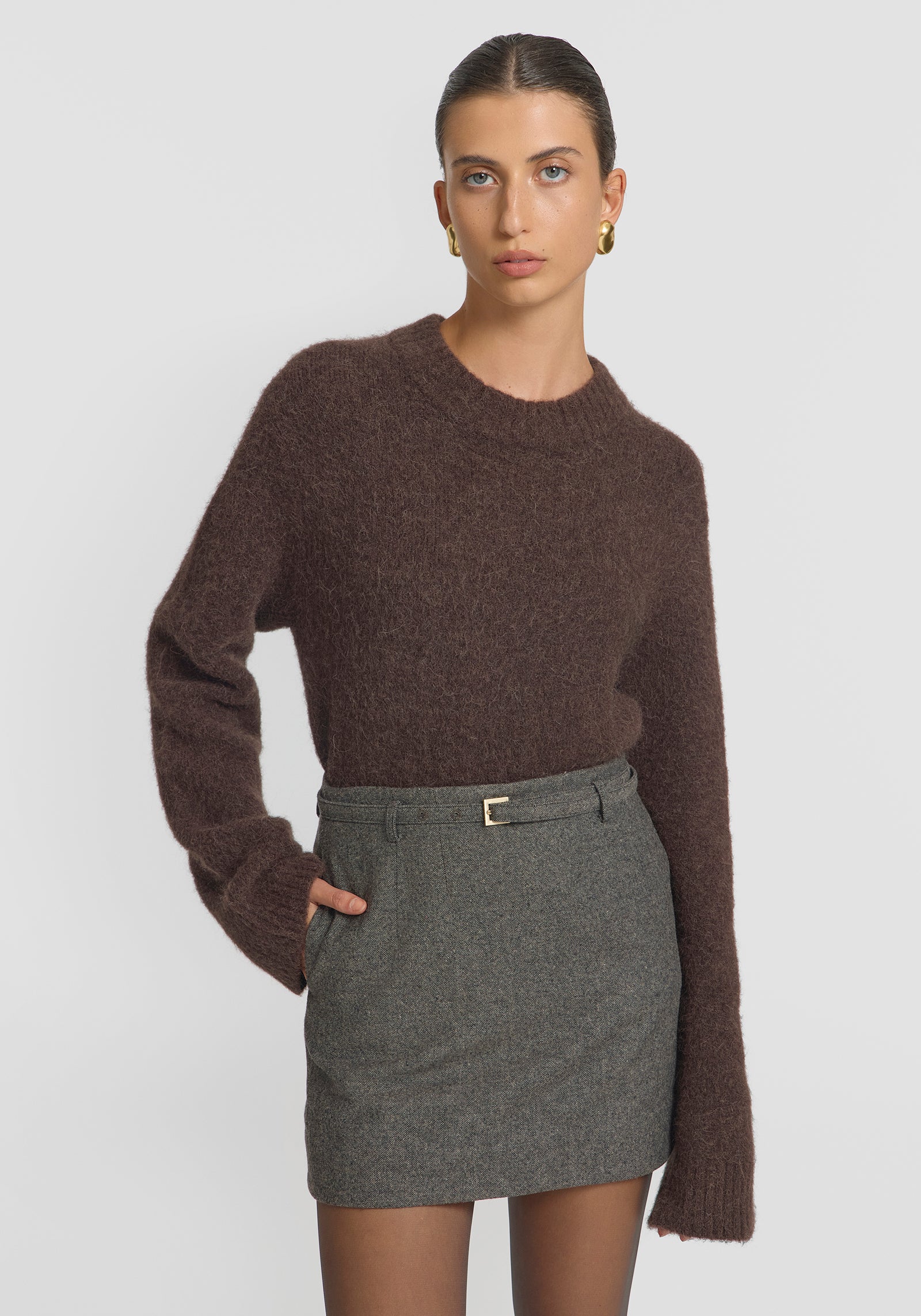Introducing the Sterling Skirt, the perfect winter mini skirt, luxuriously crafted from a textured brown wool blend tweed. Showcasing a mid-rise fit, grown-on waist, pockets, and delicate belt detailing, it exudes effortless elegance. Complete the look with the Timberlake Jacket, or pair with the Winnipeg Knit or Alberta Knit Top for a chic blend of brown hues.