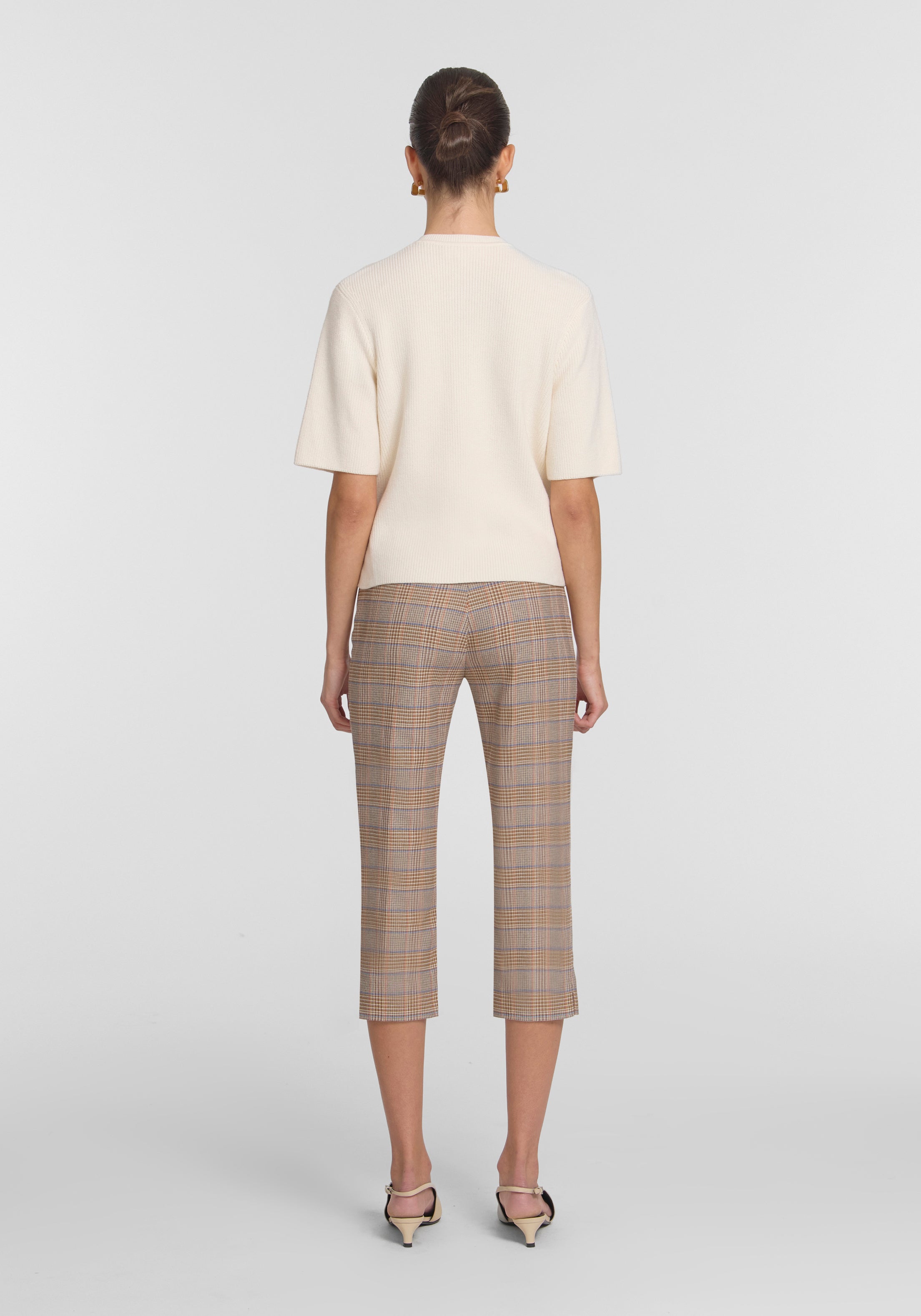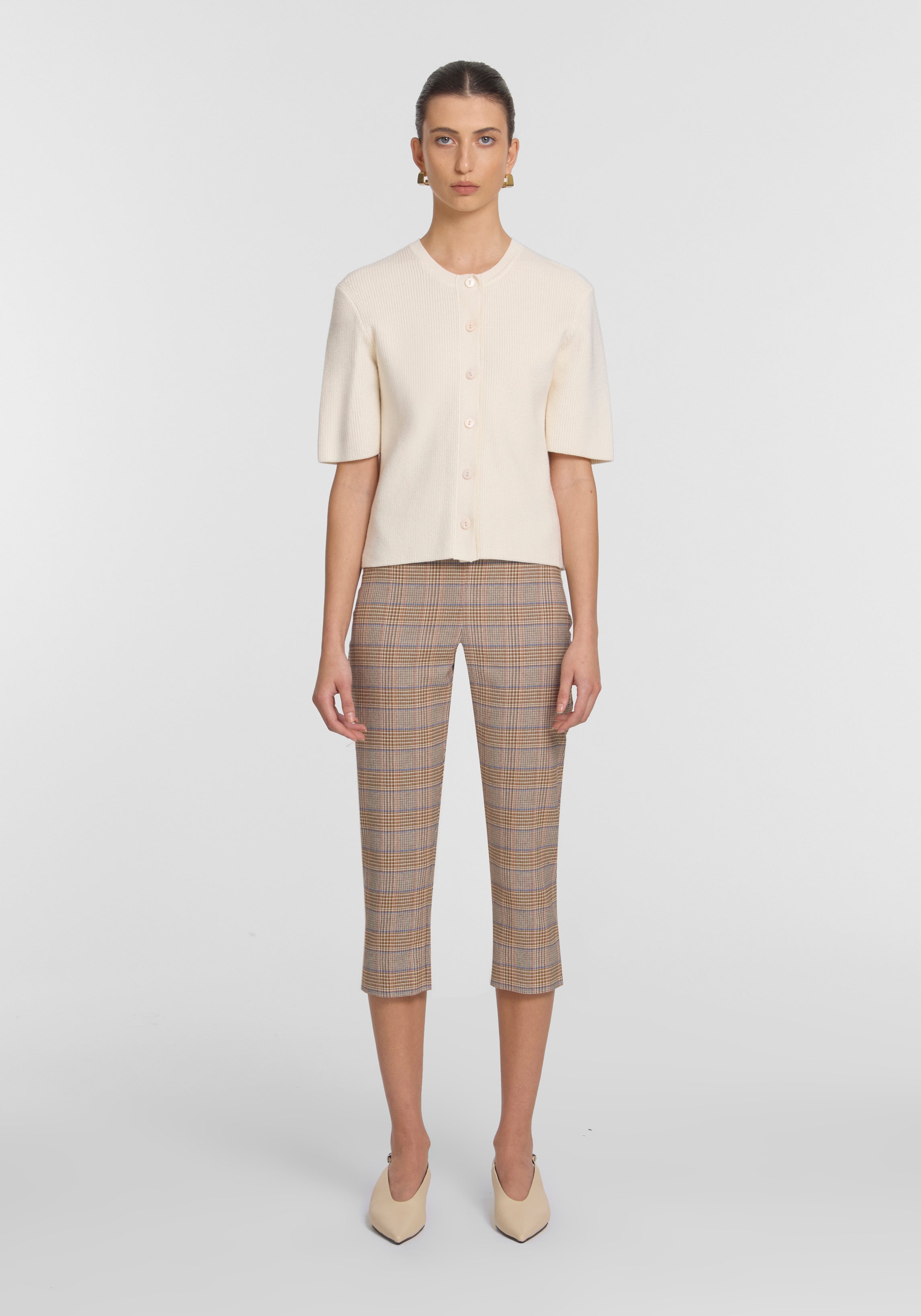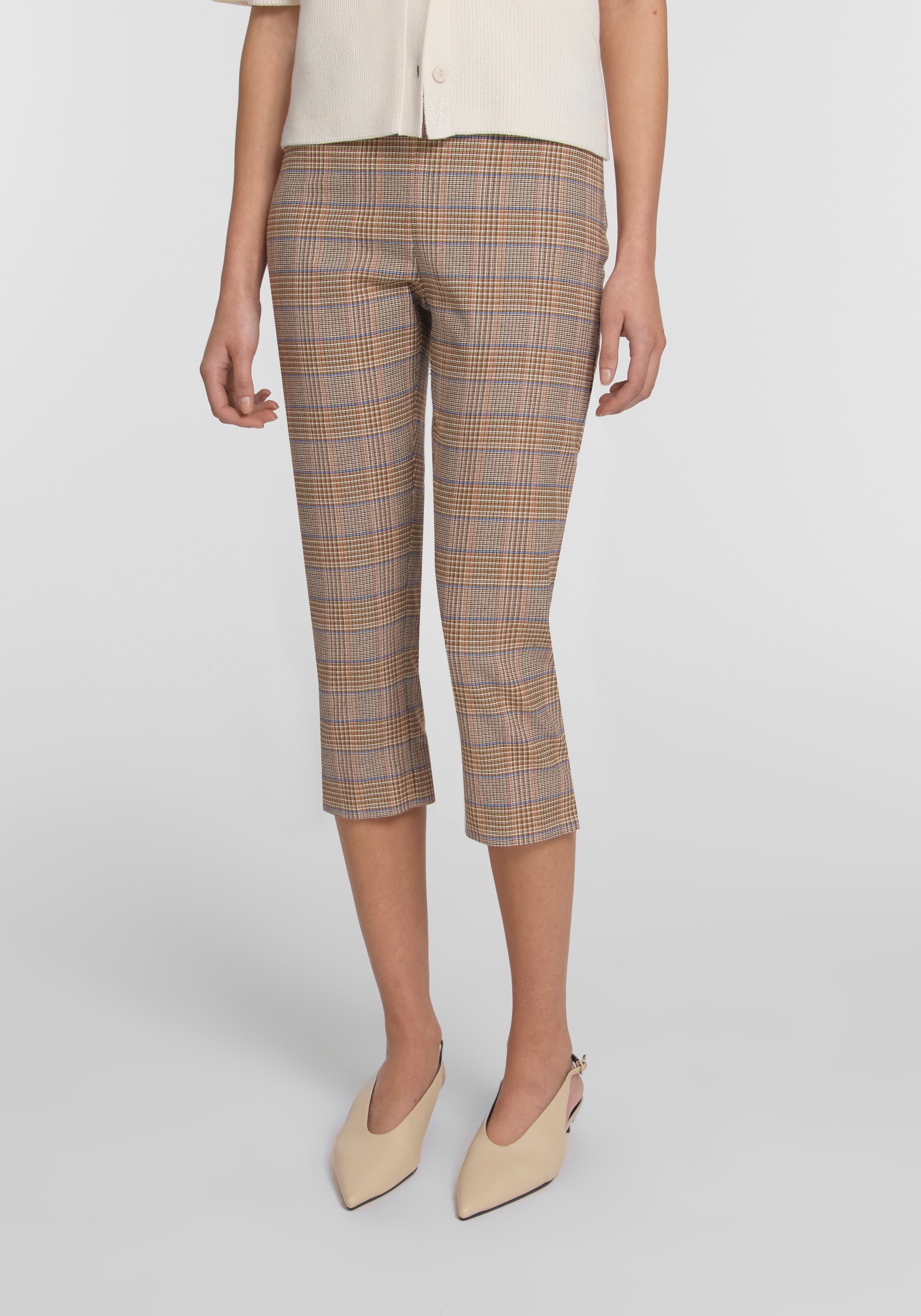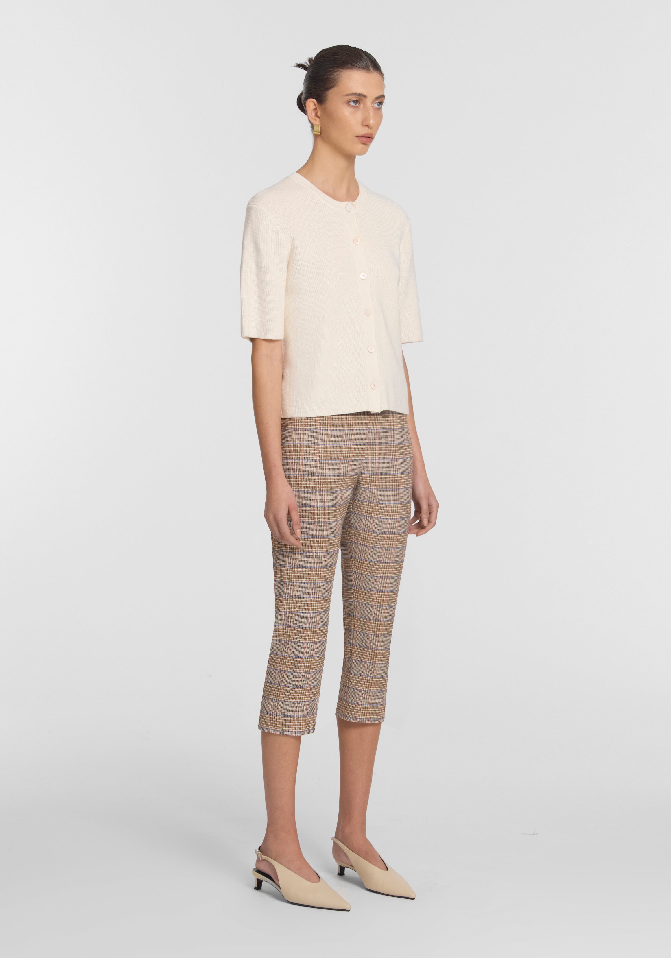 The Sunbeam Capri, a modern staple reimagined in a captivating neutral check. Designed with a high-rise, form fitting silhouette, they fall to the mid-calf with subtle side splits. Style with the Prerogative Blazer or Pitch Vest for a standout look with a nod to mid-century design, or pair with the Violet Cardi for effortless ease.