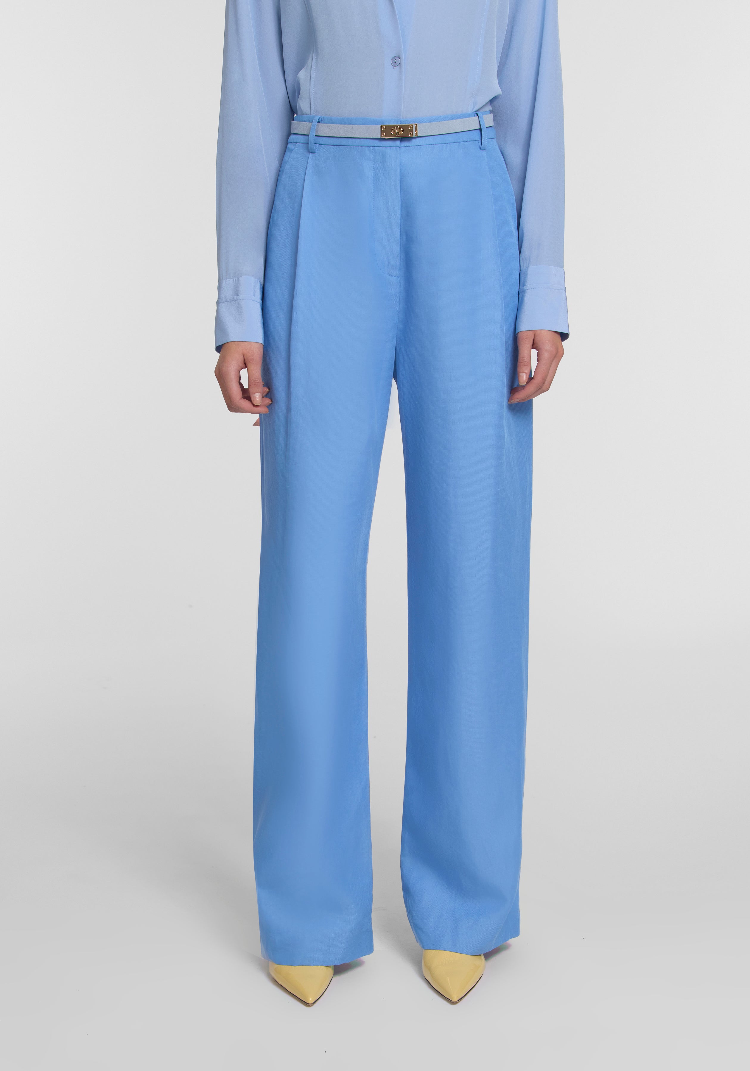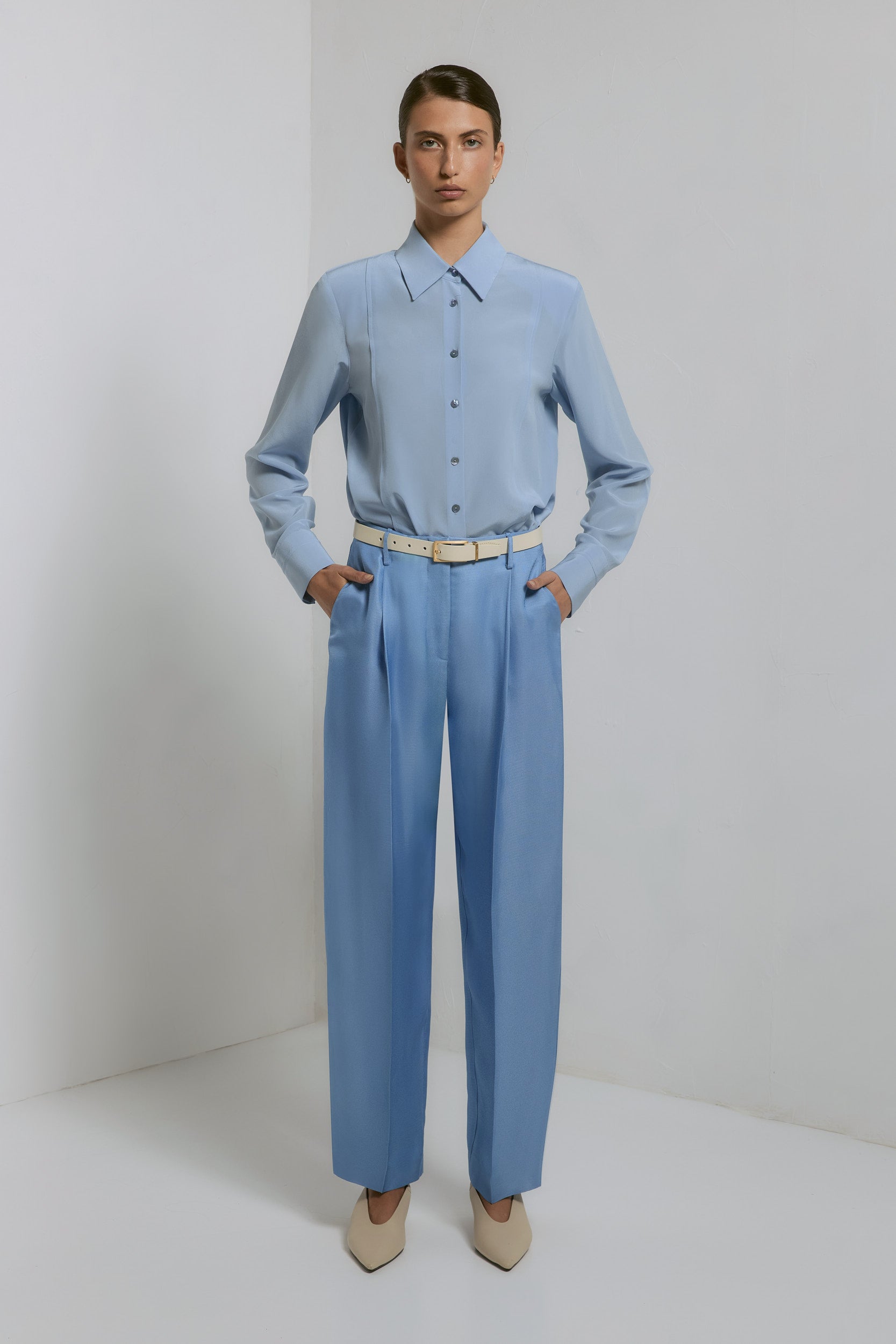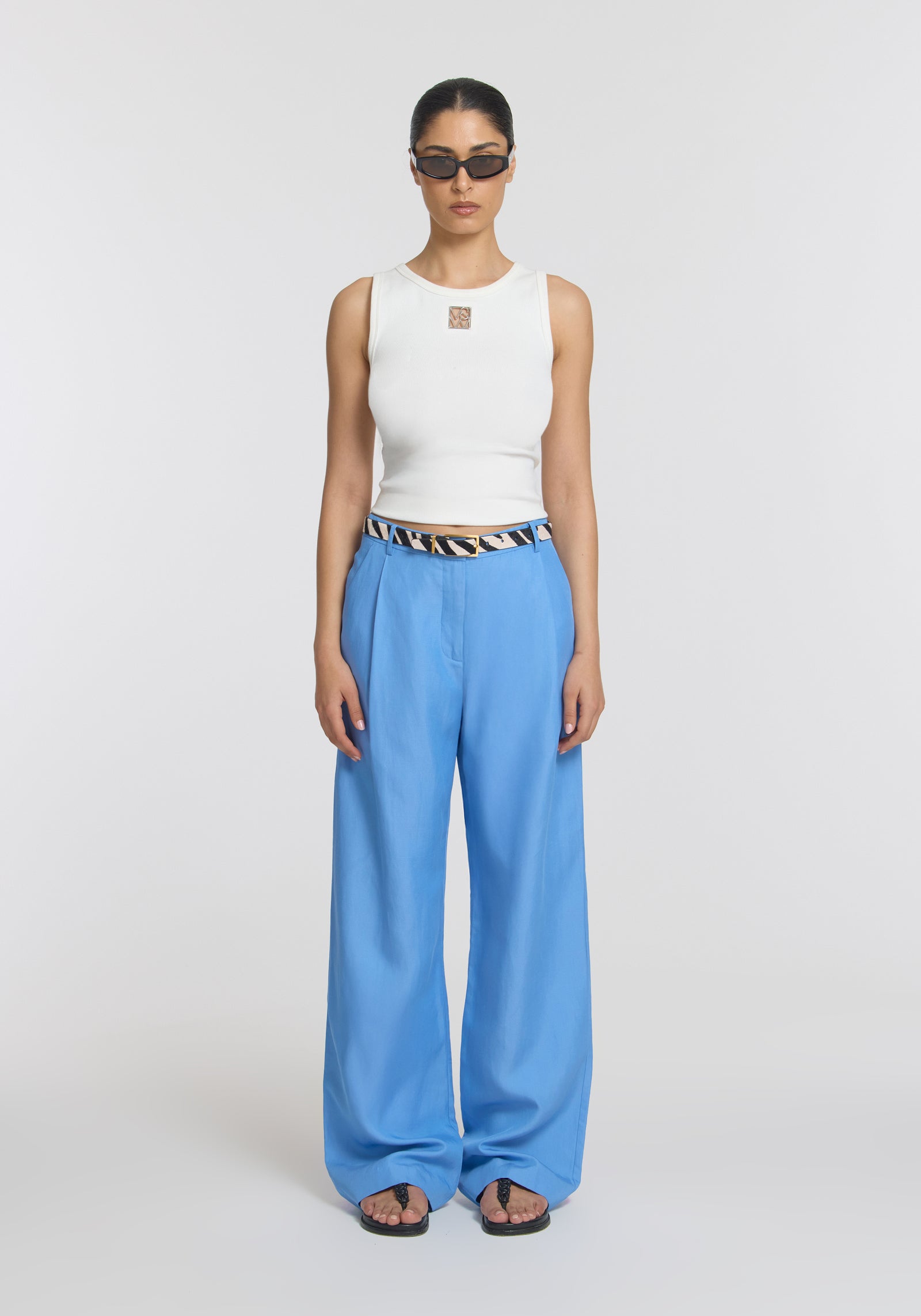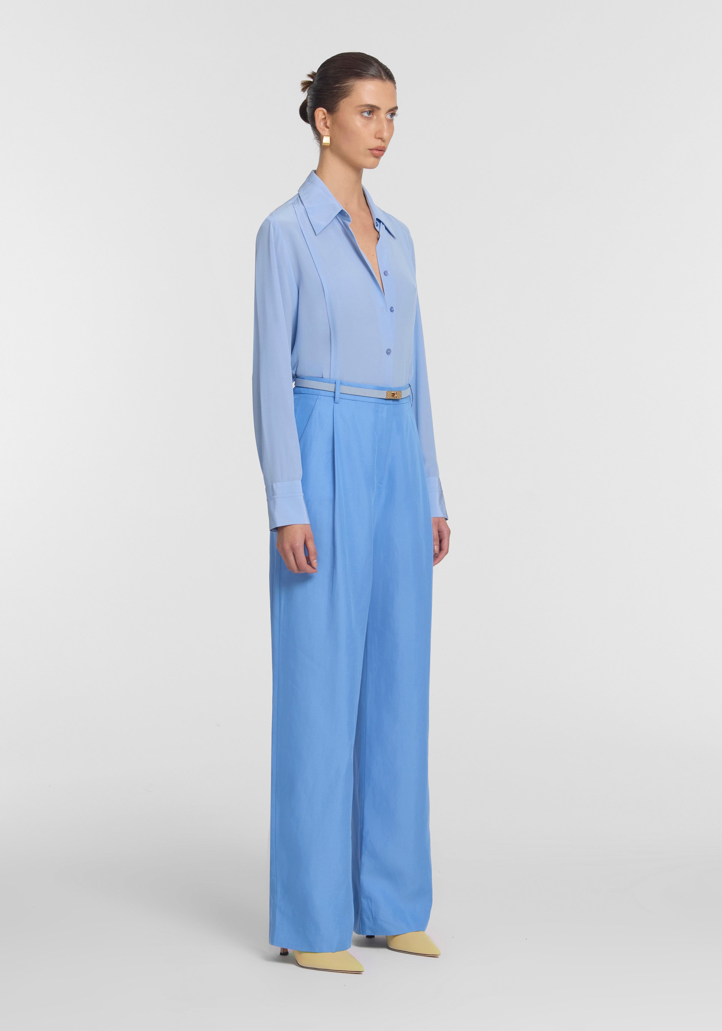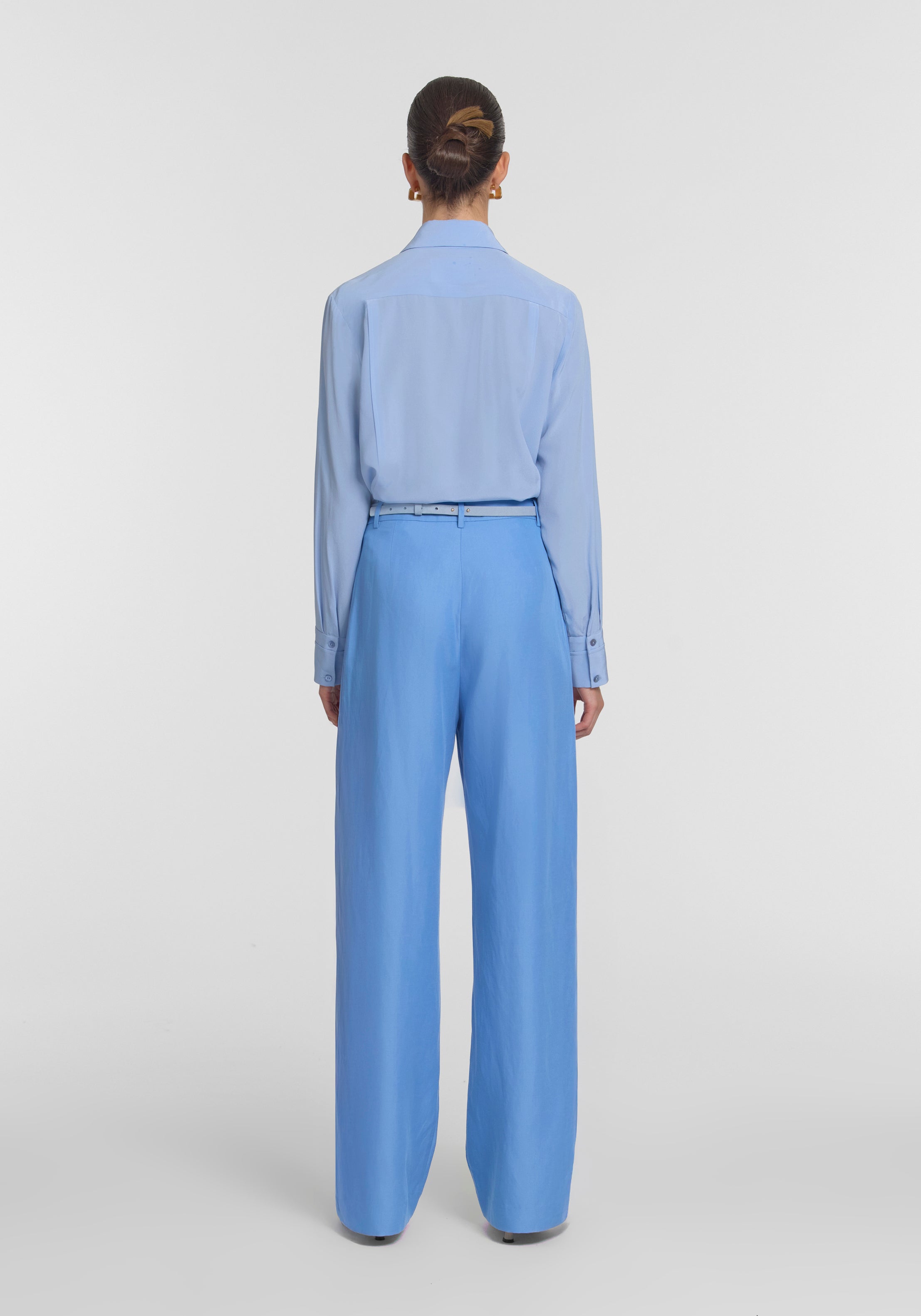 Revitalise your spring tailoring with the Tanner Pant, crafted from a Tencel-linen blend with a subtle sheen in a fresh blue hue, inspired by LA's coastal calm. Featuring a mid-rise, wide-leg silhouette, it’s adorned with pockets, front tucks, and mock welt back pockets. Pair with the matching Shoreline Blazer or Solstice Shirt for a subtle contrast that exudes sophisticated ease.