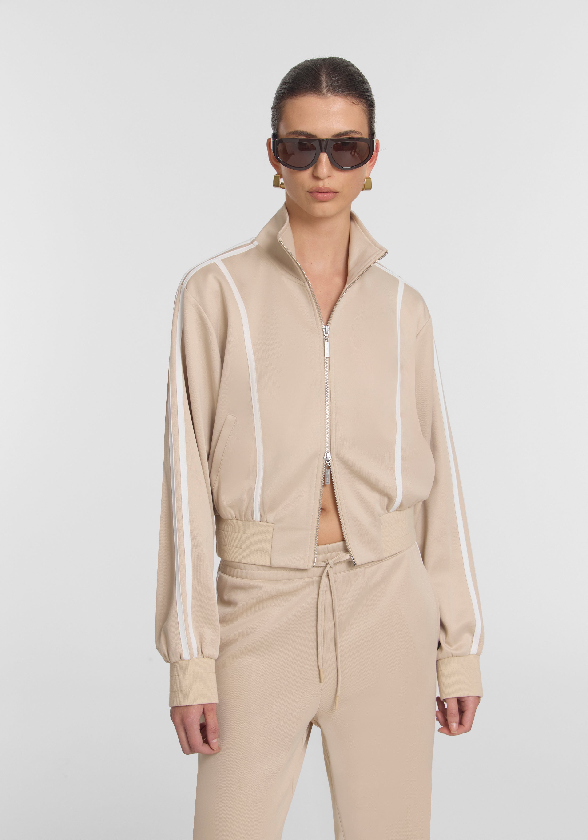 The Teammate Bomber, crafted from a cotton double-knit jersey in a neutral almond hue, embraces modern sport utility. Showcasing versatility in the details, it offers a cropped fit with contrast ivory stripes and a signature WOODS patch, complete with a two-way zipper. Pair it with the Kinetic Pant for a striking set that commands attention, or with a tailored pant for a contrasting look.
