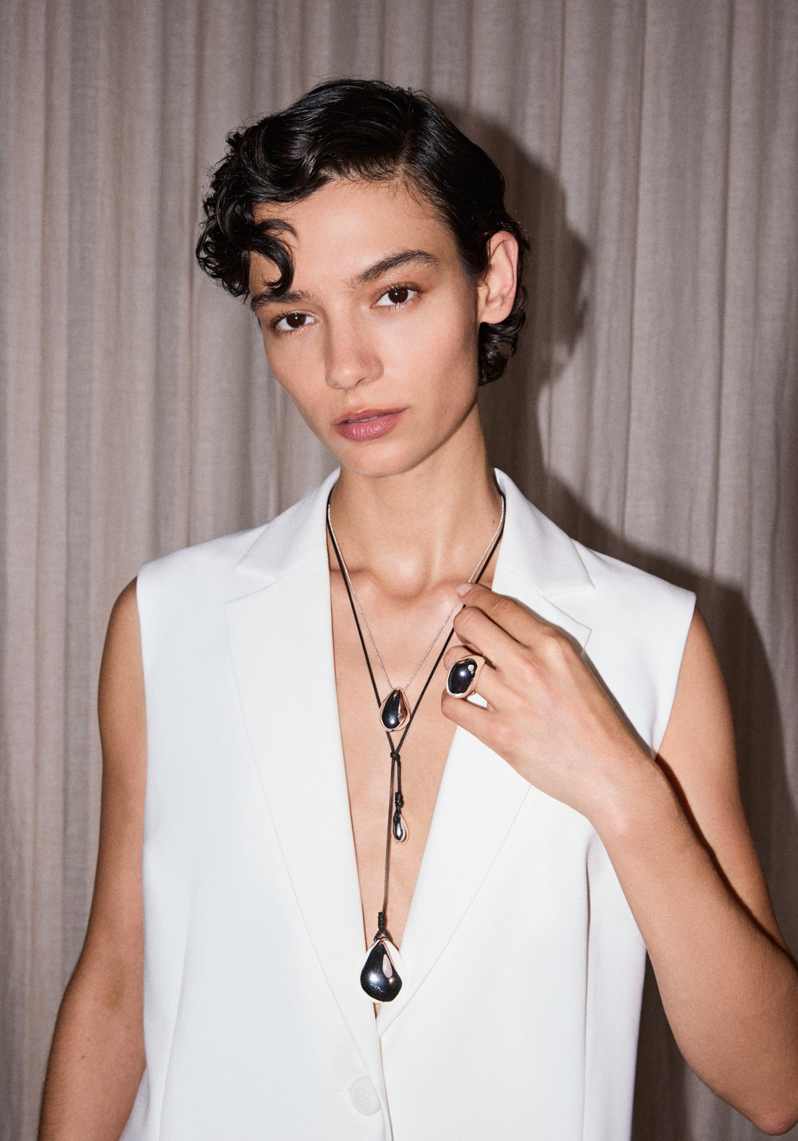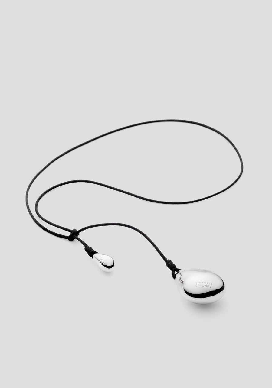 The Teardrop Cord Necklace is a sculptural statement, crafted with a double teardrop brass pendant finished in sterling silver plating. Suspended on a cotton cord with adjustable knot detailing, it offers an artful counterpoint to everyday dressing.