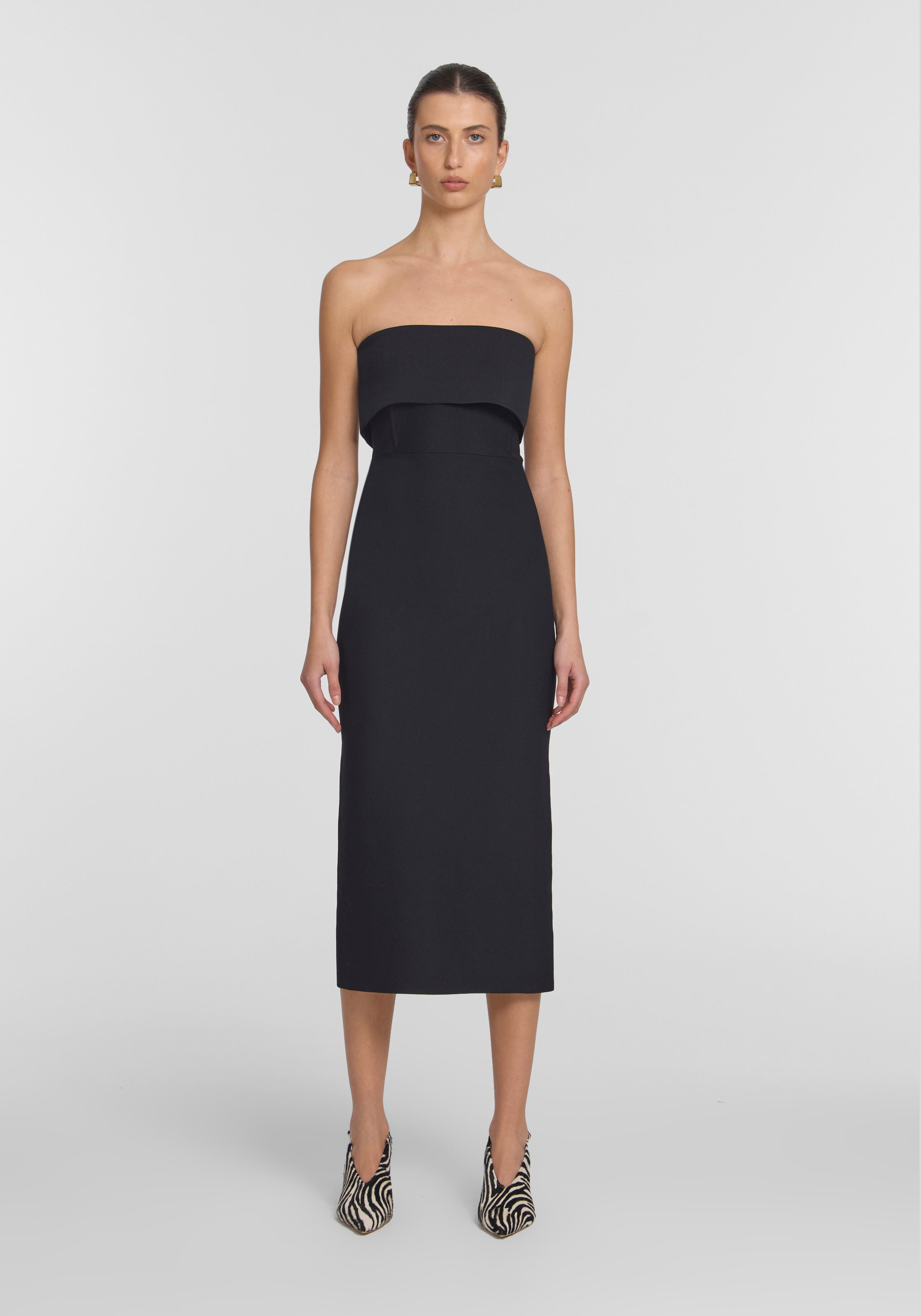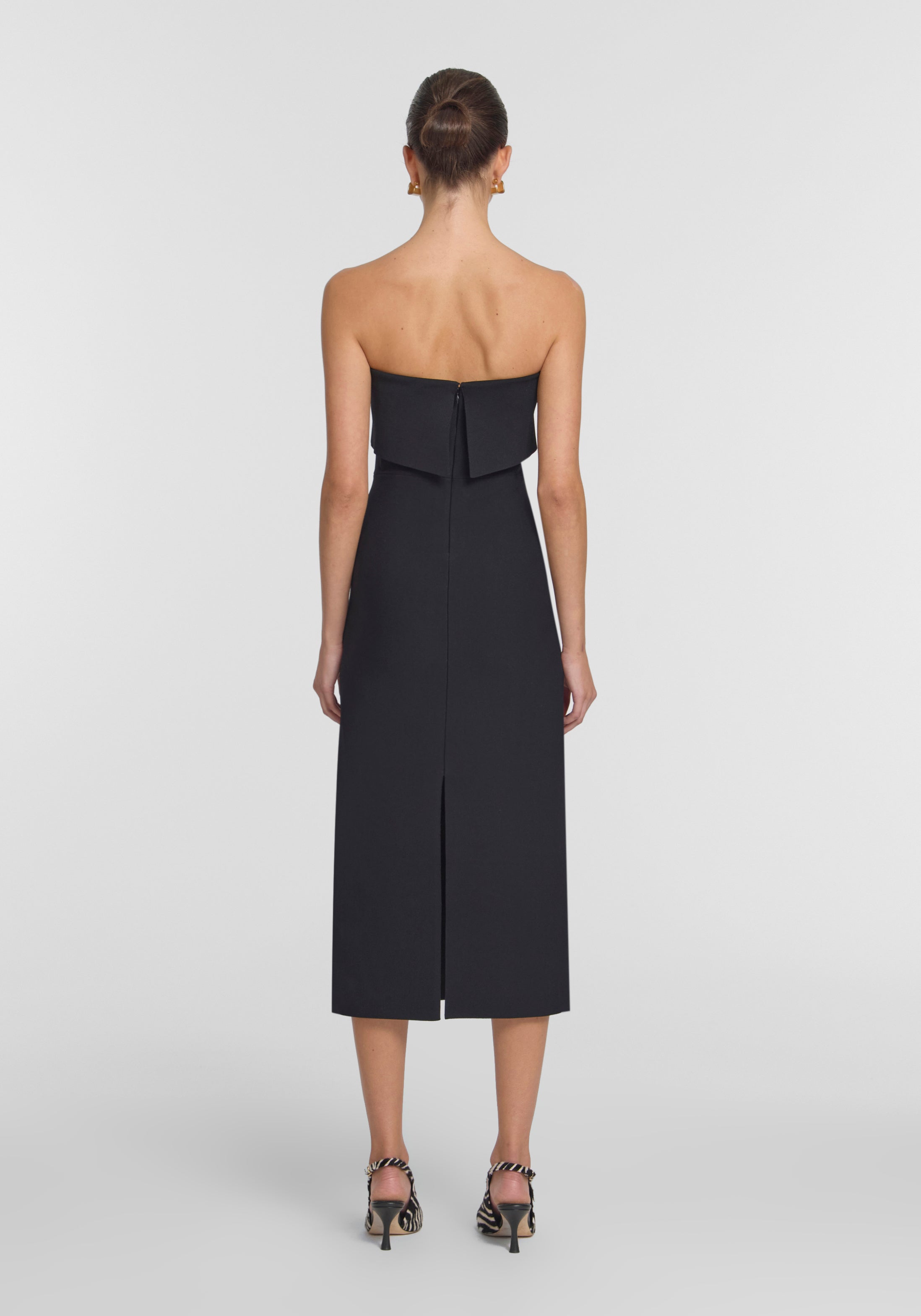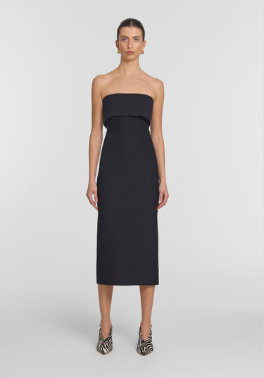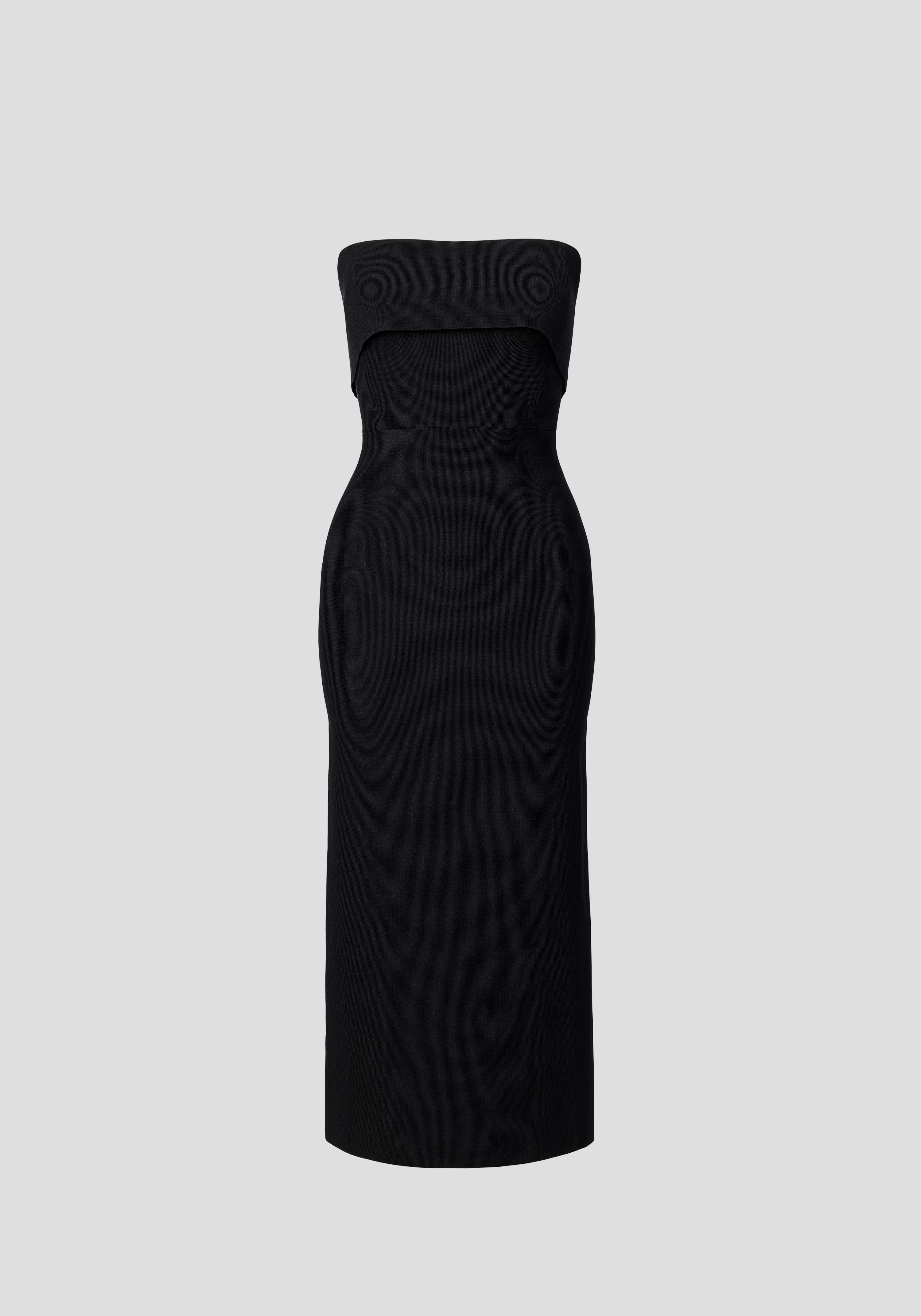 The Translation Dress, knitted in a compact milano stitch, showcases a black strapless design that offers considered structure to flatter every shape. Designed with a layered bust panel, internal boning, and a defined waist seam for subtle contouring, it’s complete with a centre-back split. A refined silhouette made for modern event dressing and black tie occasions.