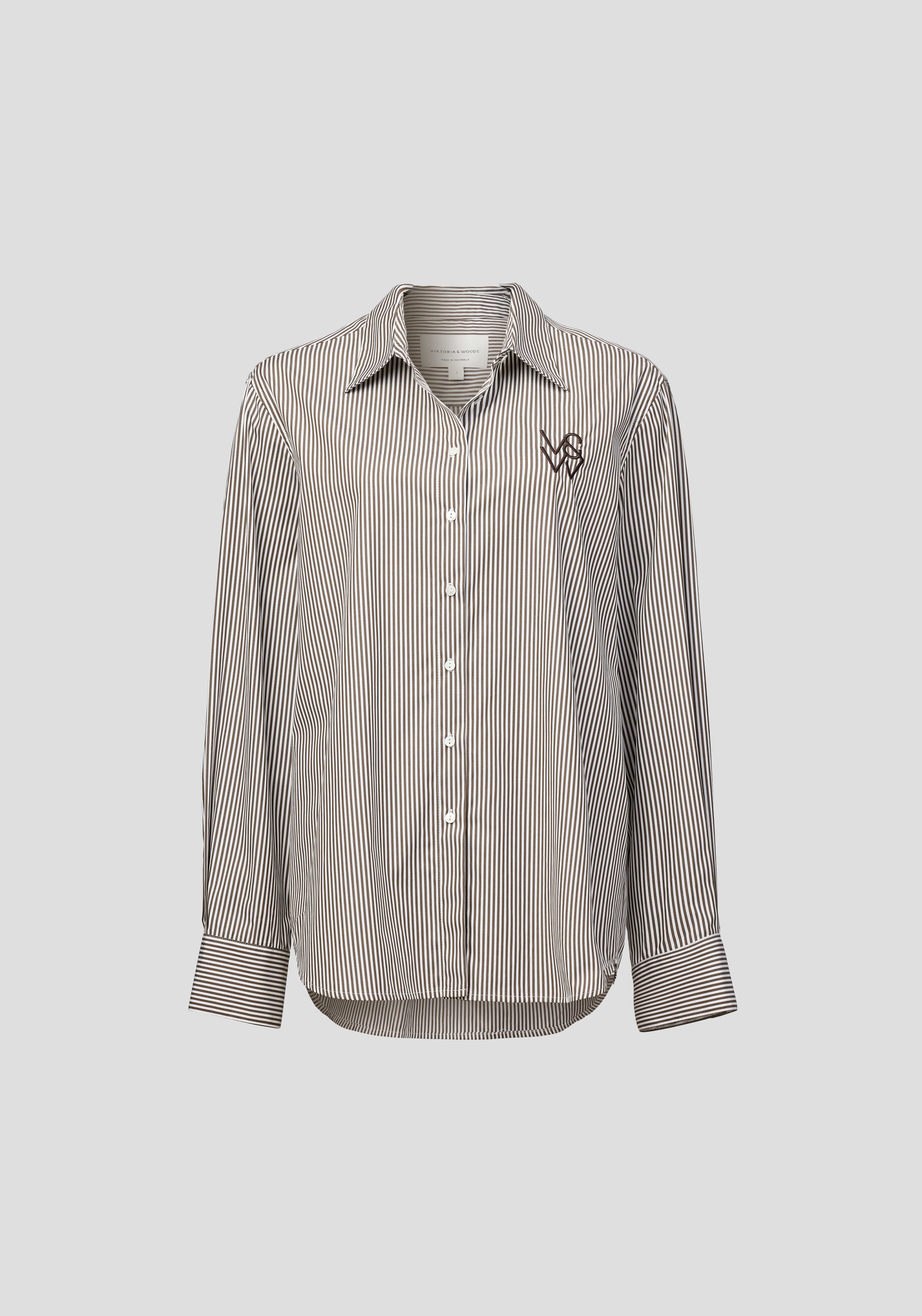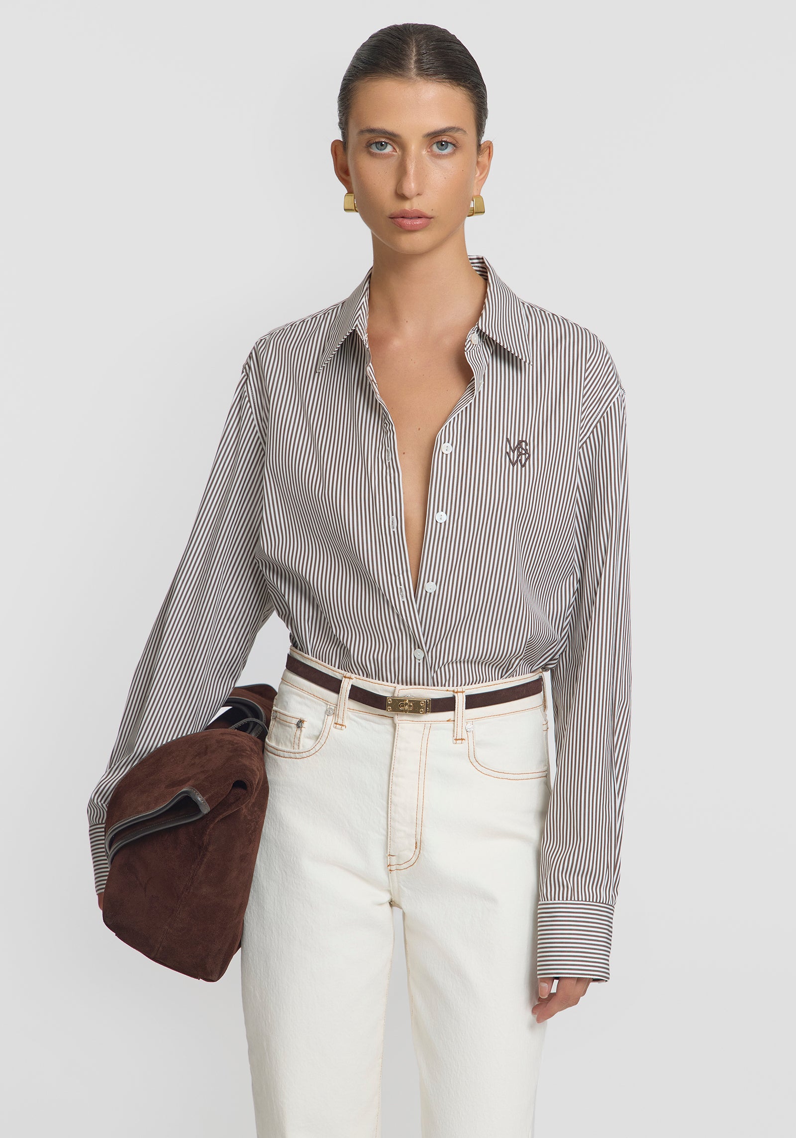 A transseasonal essential, the Trinity Shirt boasts a versatile brown stripe. With a traditional placket, collar, and button-up cuffs, it’s finished with signature logo buttons and V&W embroidery. Effortlessly pair with this season’s pink and brown hues for a striking contrast, or drape the Winnipeg Knit over the shoulders for a layered look.