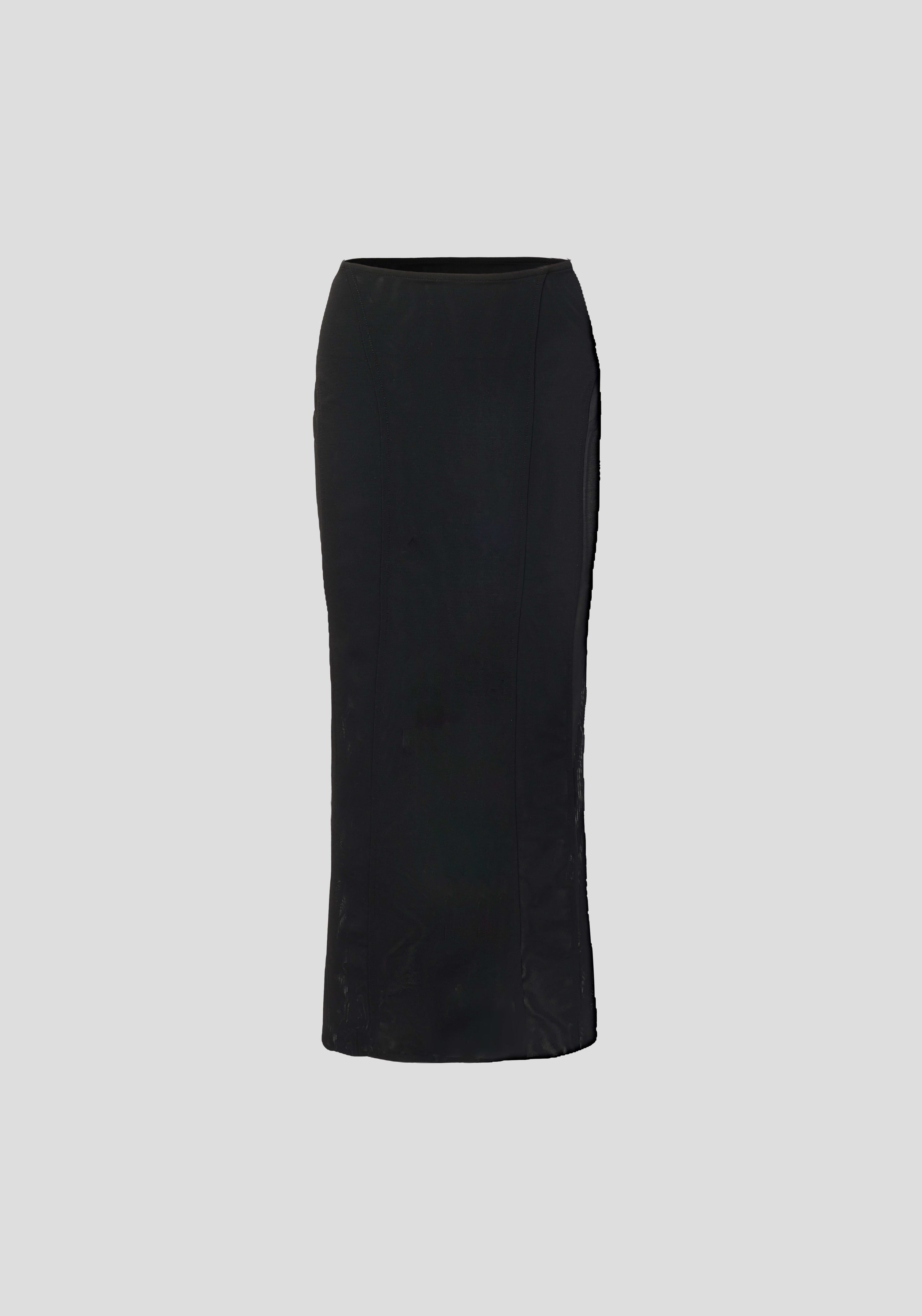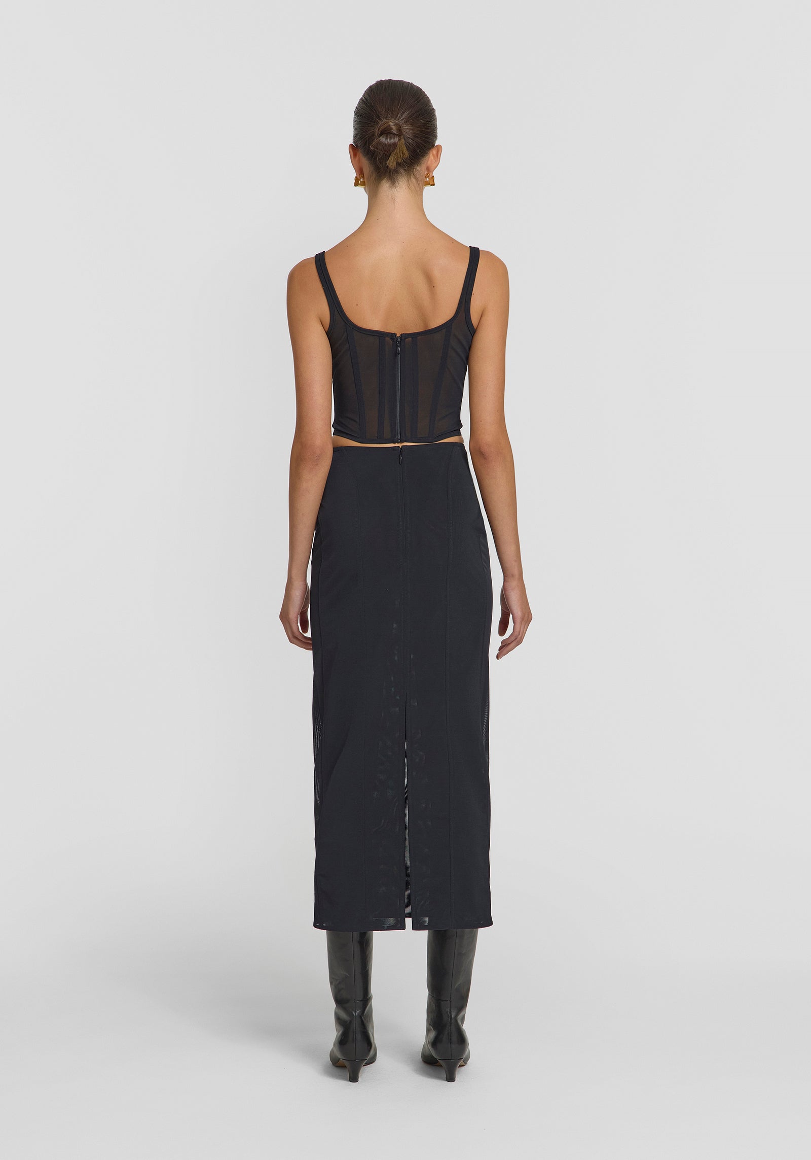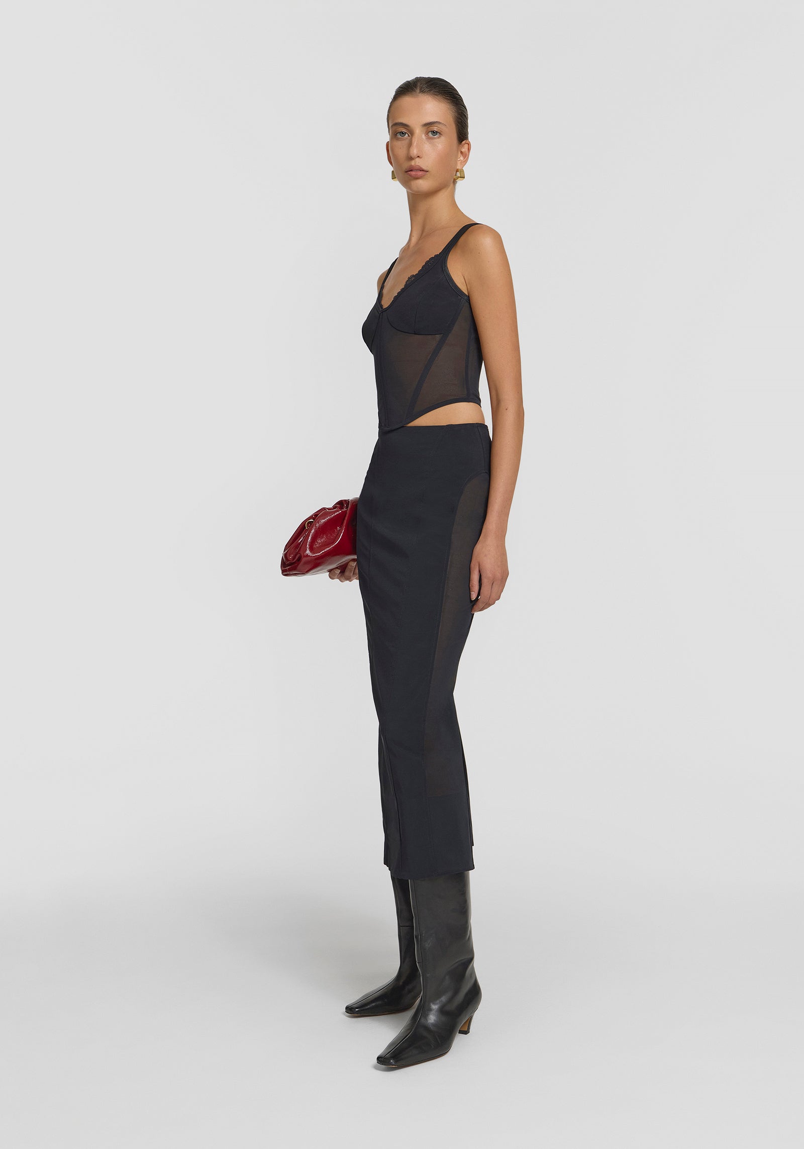 An alluring addition to the V&W powermesh narrative, the Underdog Skirt is a fitted midi-length skirt in sleek black. Enhanced by intricate seam details, subtly sheer side panels, and a back vent - with double lining at the front and back - it offers a bold yet refined silhouette. Pair it with the Salacious Bustier for the ultimate statement in black.