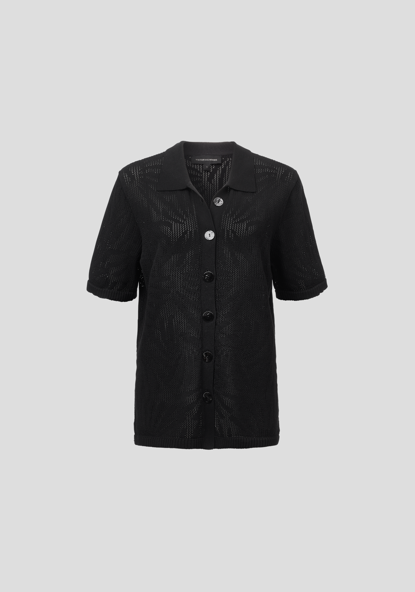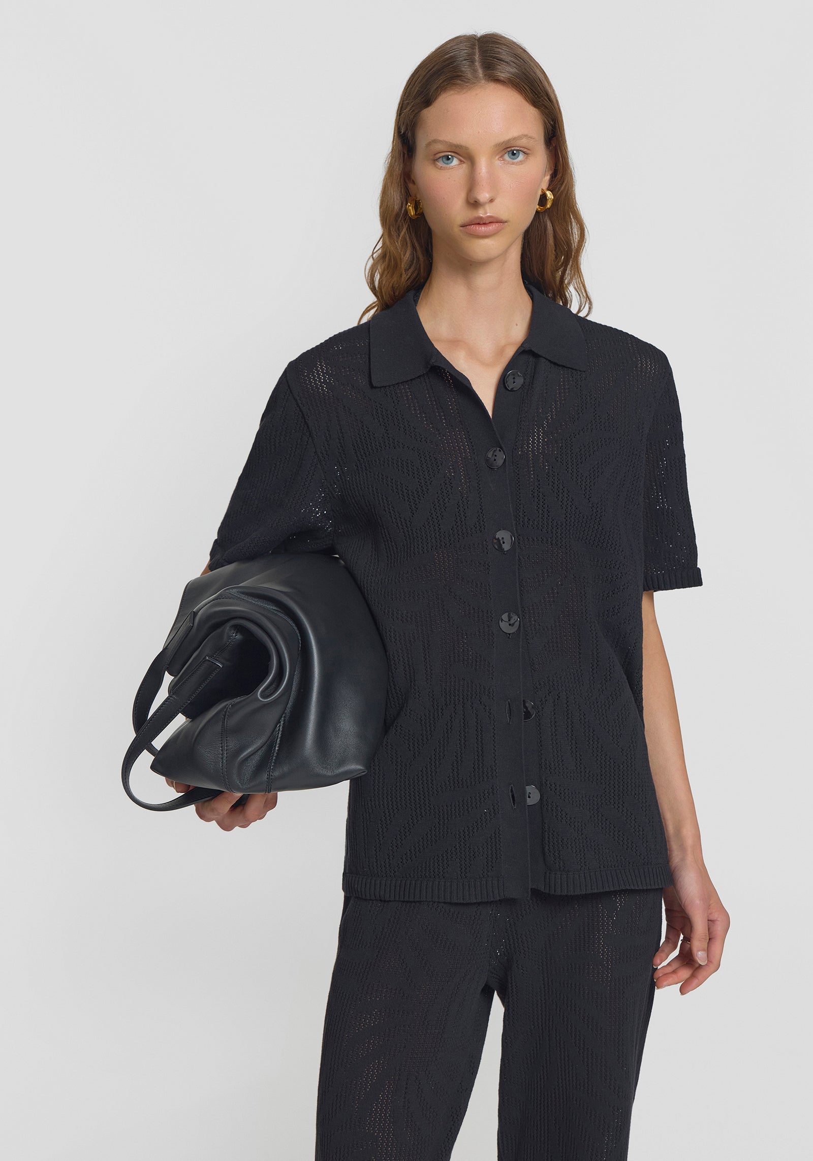 Embrace relaxed refinement with the Valencia Shirt, fully fashioned in organic black cotton and adorned with subtle abstract palm leaf motifs. Featuring a classic centre front placket and traditional collar, it offers a relaxed fit and a hint of sheerness. Pair effortlessly with the Spain Pant for a look of relaxed ease, essential for beachside escapes.