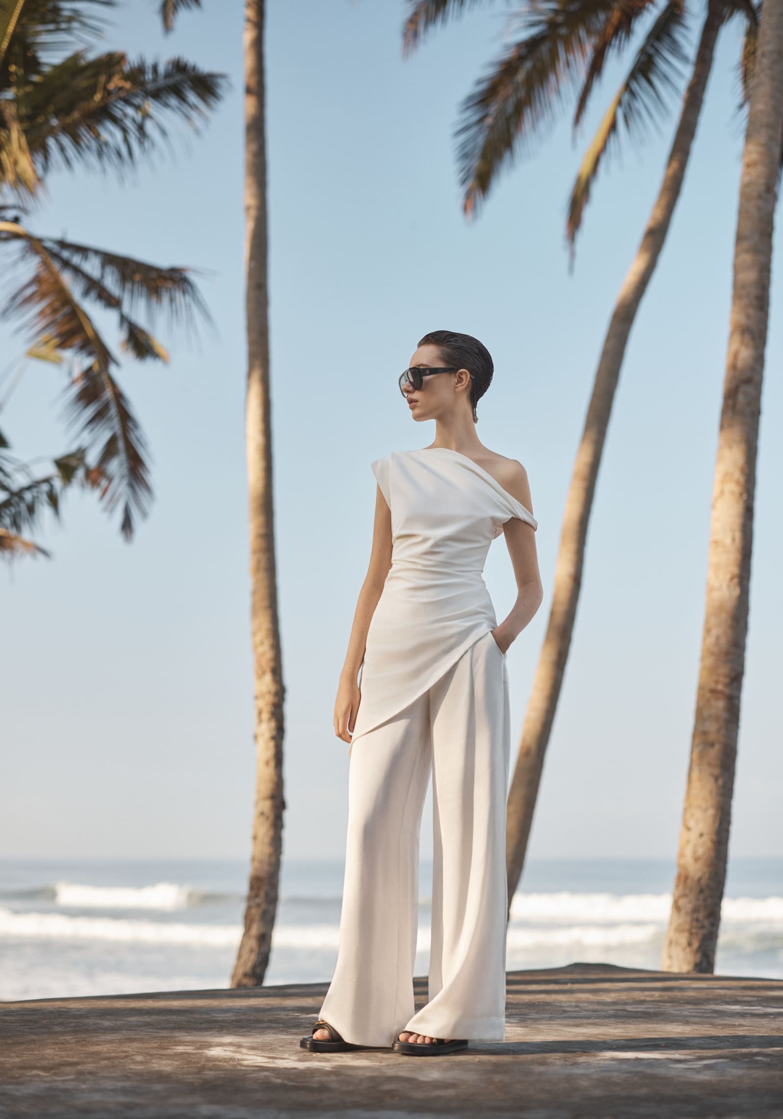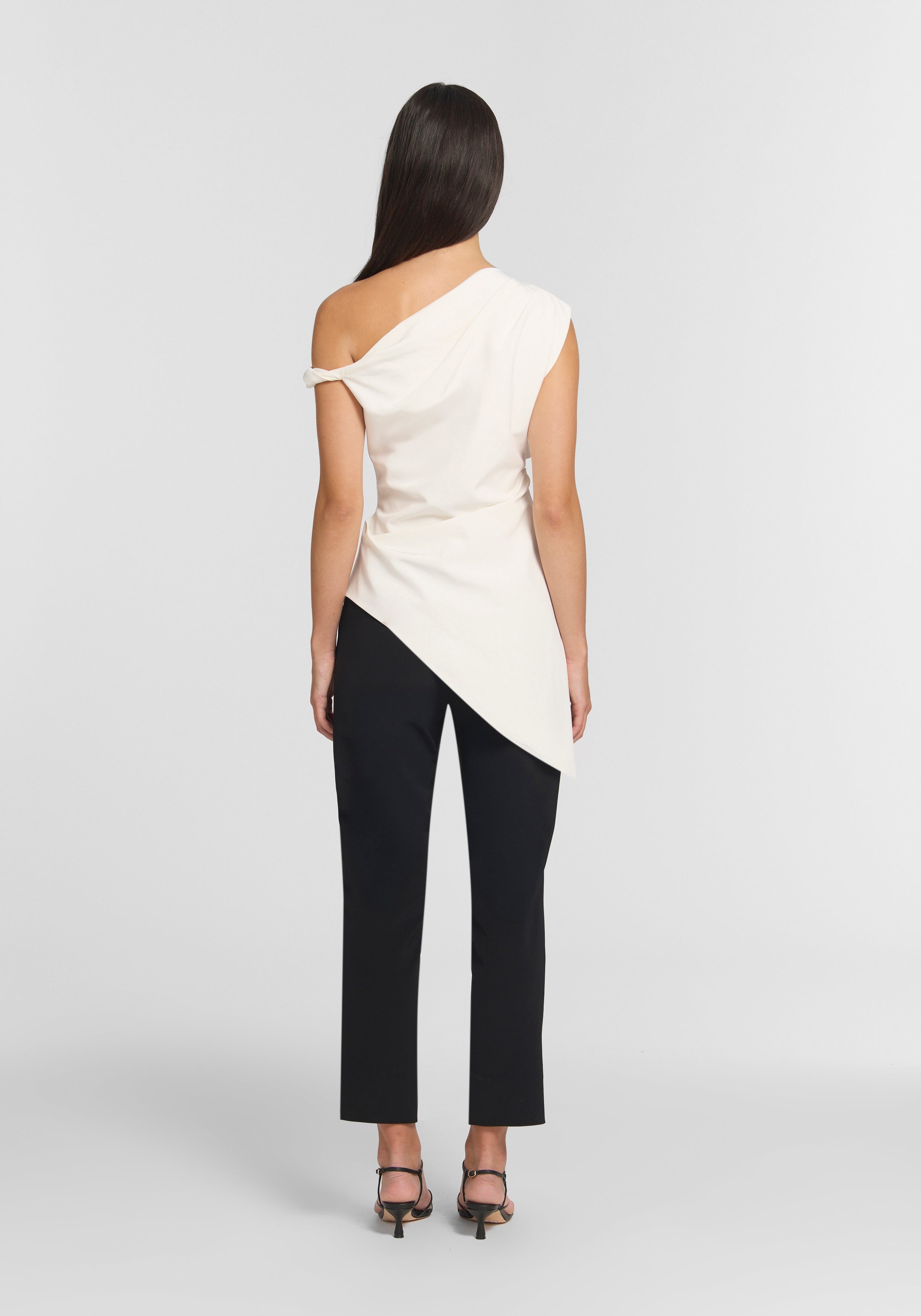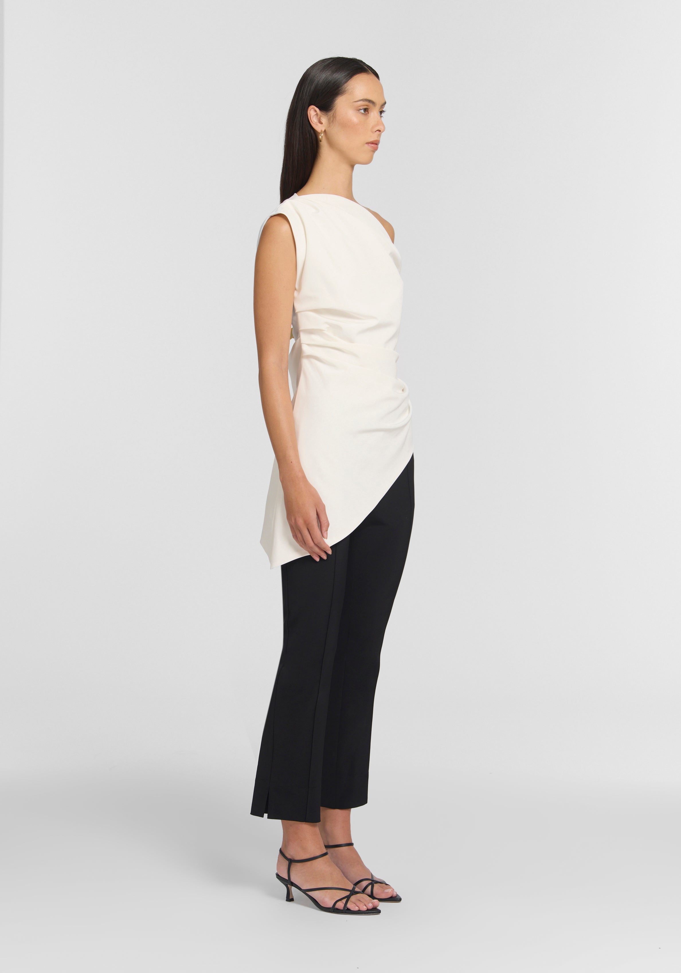 An architectural statement, the Valkyrie Tunic is crafted in classic ivory, showcasing a structured, asymmetric silhouette. Featuring twist detailing through the shoulders and an extended shoulder on one side, it showcases considered, flattering details. Build versatile, creative outfits around this piece, or pair with the Lucida Capri for an effortless monochromatic moment.