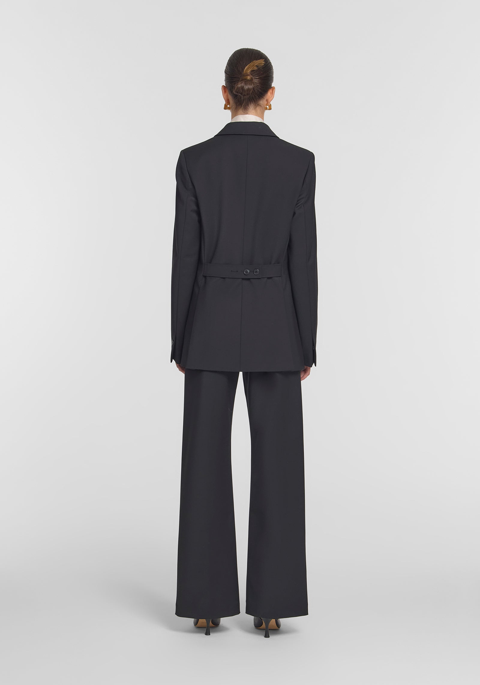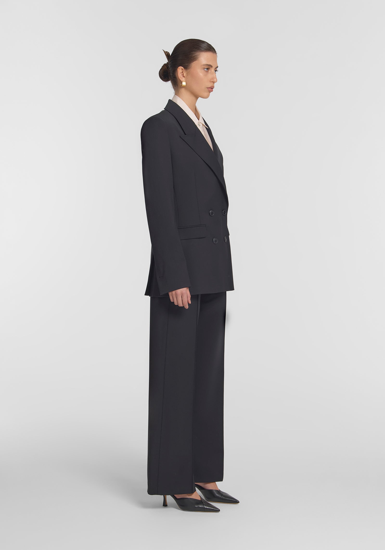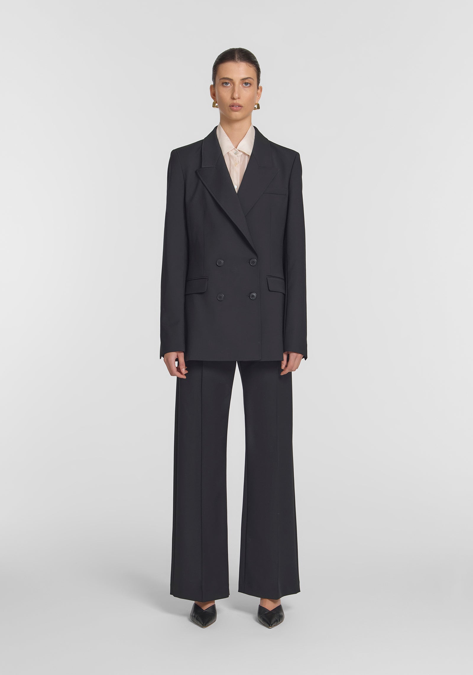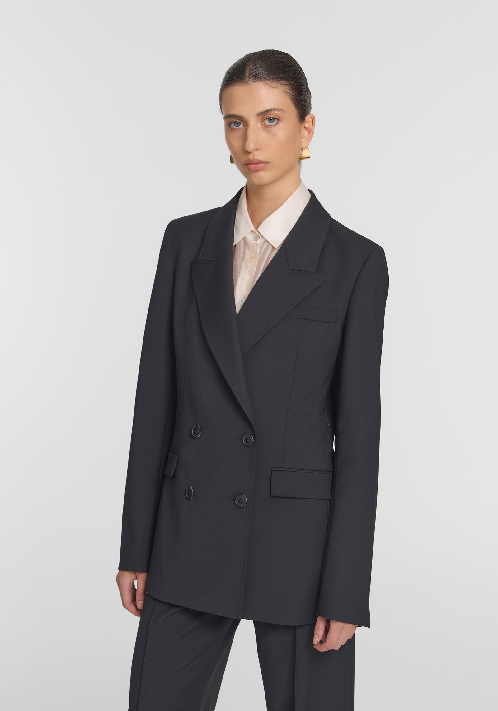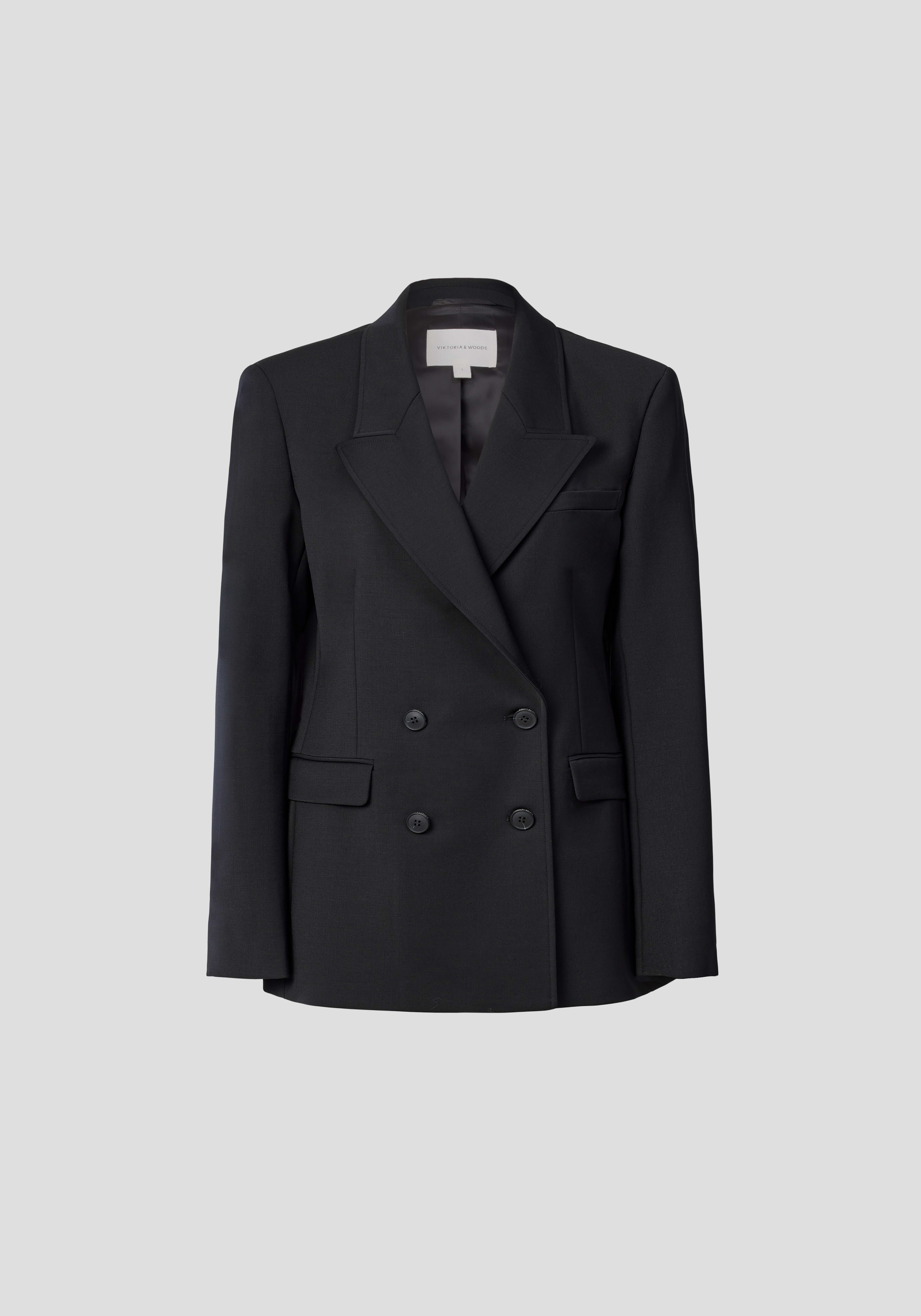 A timeless black blazer, the Vermont Blazer is crafted from a classic wool blend. Featuring a double-breasted silhouette, subtly tailored waist, shoulder pads, and a peaked collar, it combines modern tailoring with classic elegance. Finished with signature logo buttons and branded lining, this staple pairs seamlessly with the Bateman Trouser for a polished suiting look, essential for modern workwear.