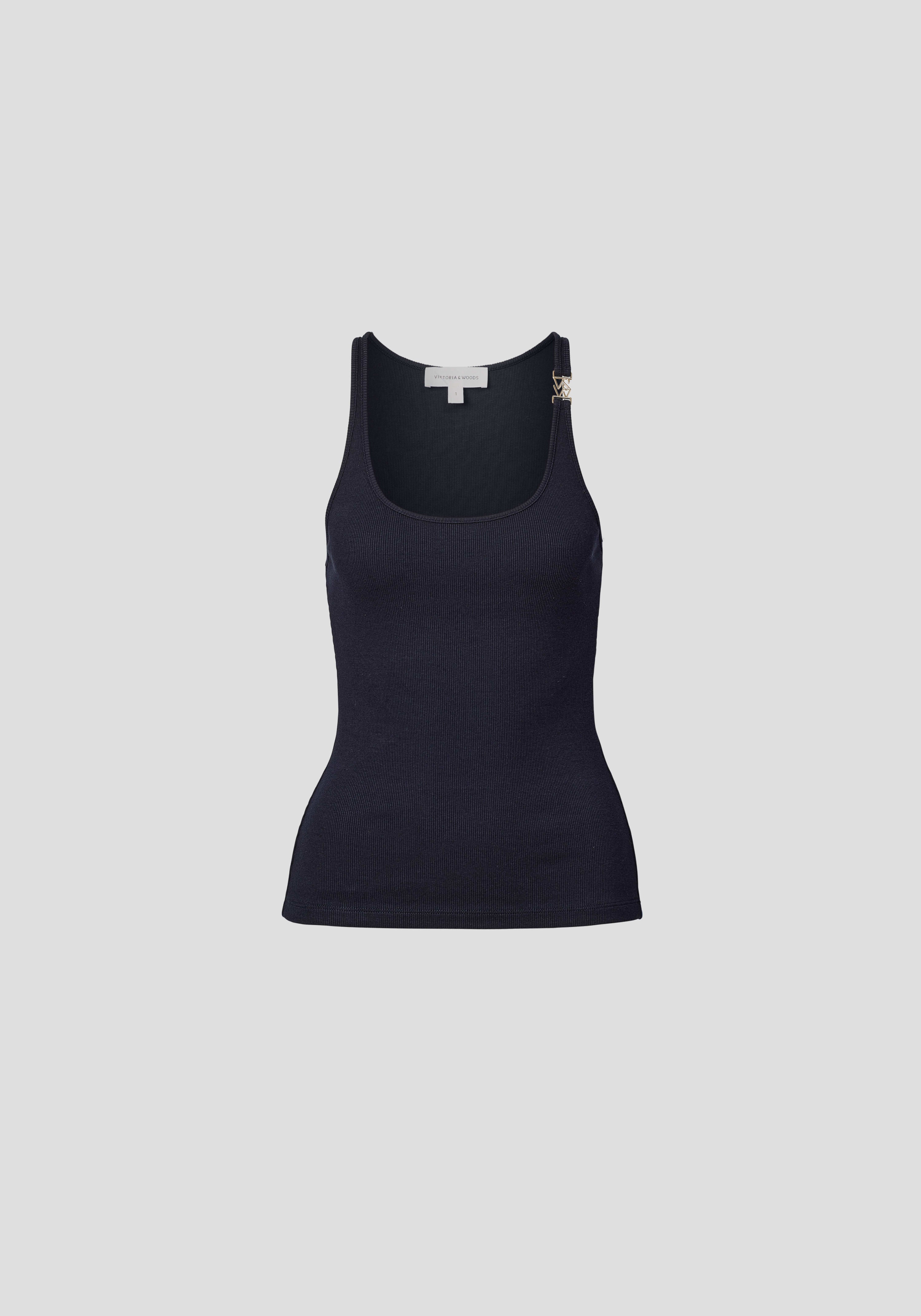 Bring new life to your everyday essentials with the Victor Tank, an elevated take on the classic tank top. Crafted from our signature 2x2 organic cotton rib in a classic navy blue, this fitted silhouette showcases a flattering scoop neckline and sleek V&W hardware on the strap. The perfect starting point for any outfit, it exudes effortless luxury with every wear.