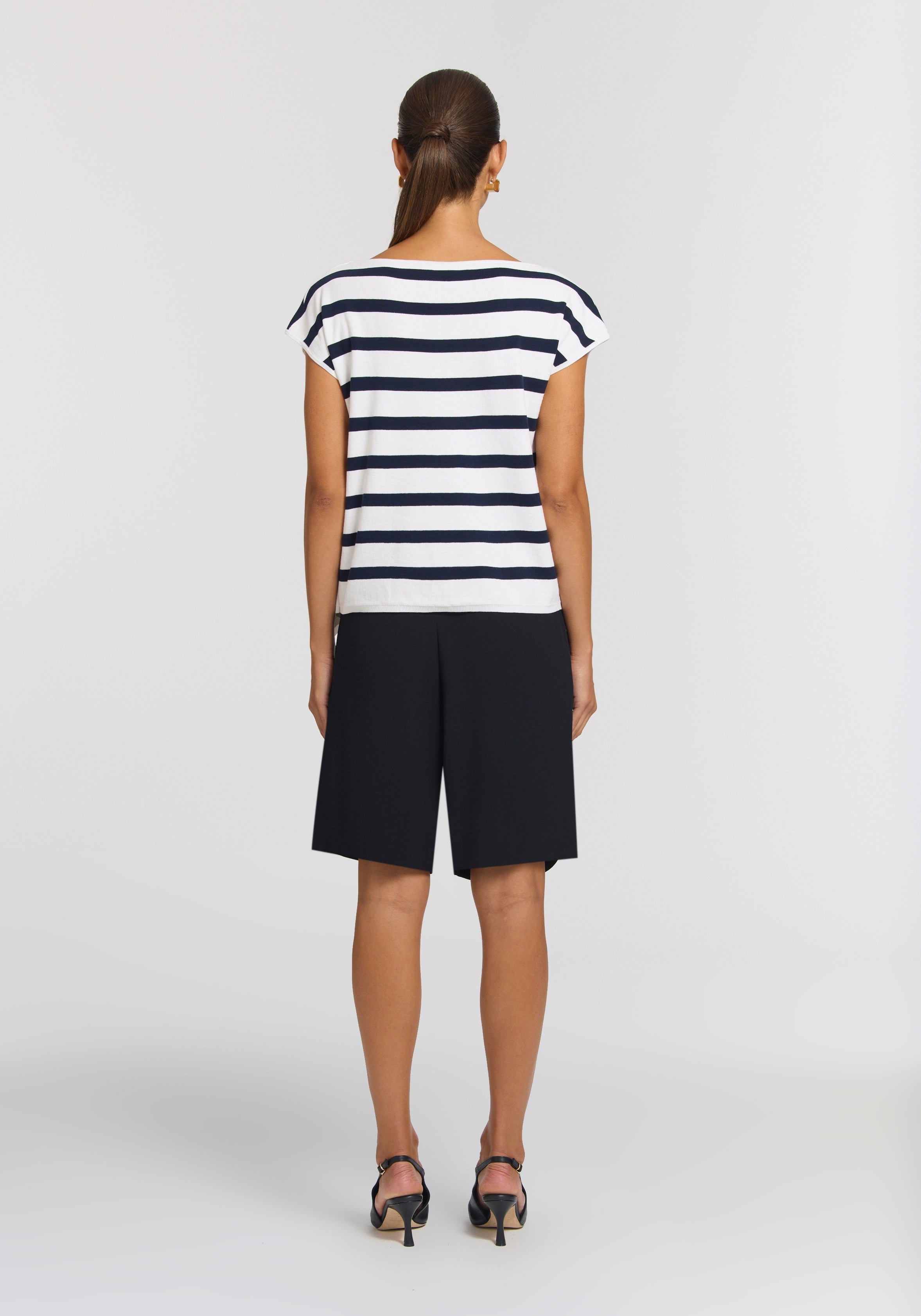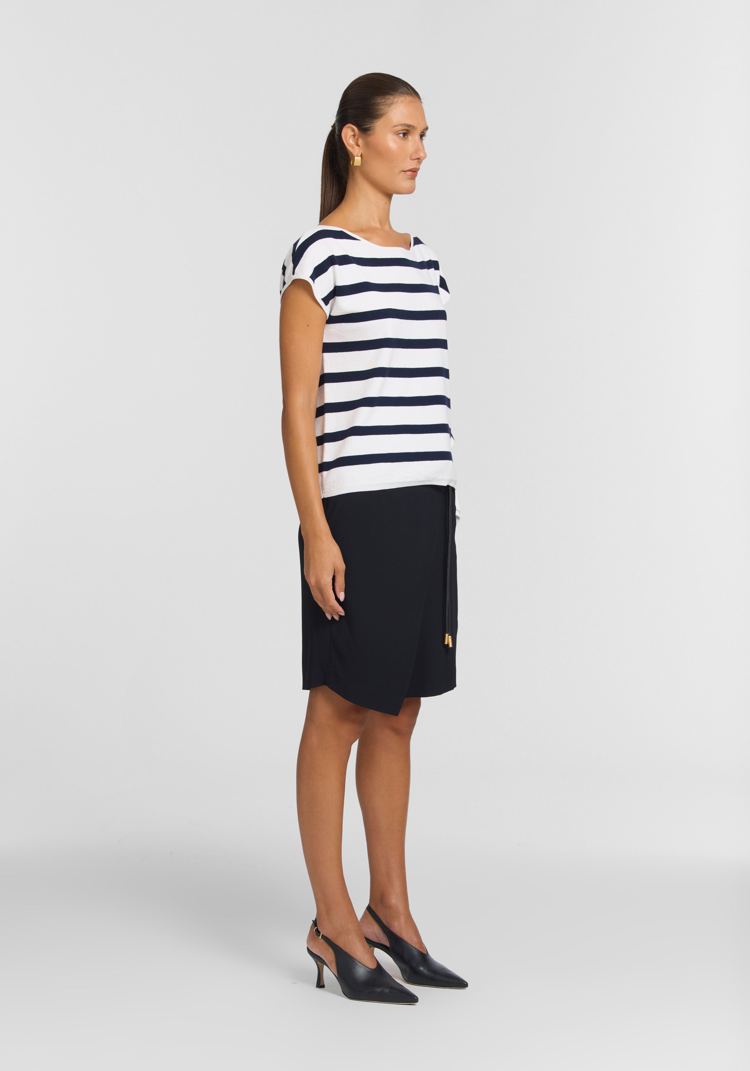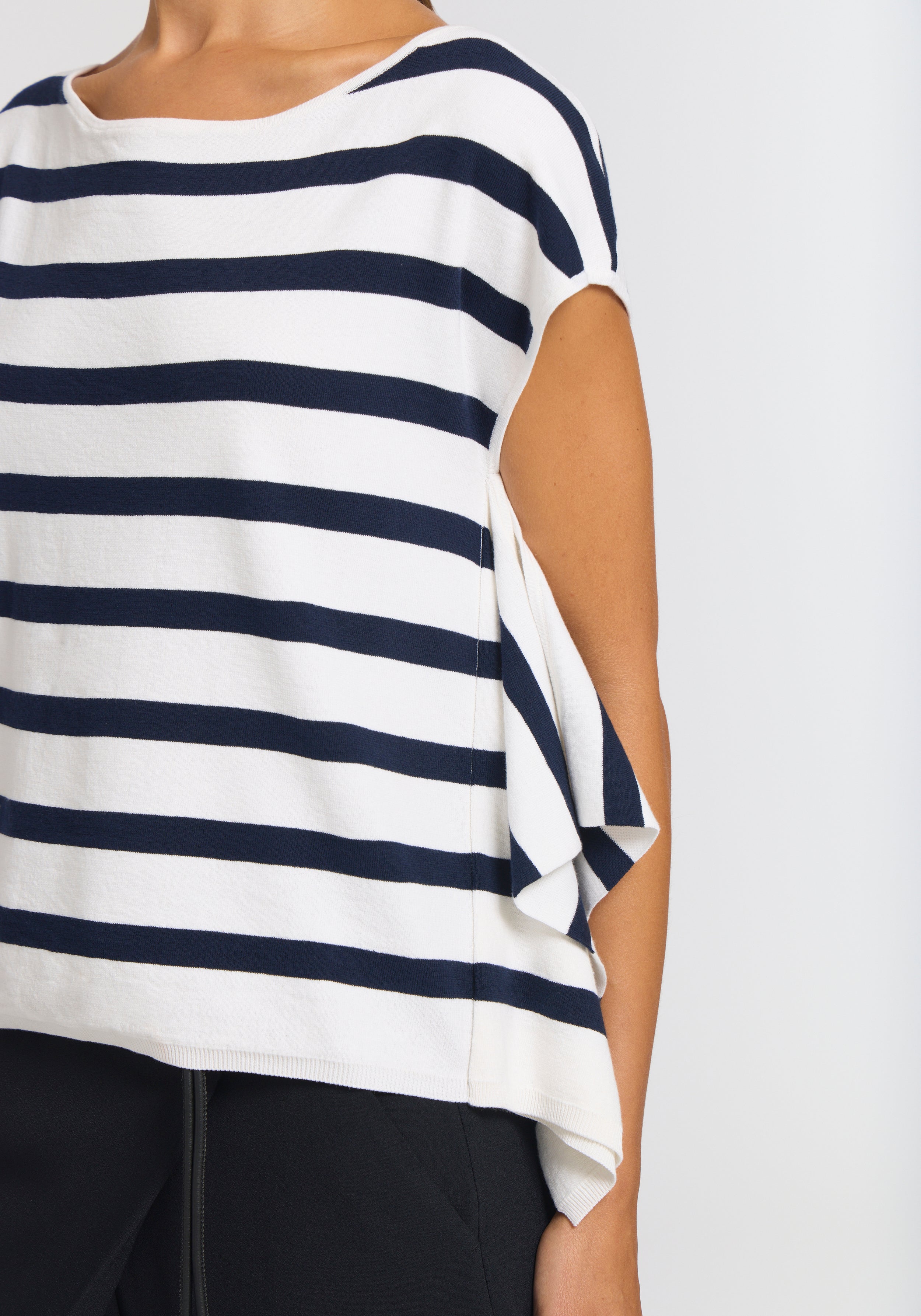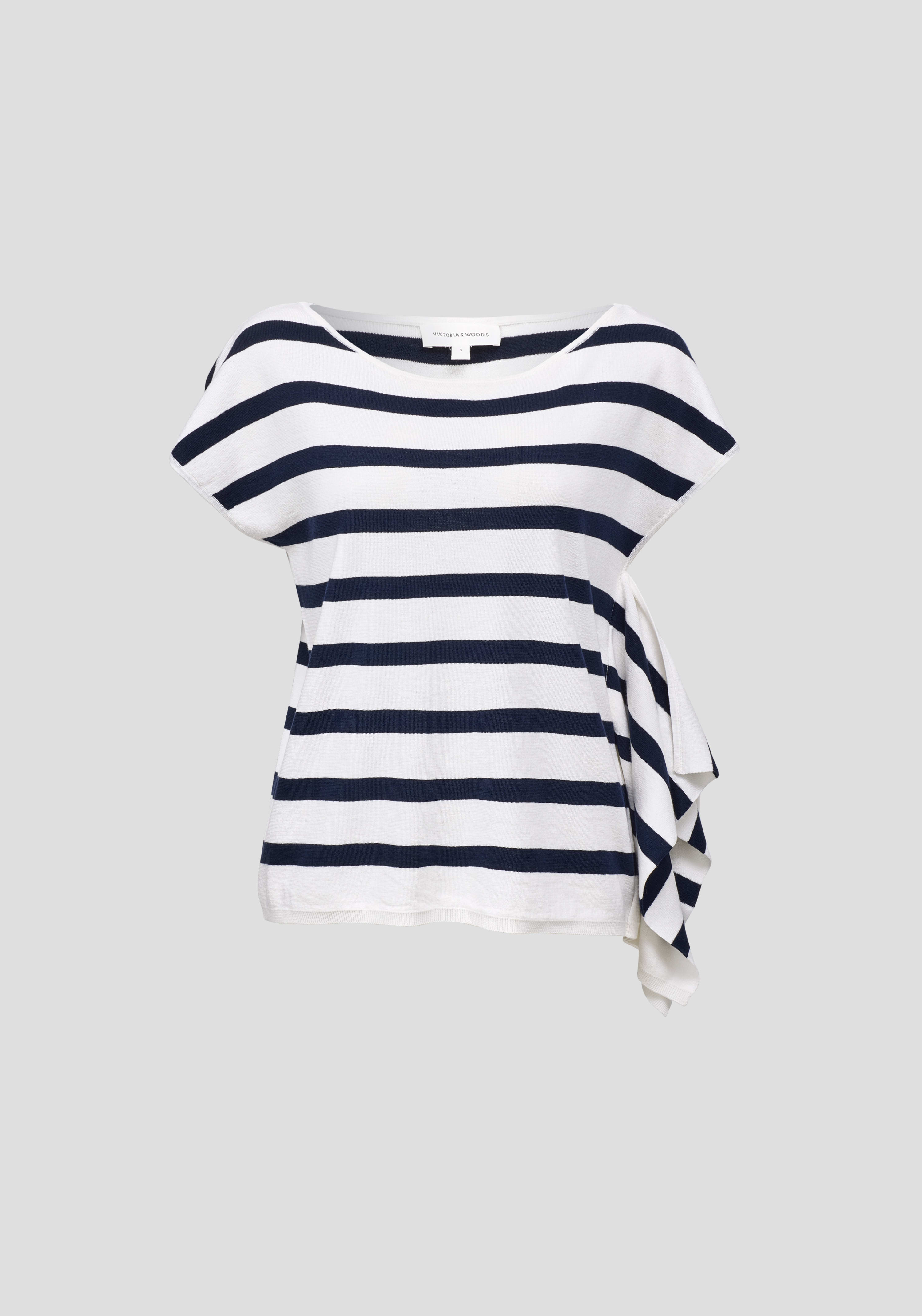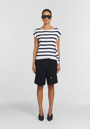 The Villain Top, a summer essential crafted from a softly draped cotton-silk blend, showcases a classic nautical navy and white stripe. With an asymmetric design and subtle ruffle panels, it’s perfect for effortless everyday wear or a warm-weather escape.
