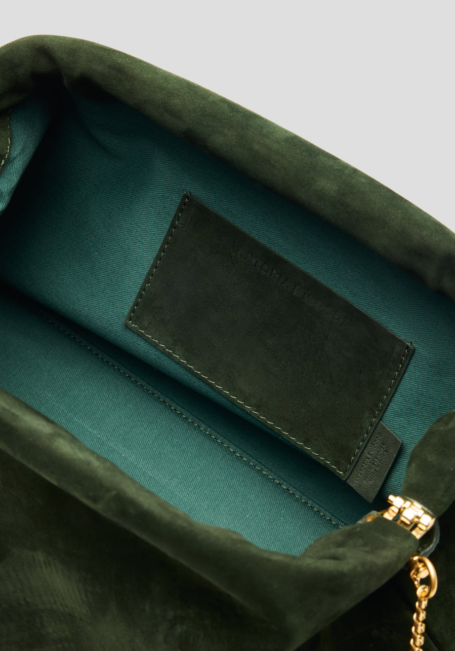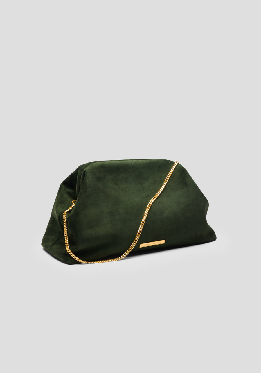 The Vinnie Bag is crafted from green suede leather, a modern accessory designed to endure. With gold logo hardware, a hinge opening, and a removable chain strap, it adds a considered touch to any look. Pair with the Rosemary Top and Breakwater Skirt, or style with the Damascus Heel in the matching hue for effortless elevation.