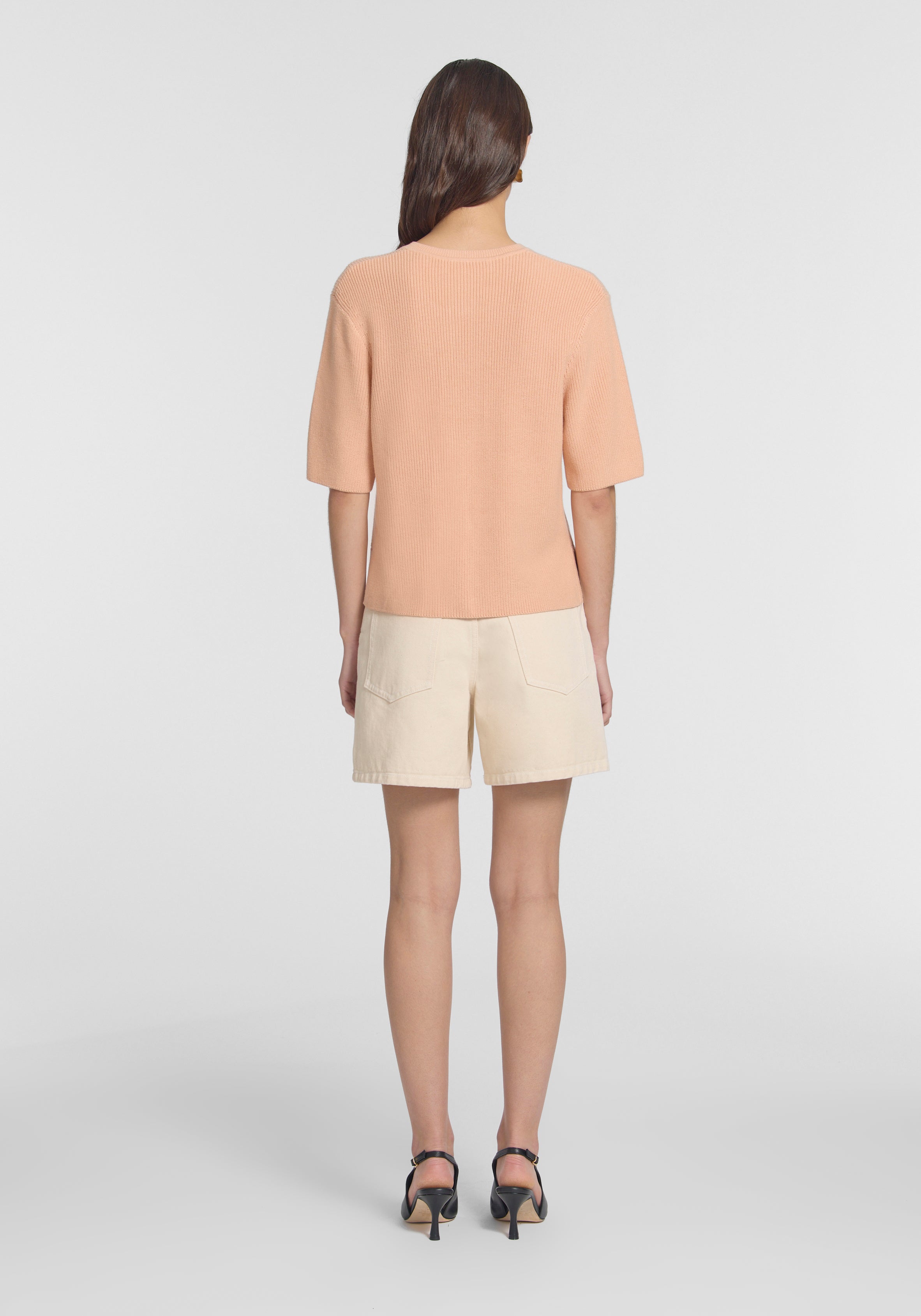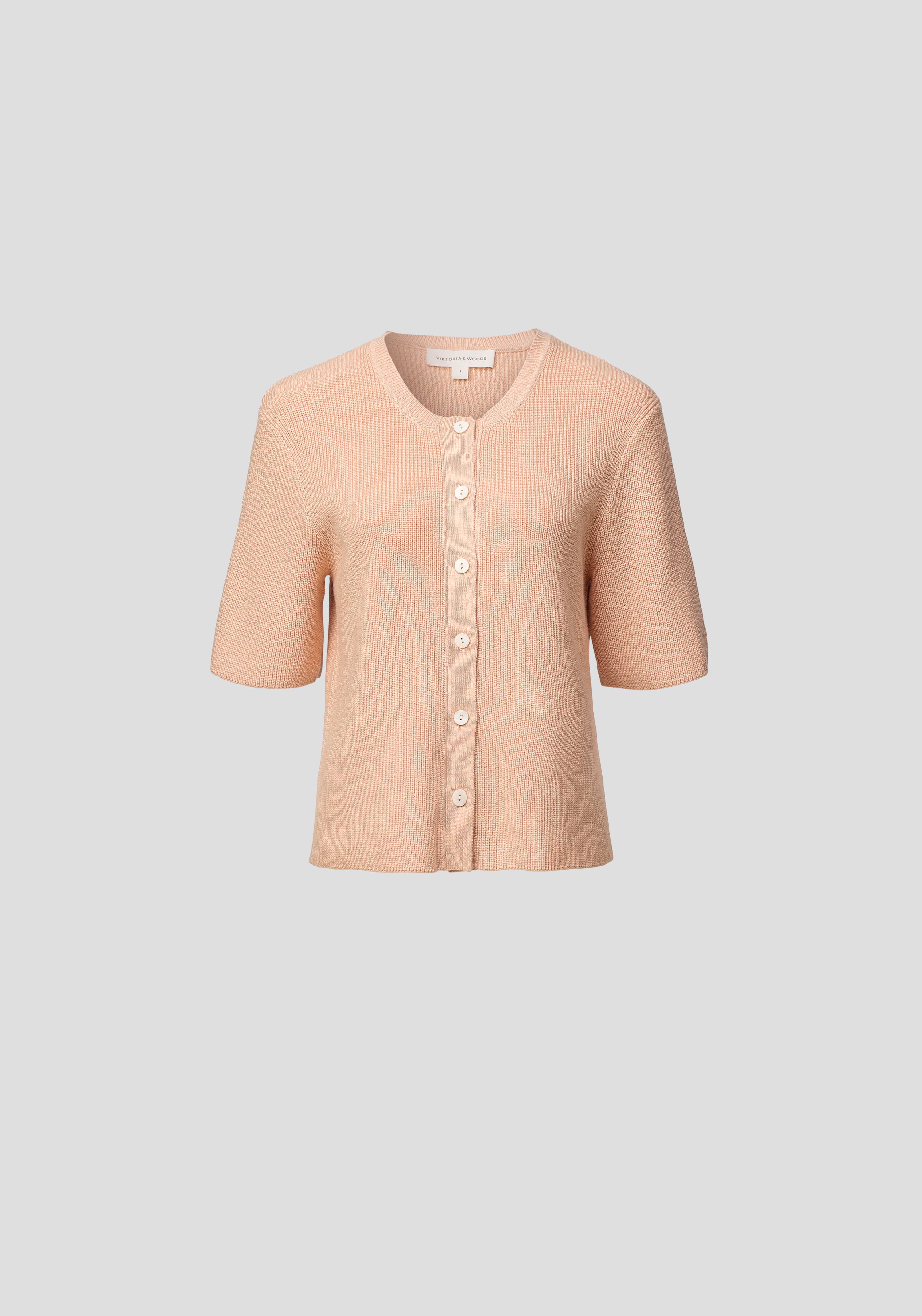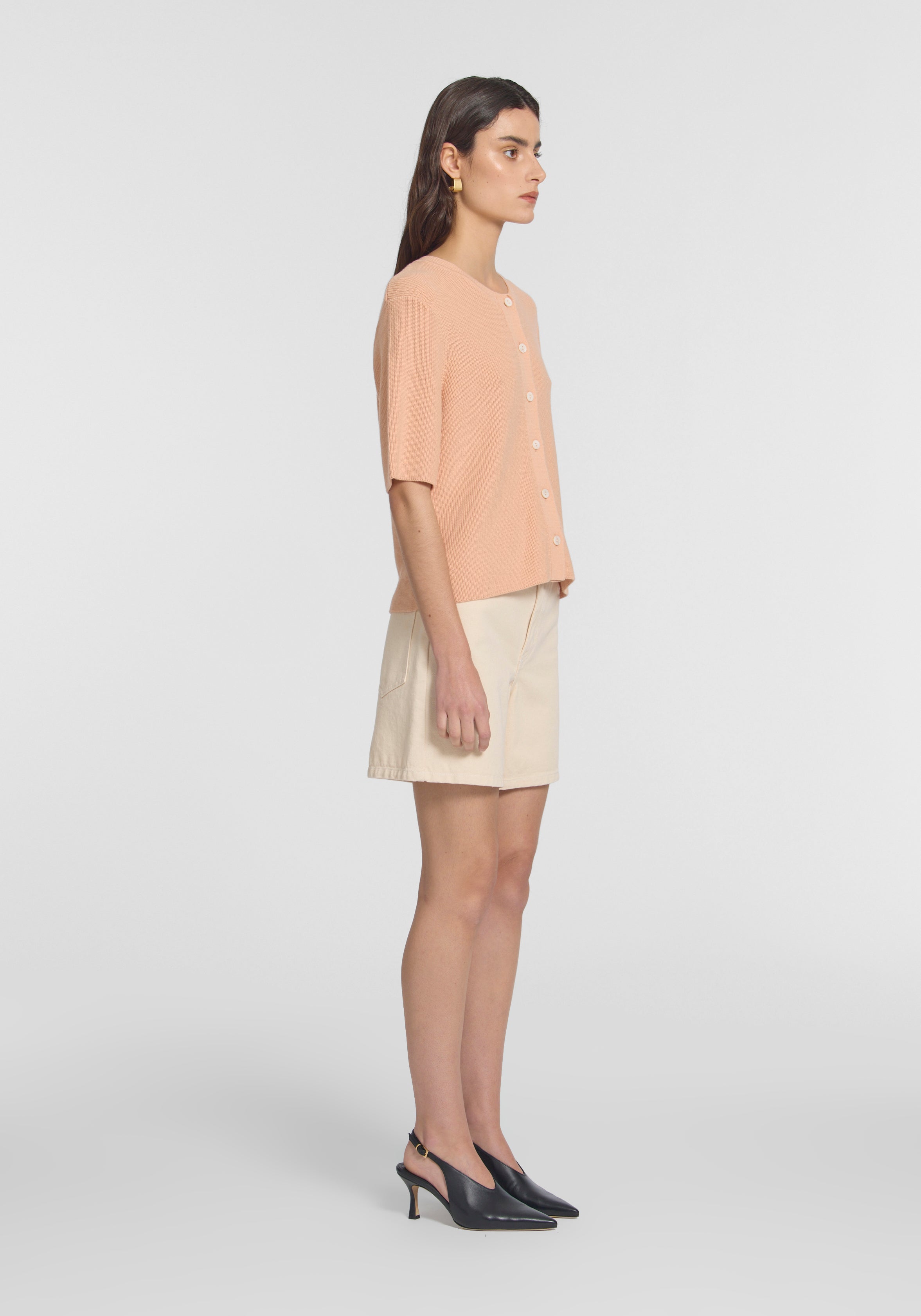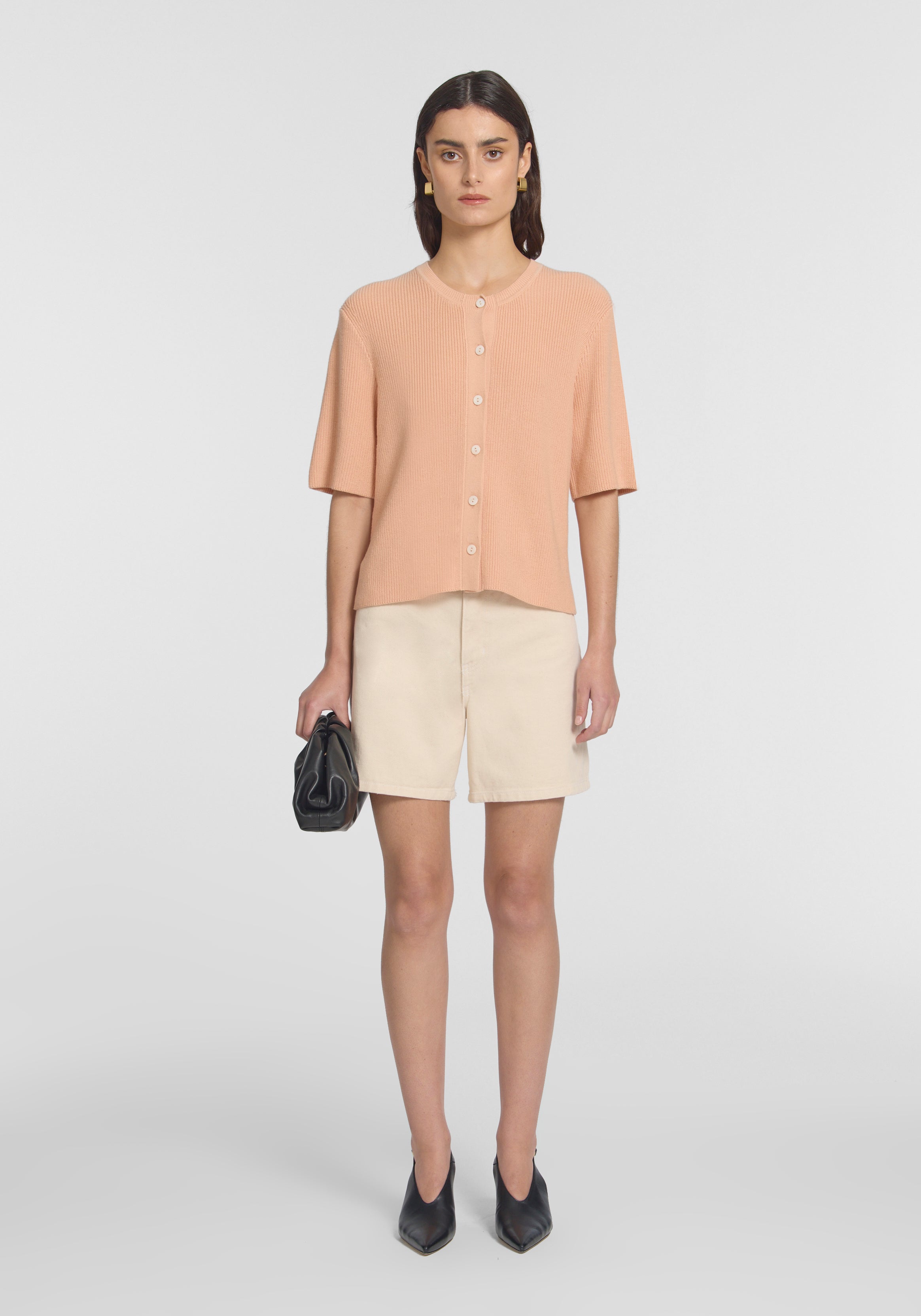 Radiate effortless elegance in the Violet Cardigan, crafted from a cotton-wool blend in a feminine apricot hue. Offering a gently relaxed fit, crew neckline, and side splits, it’s adorned with shell buttons for a versatile, enduring silhouette.