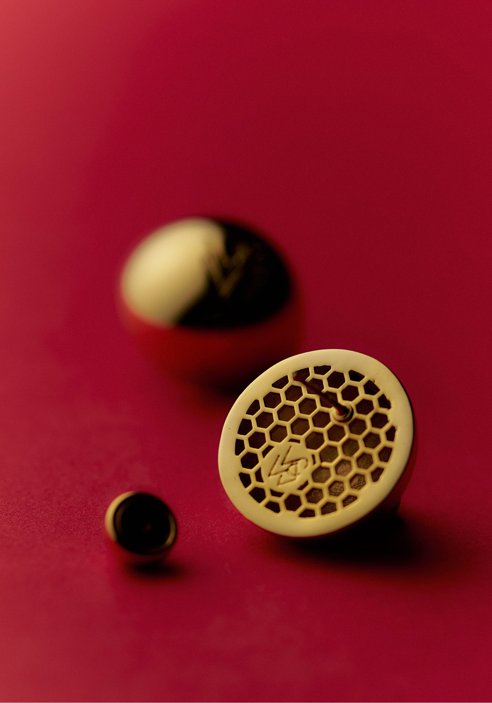 The V&W Dome Earrings, crafted in 16k plated gold, feature a statement dome shape with debossed V&W branding. Finished with a honeycomb partition on the back, they make a defining statement in modern, transitional elegance.