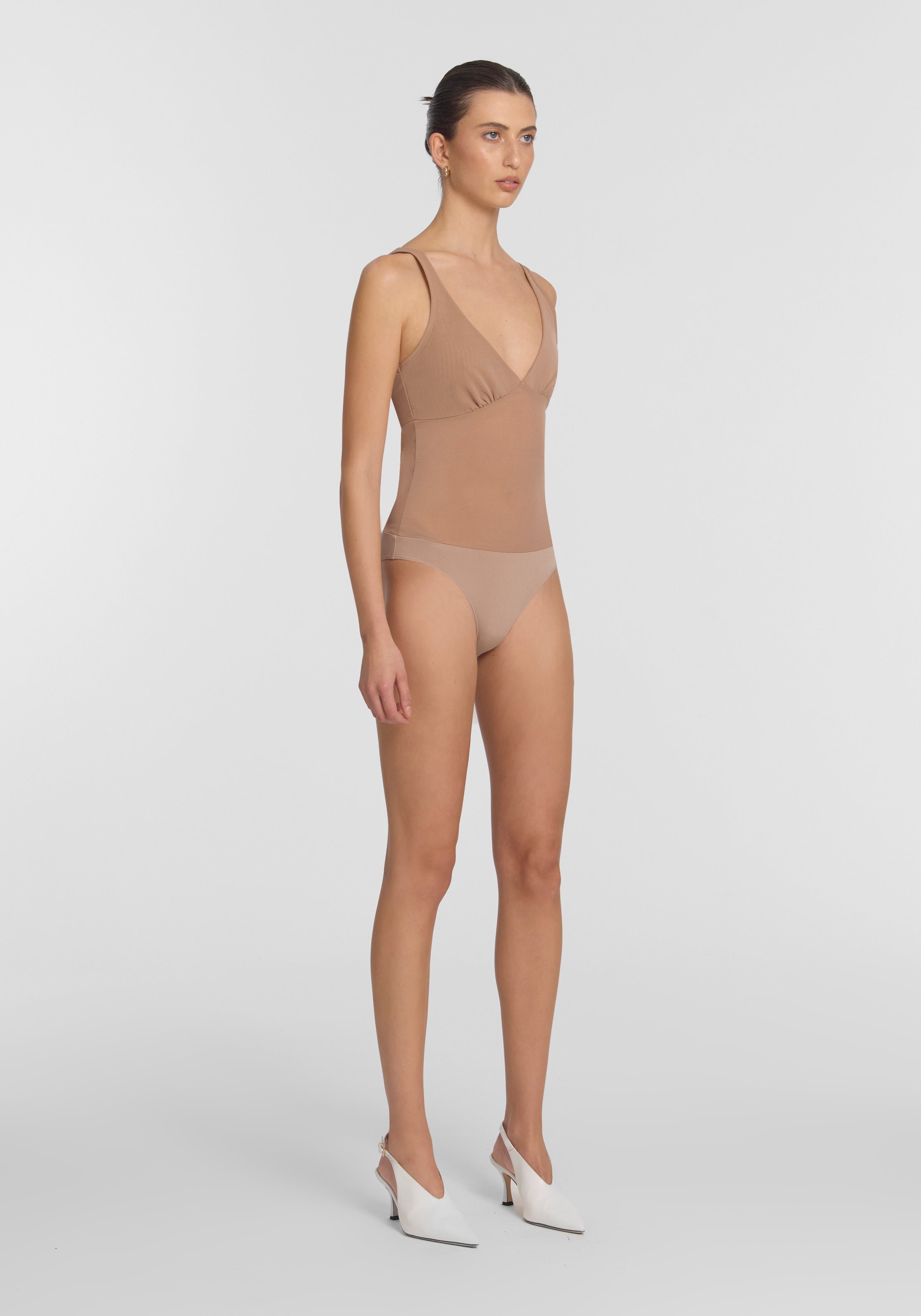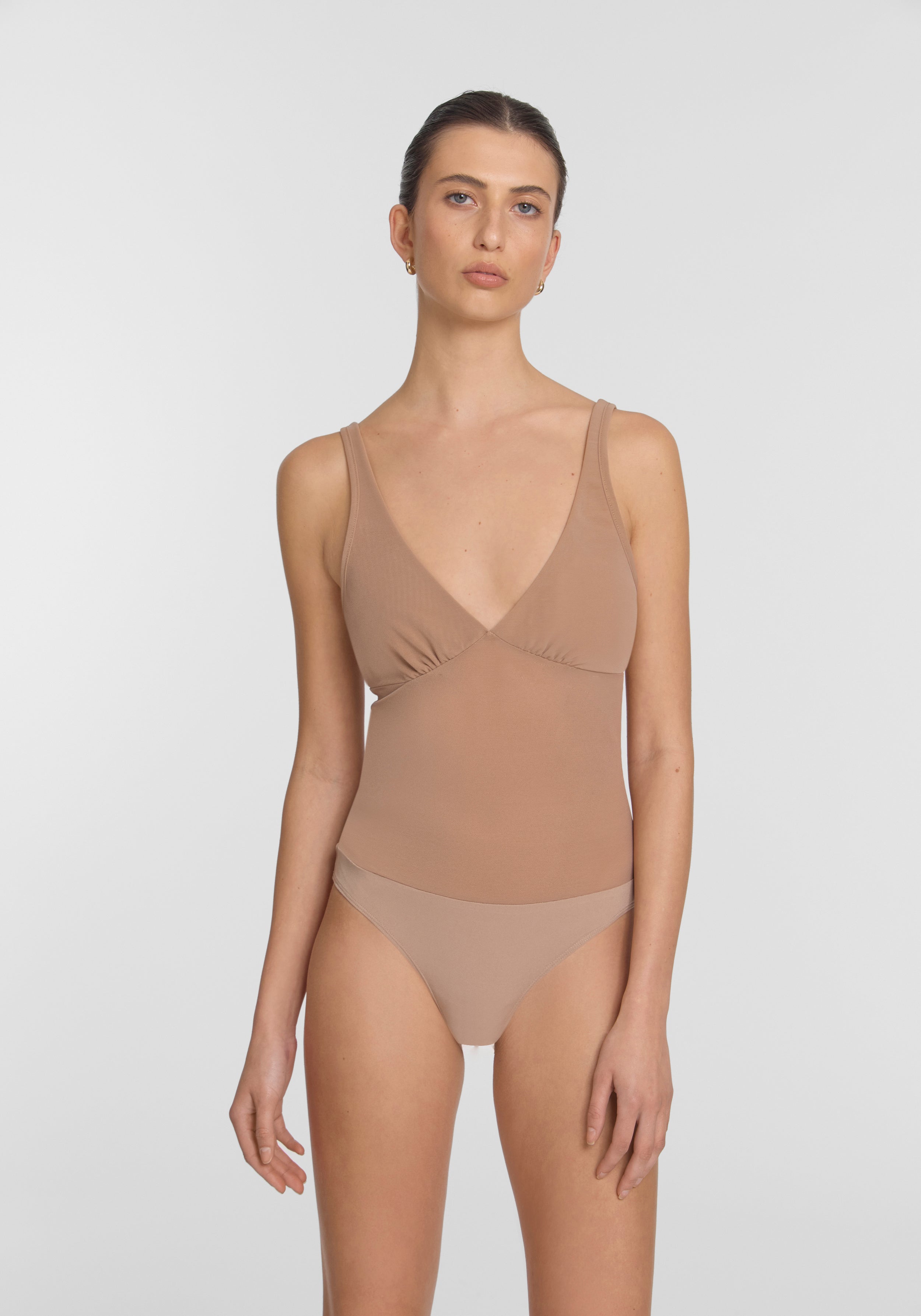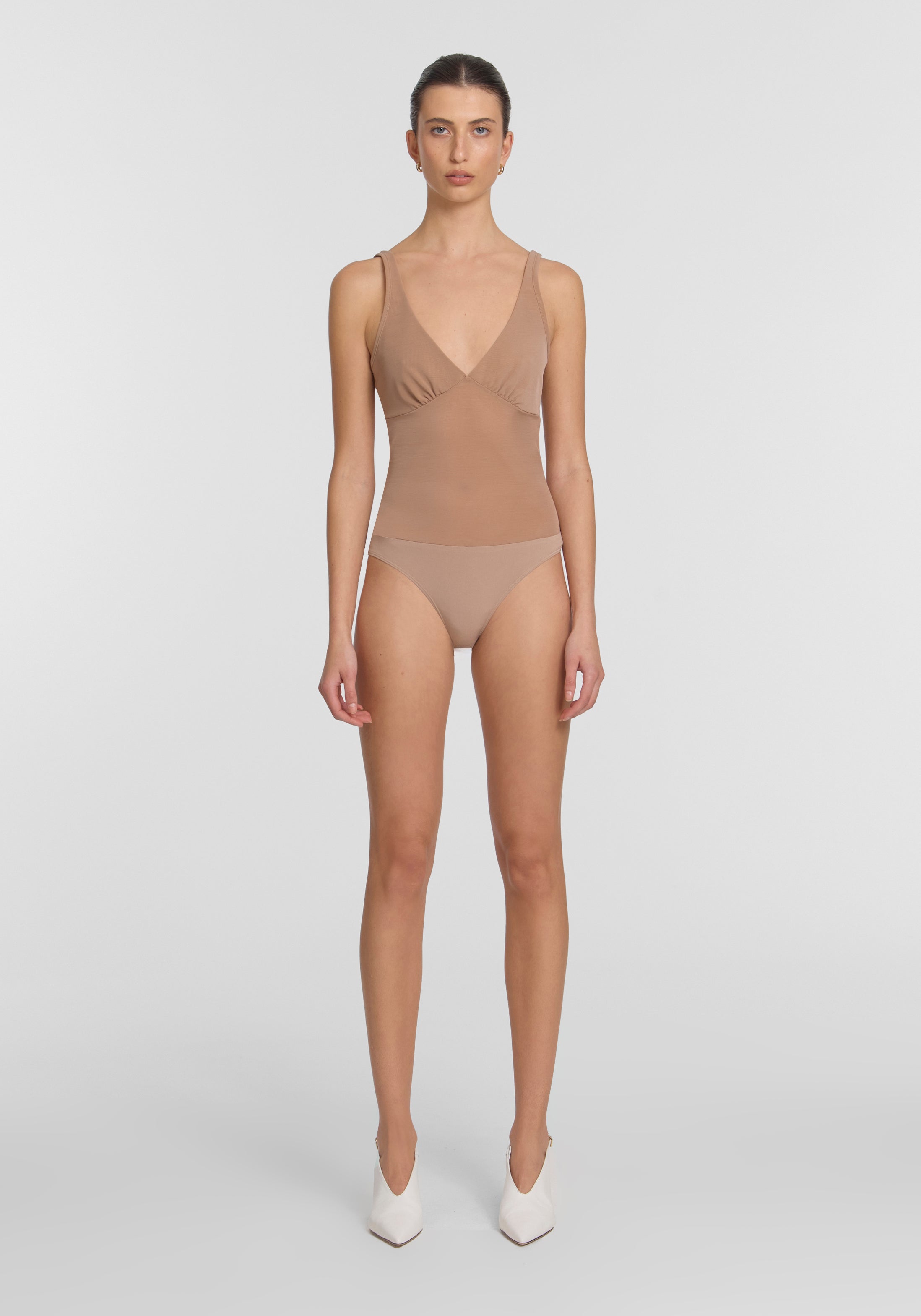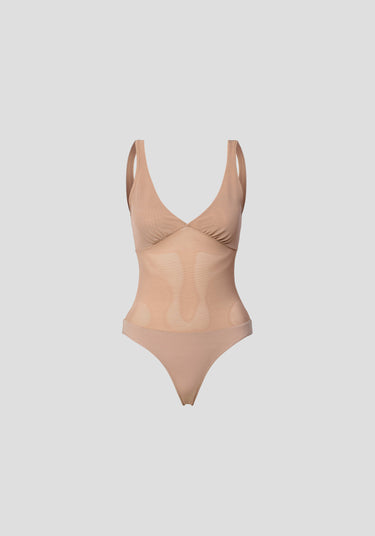 The V&W Foundation Bodysuit in nude, formed from our signature powermesh with a stretch jersey brief. Designed with an easy pull-on construction, it is double-layered through the bust and finished with a medium-coverage brief with snap fastening. Wear as a top or layer under sheer outfitting - a foundation piece for both statement and staple dressing.