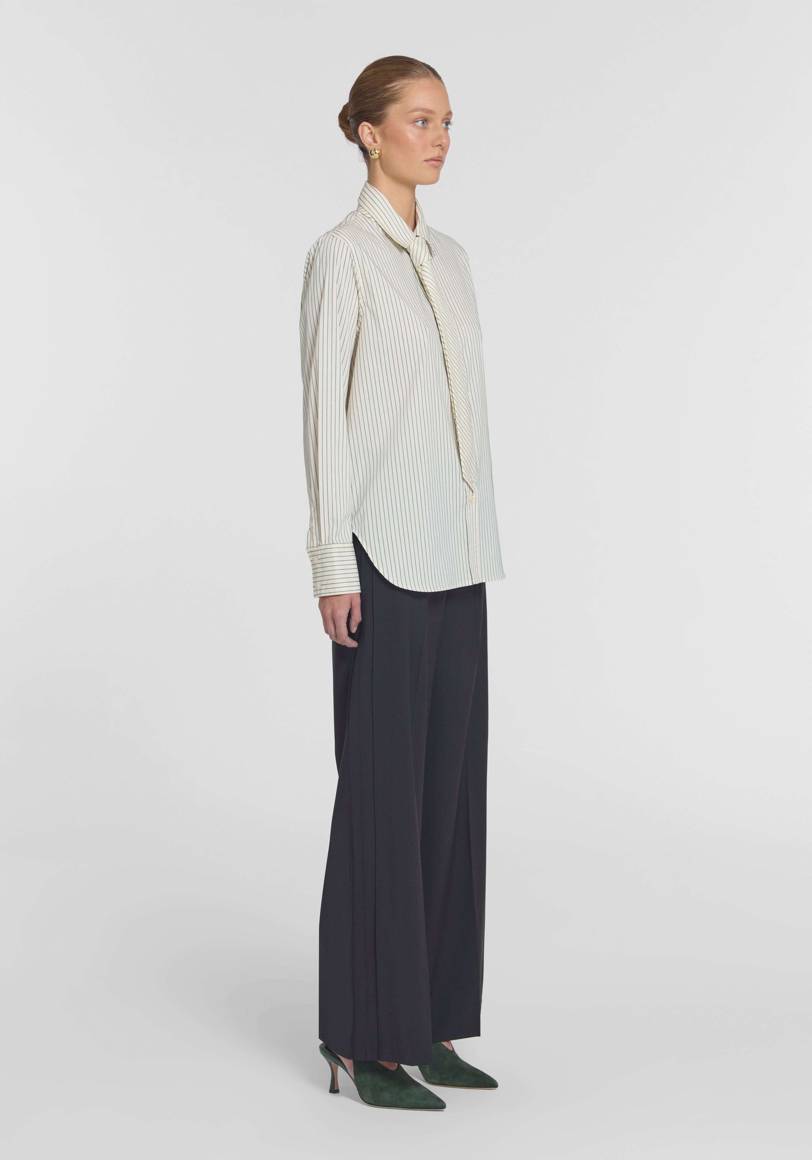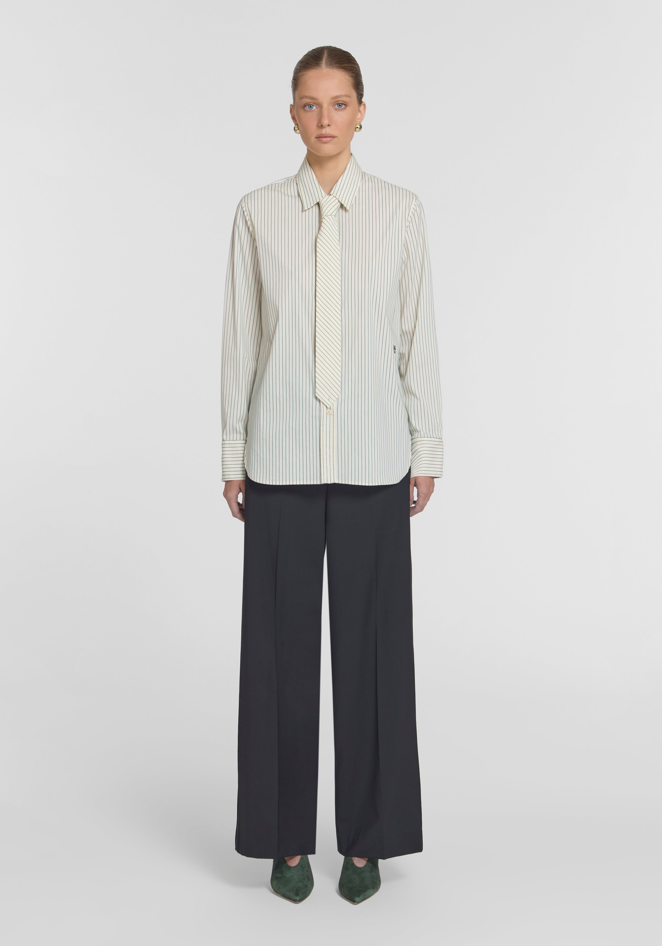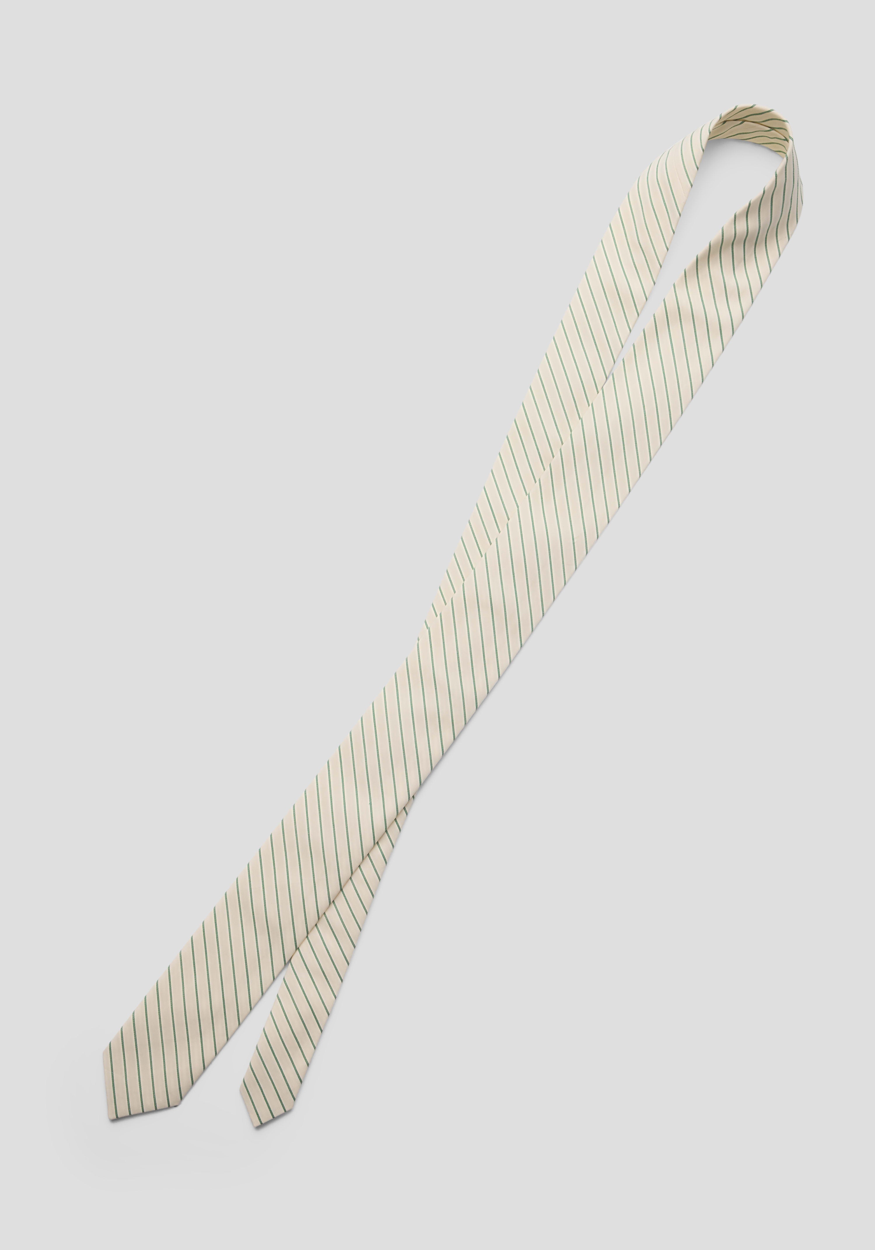 The V&W Tie, crafted from a cotton blend in a versatile green stripe, delivers corporate cool. With an androgynous attitude, it pairs with the Commandment Shirt for a modern expression of executive power, or adds a creative twist to any outfit.