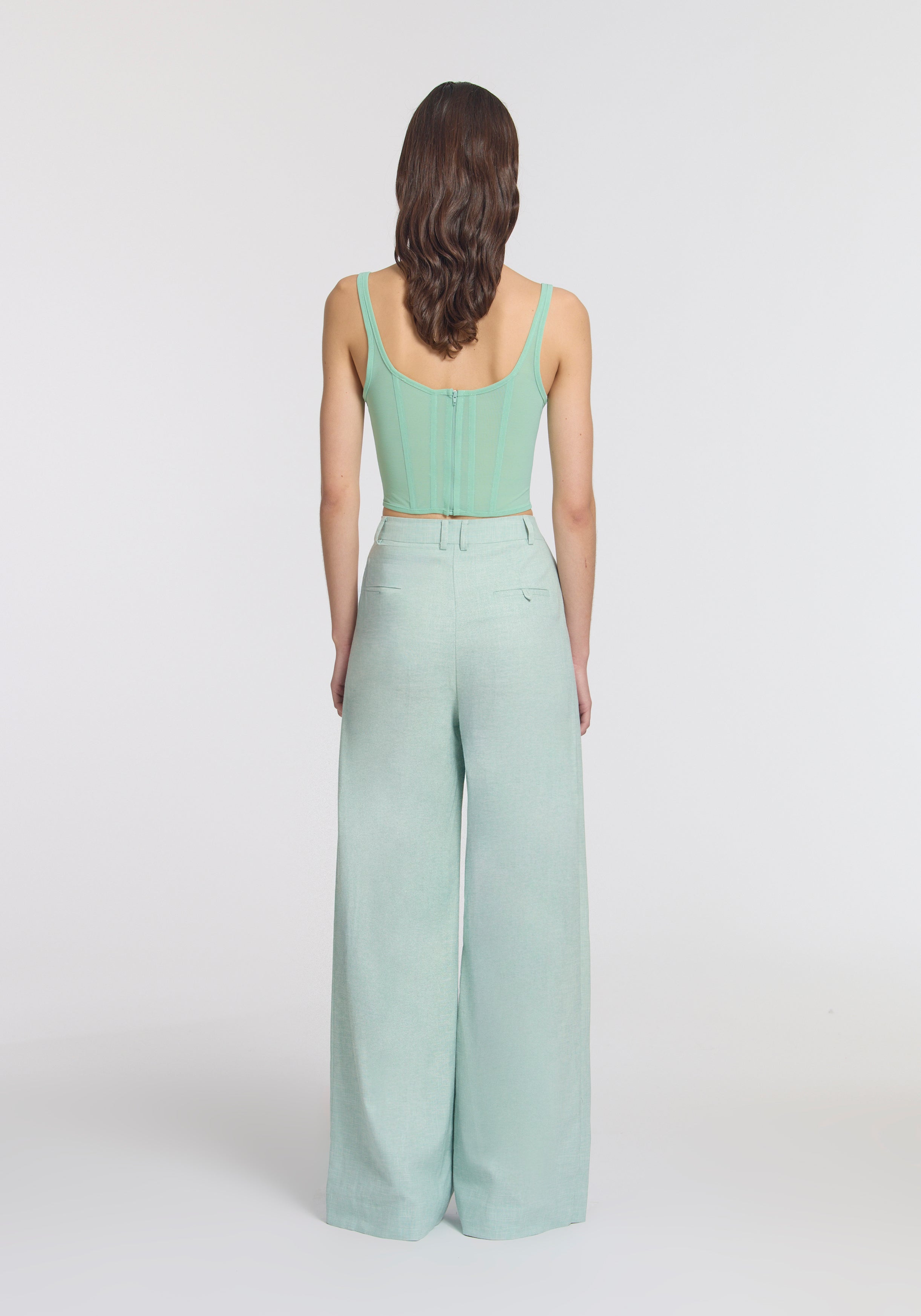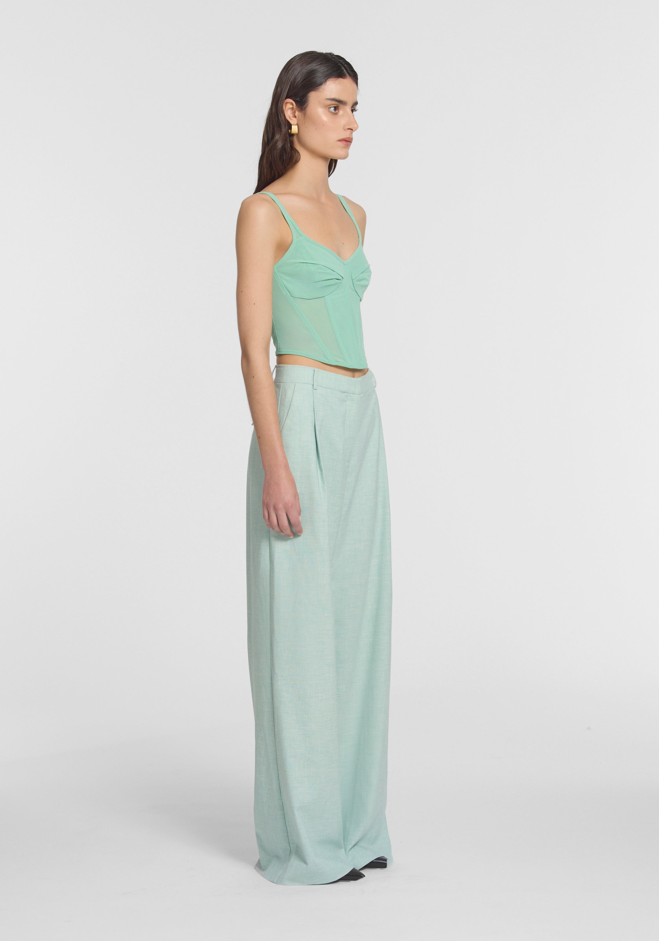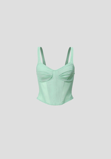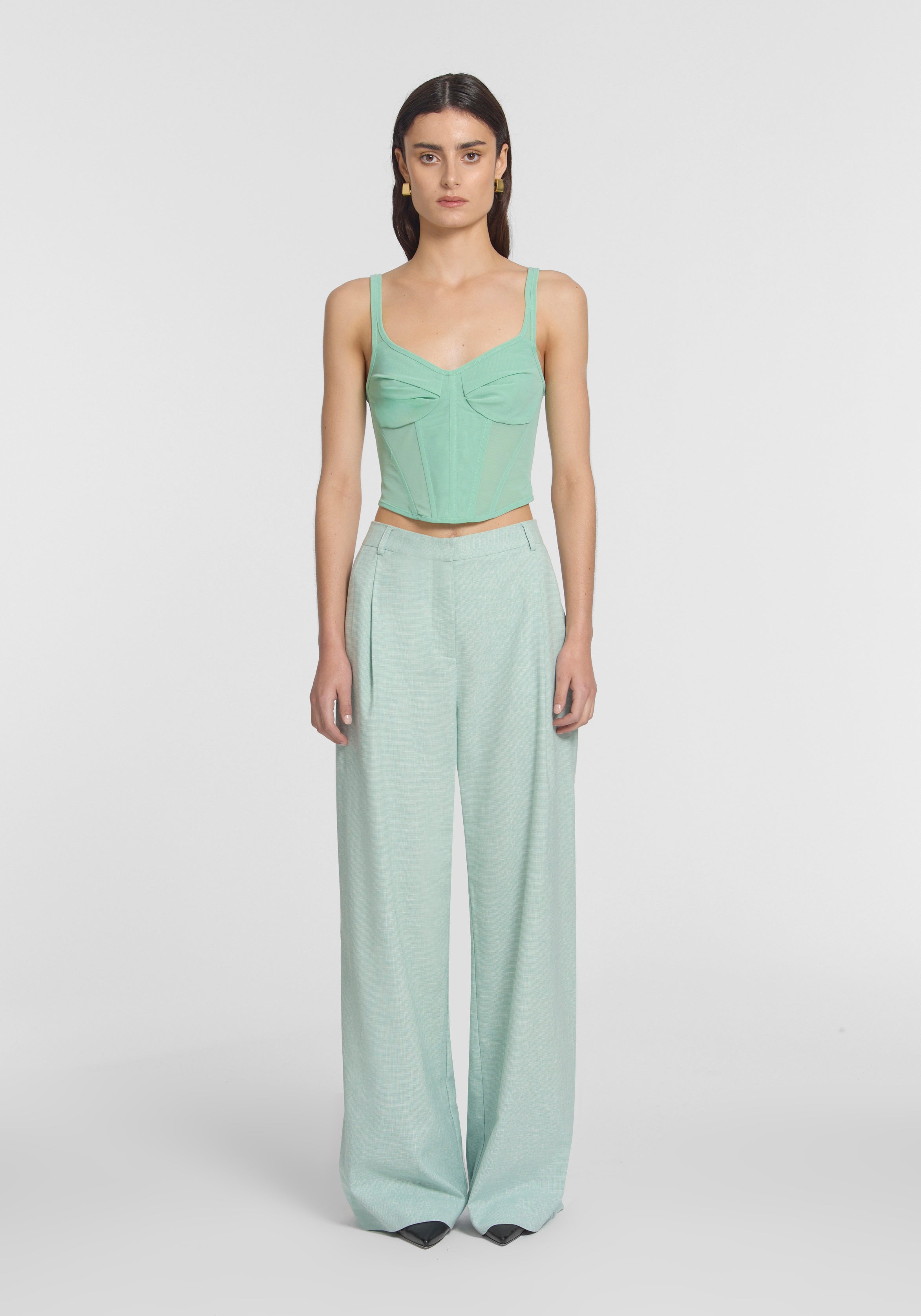 The Wanderlust Bustier, crafted from signature V&W powermesh in a refreshing mint hue, brings a cool burst of vibrancy to occasion dressing. Featuring a sweetheart neckline with pleated bust cups, panelled boning, and a softly curved hem, it creates a flattering, sculpted silhouette. Complete the look with the Roxbury Trouser and Paradox Blazer for a striking all mint moment.