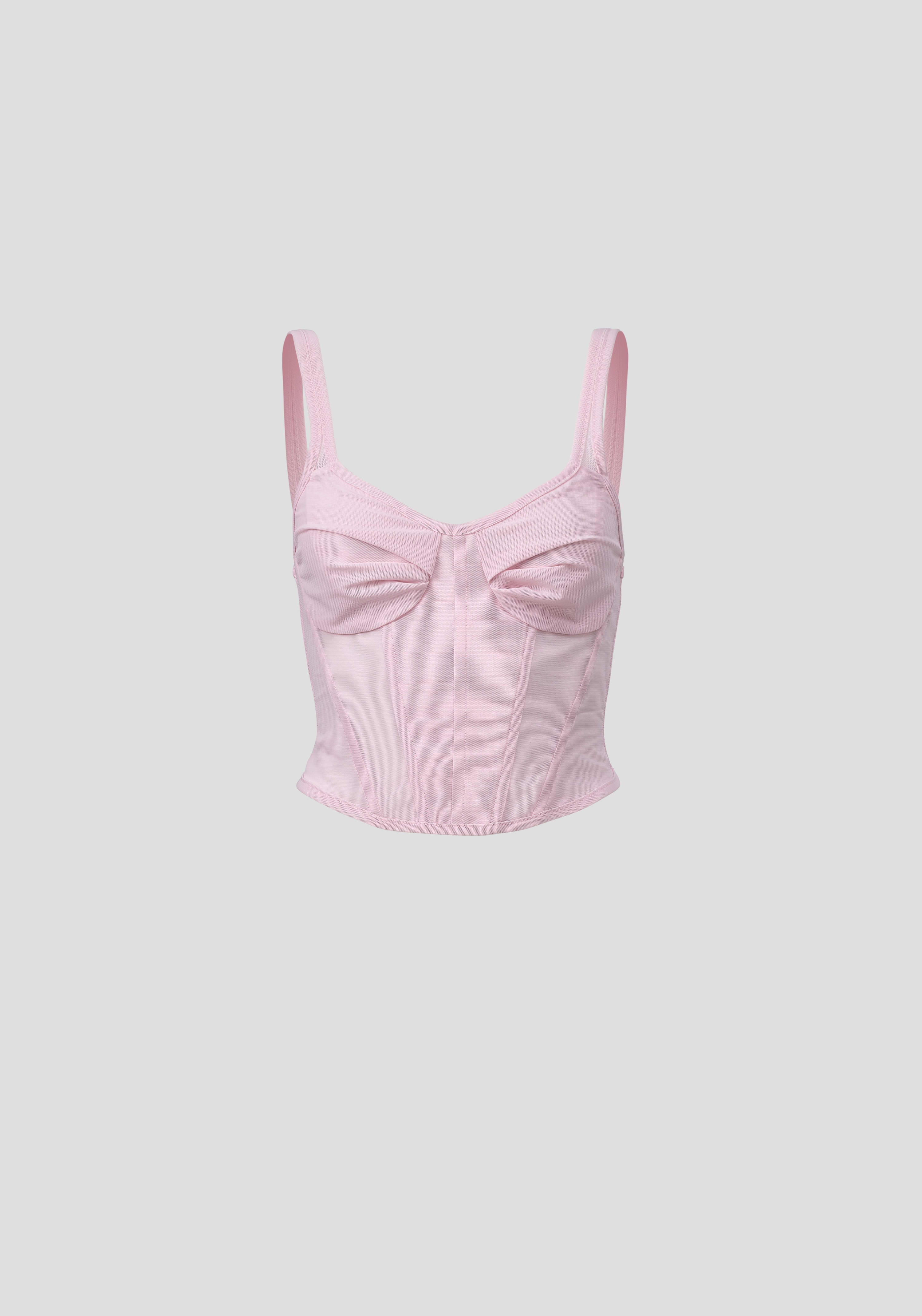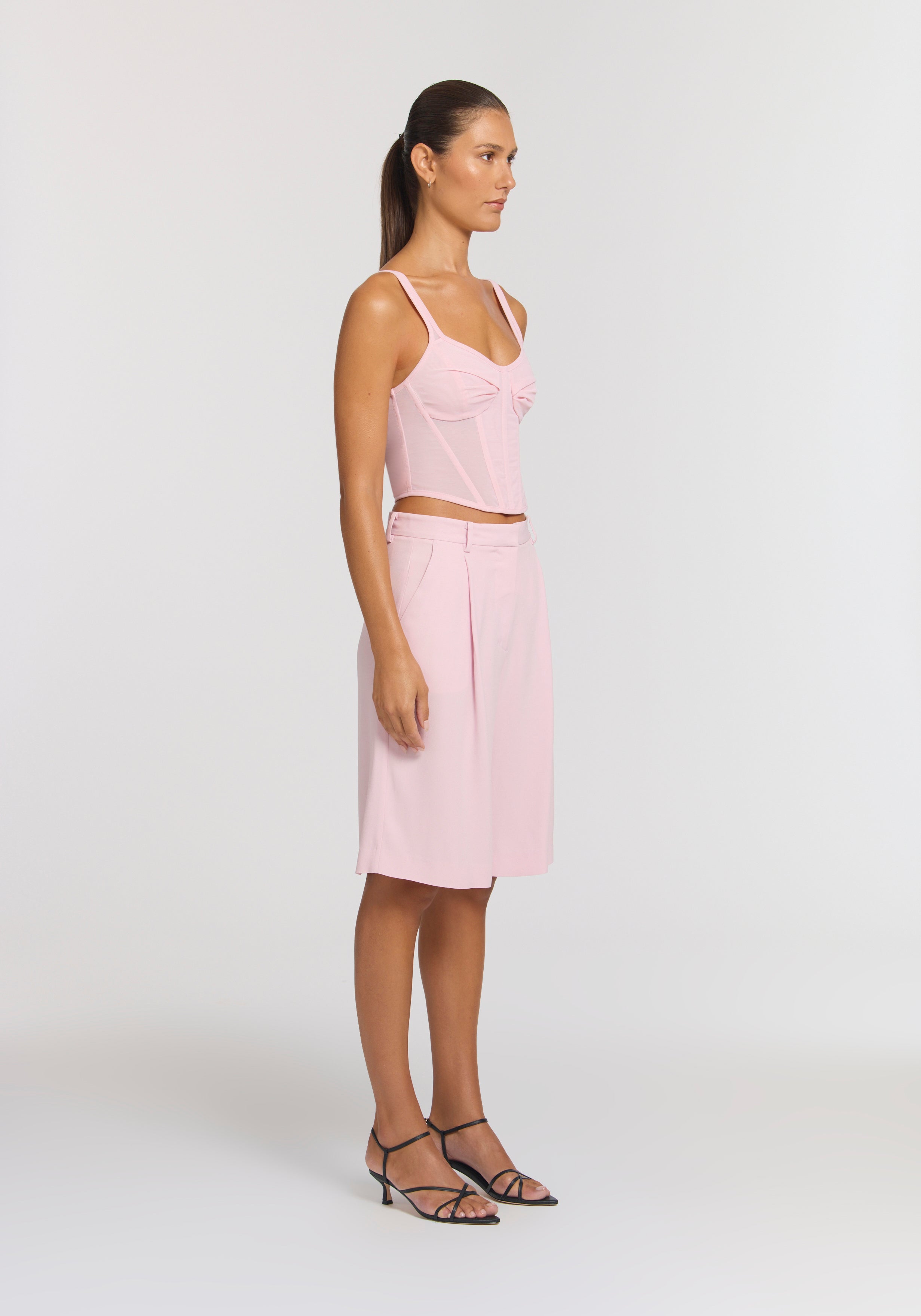 The Wanderlust Bustier, crafted from signature V&W powermesh in rosewater pink, redefines occasion dressing with considered elegance. Featuring a sweetheart neckline with pleated bust cups, panelled boning, and a softly curved hem, it creates a flattering, sculpted silhouette. Complete the look with the Monologue Short and Bombshell Blazer for a summer suiting moment that makes a statement.