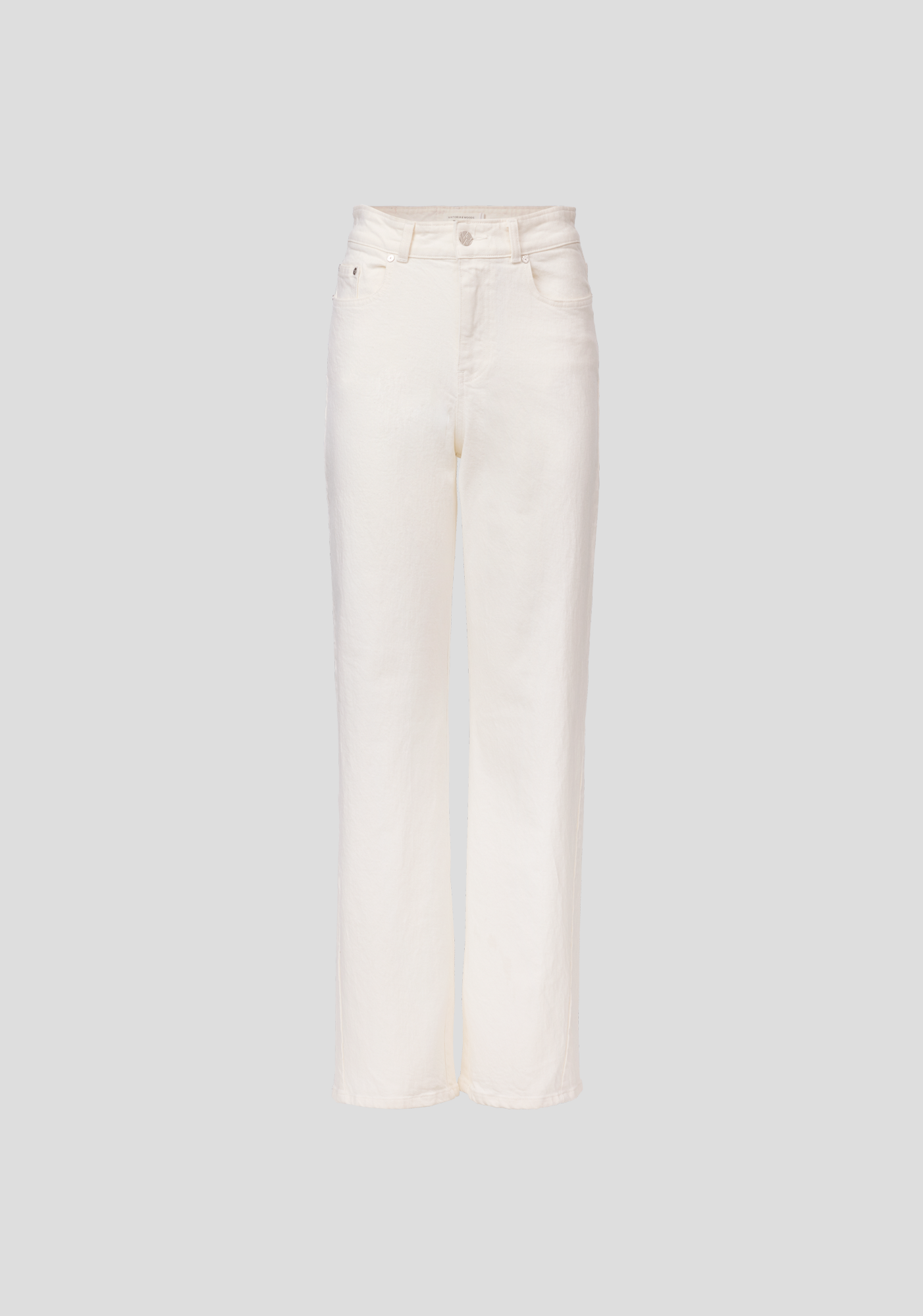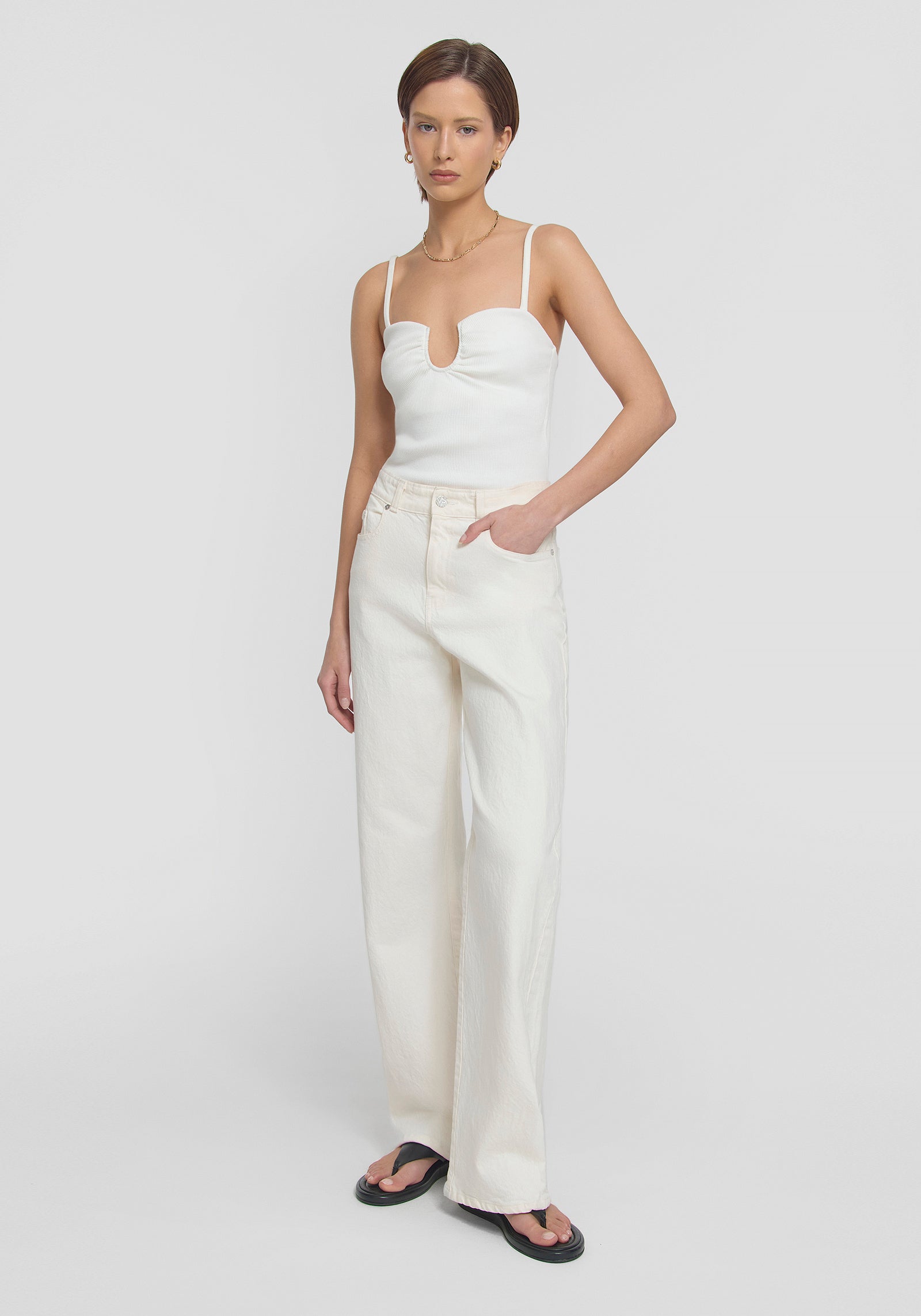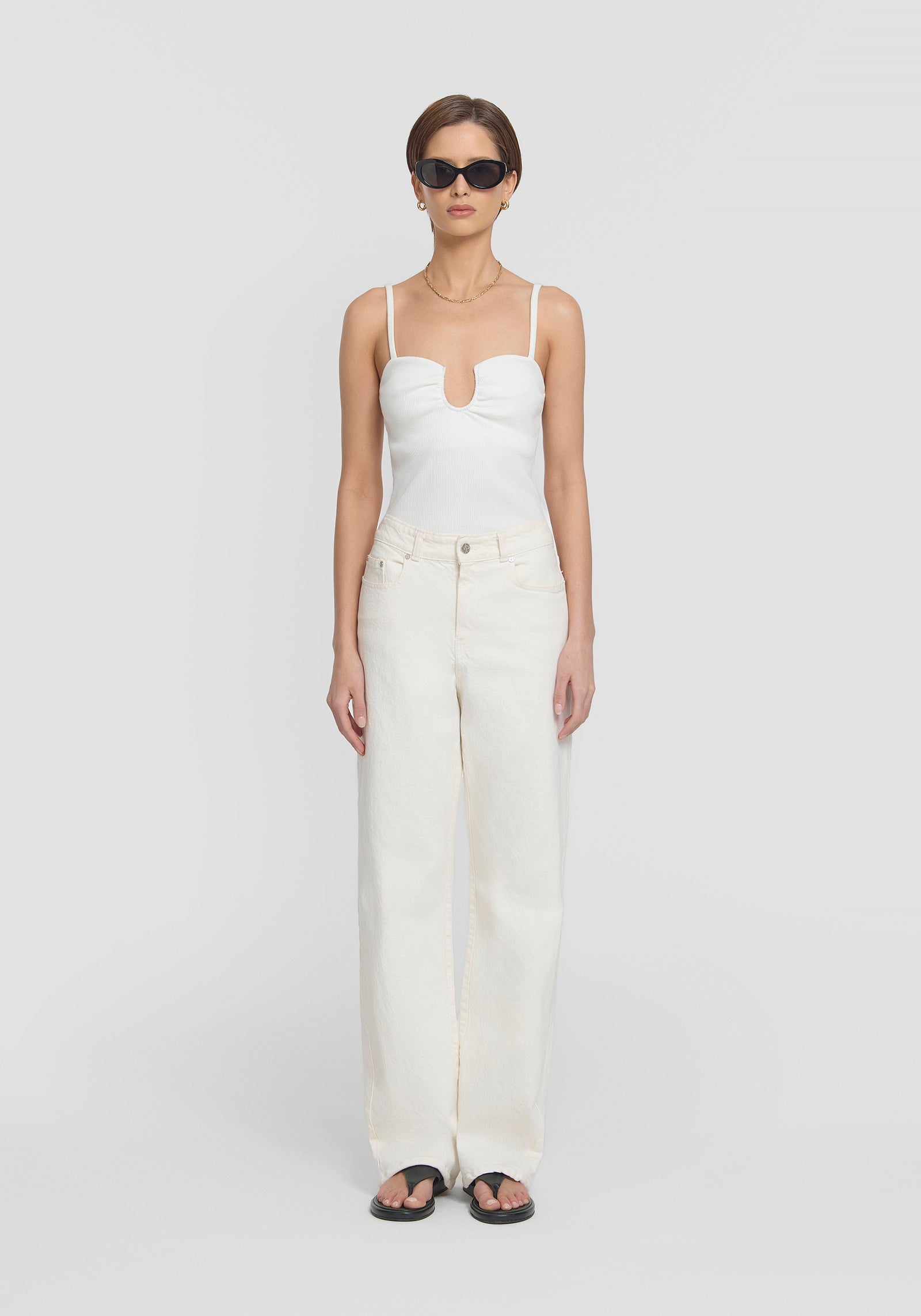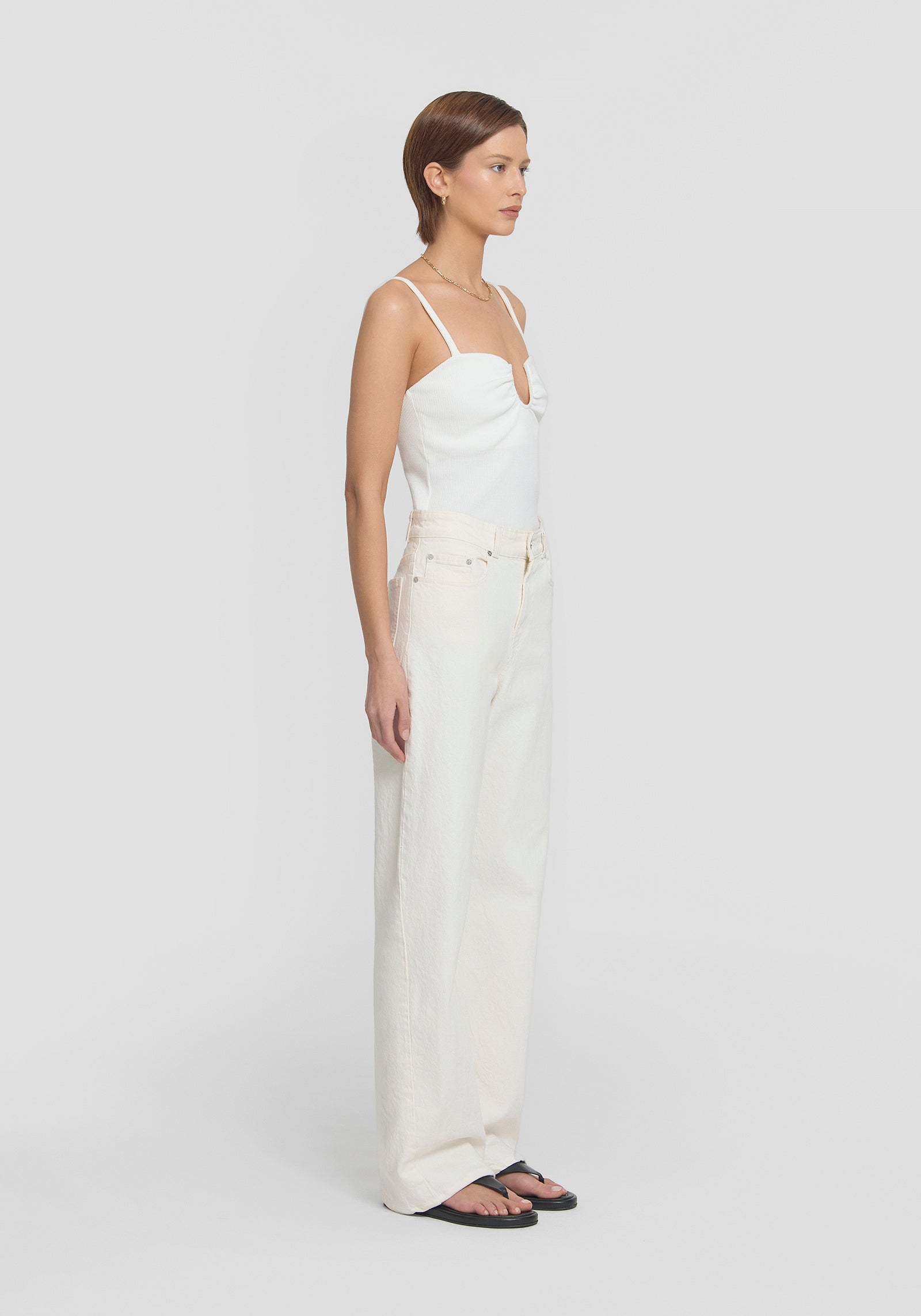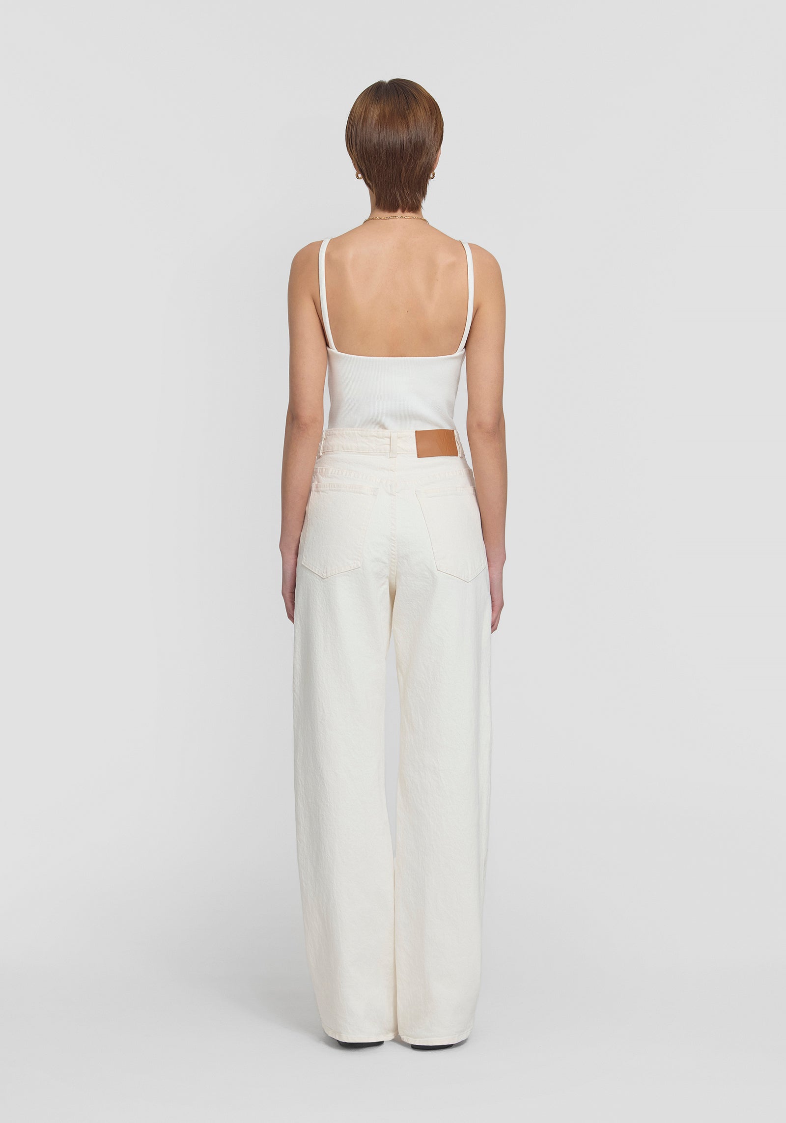 Embrace light denim this season with the Waylon Jean, crafted from ivory stretch denim. Boasting a high-rise, straight-leg fit, they feature a forward seam at the hem and are adorned with a tan logo leather patch and logo buttons. Effortlessly versatile, they pair perfectly with your everyday essentials for a chic summer look.
