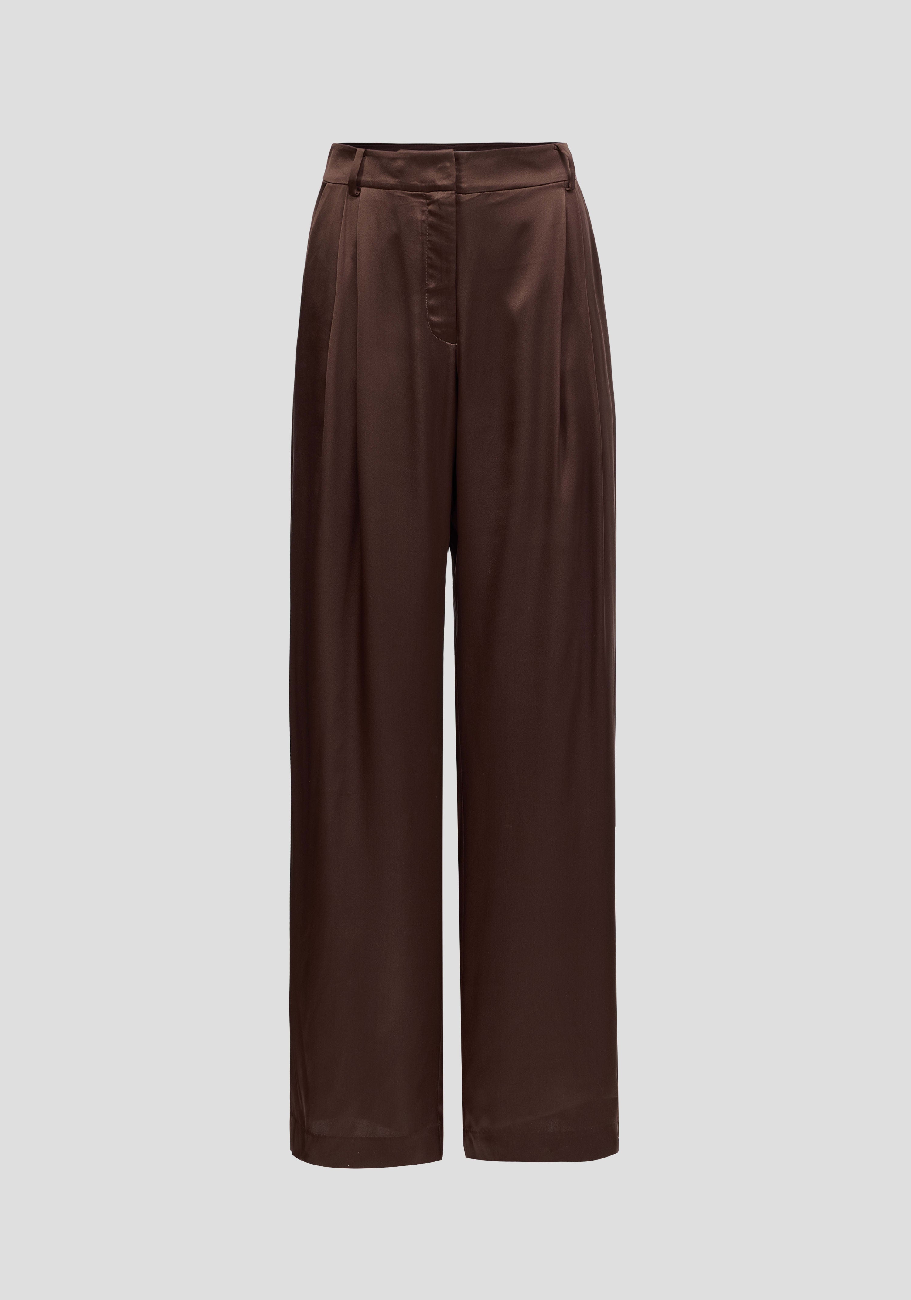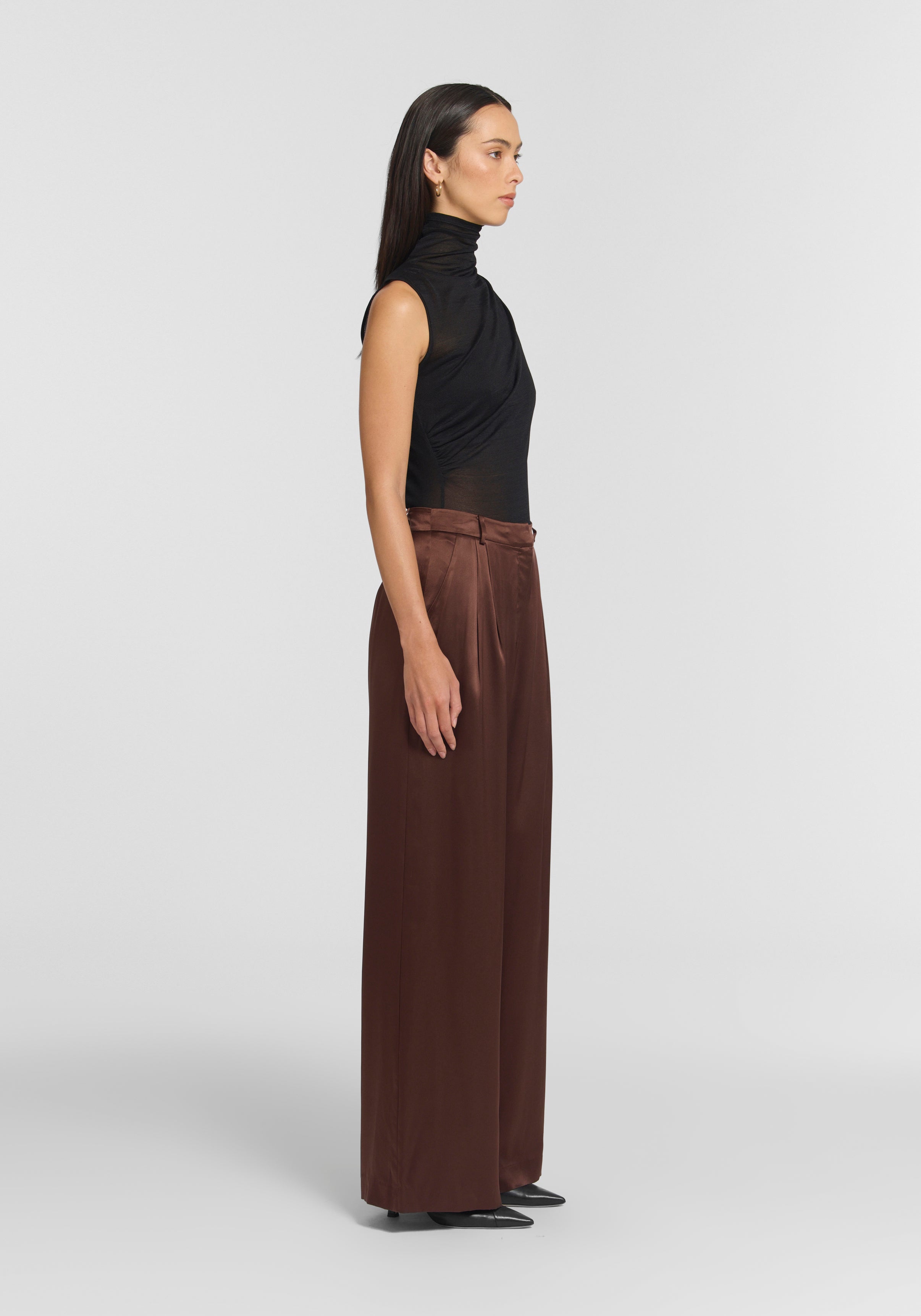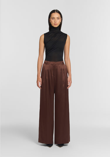 Offering fluid elegance and timeless appeal, the Whirlwind Pant is crafted from a rich chocolate silk. Featuring a palazzo silhouette and a tailored waistband with belt loops, it’s accentuated with refined double pleats and back darts. Complete the look with the Revere Top for an elegant set that exudes understated opulence.