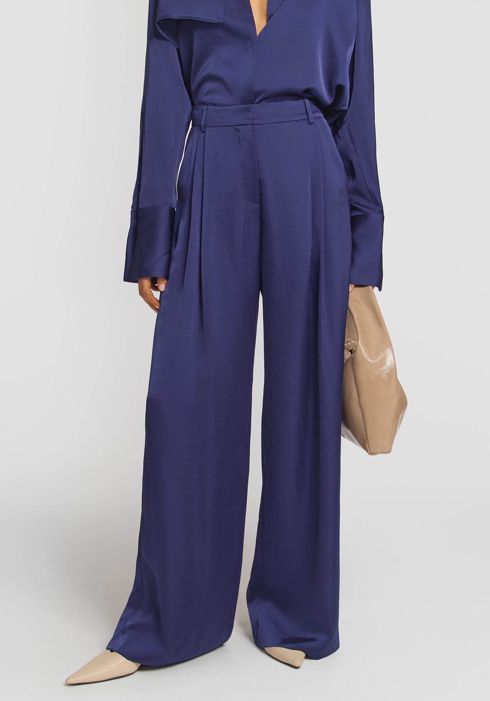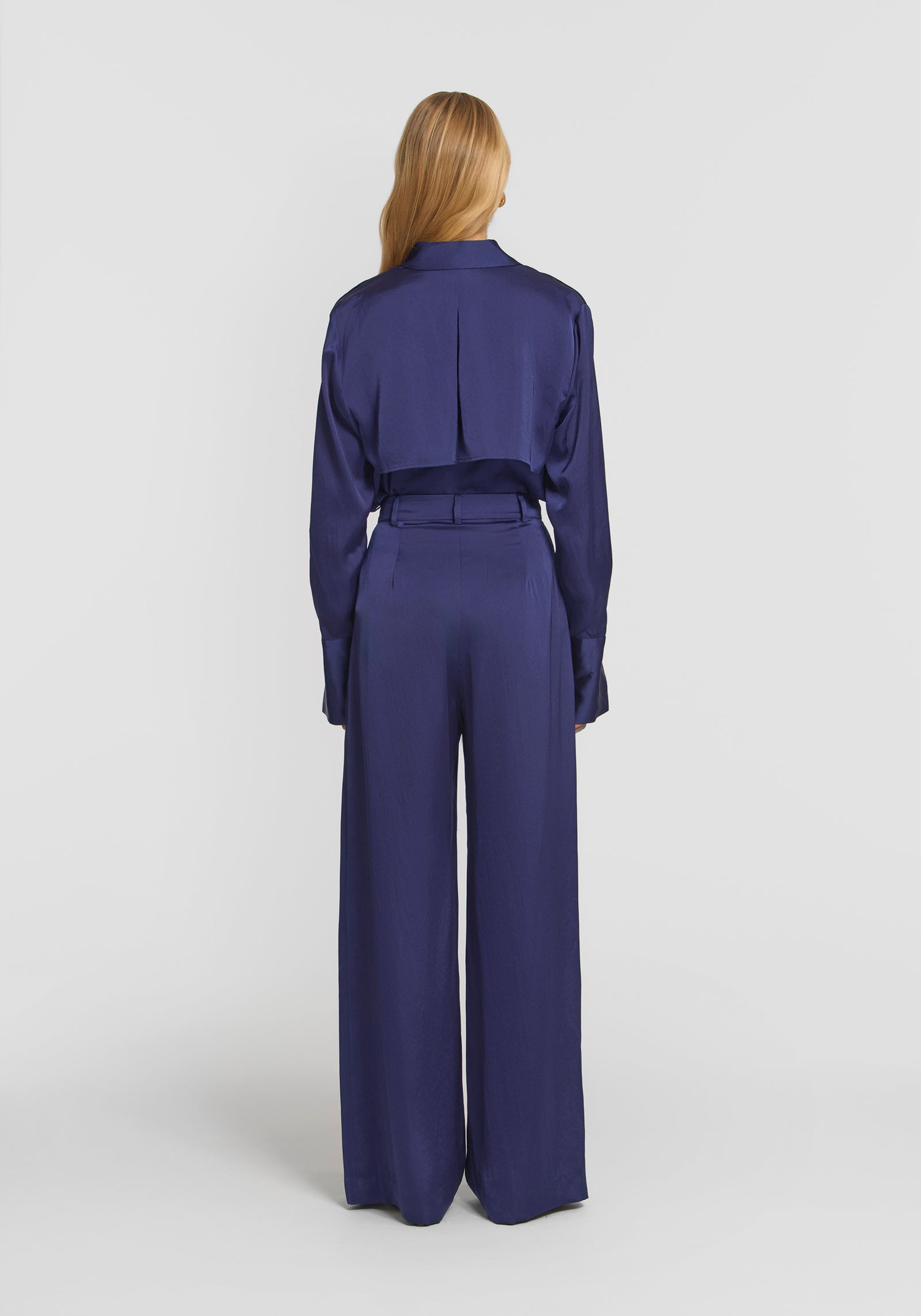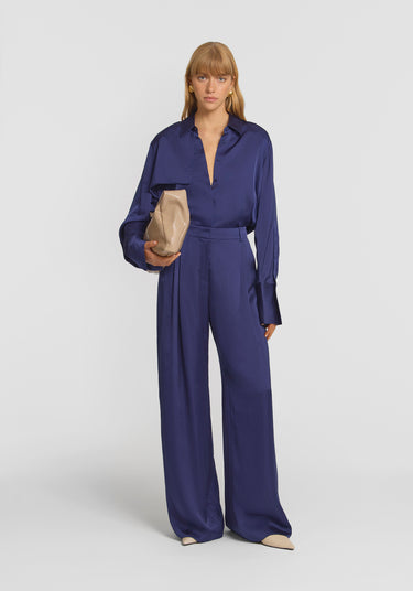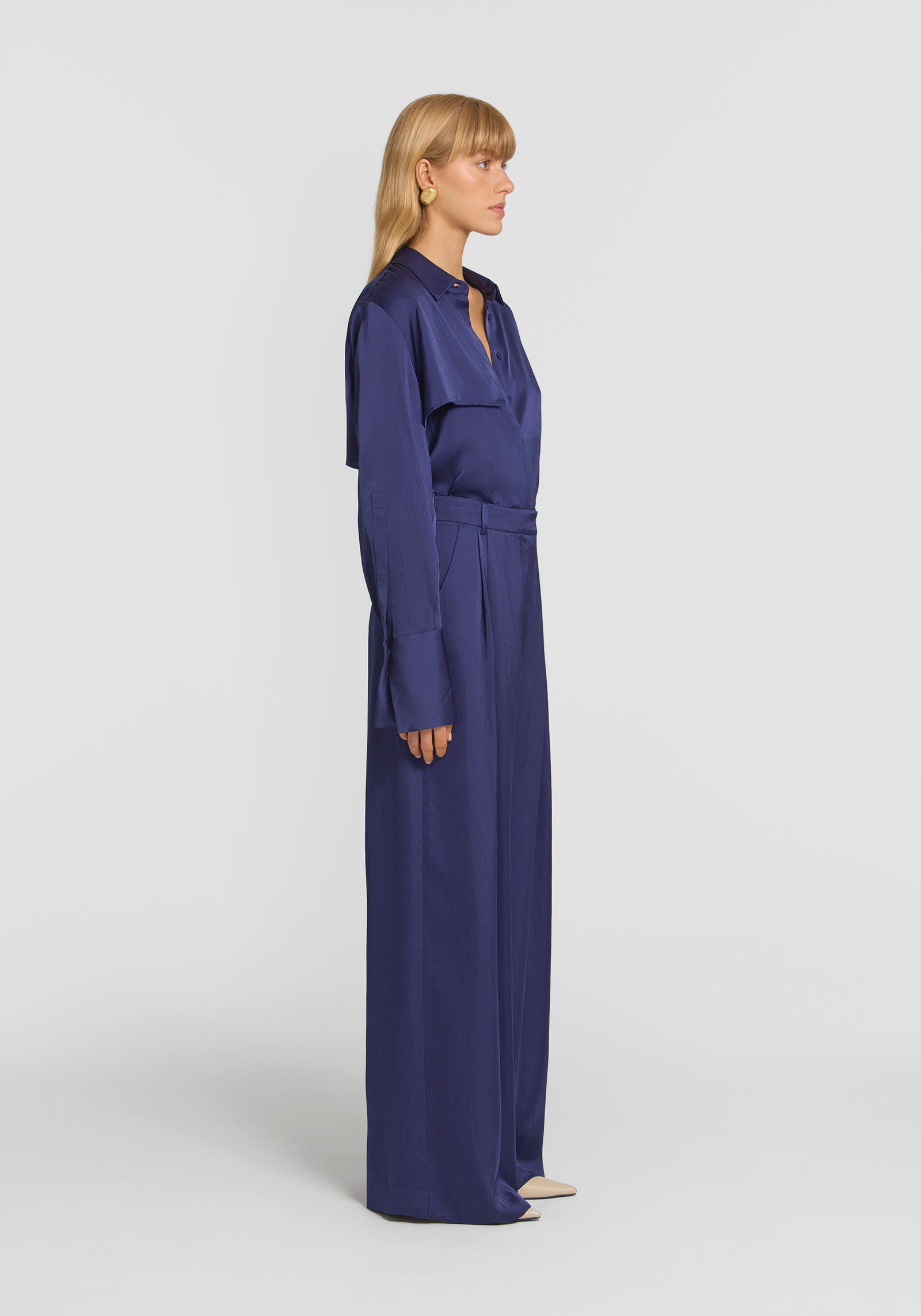 Offering fluid elegance and timeless appeal, the Whirlwind Pant is crafted from a deep blue cupro blend. Featuring a palazzo silhouette and a tailored waistband with belt loops, it’s accentuated with refined double pleats and back darts. Complete the look with the Formation Shirt or Moonlight Skivvy for an elegant set that exudes understated opulence.