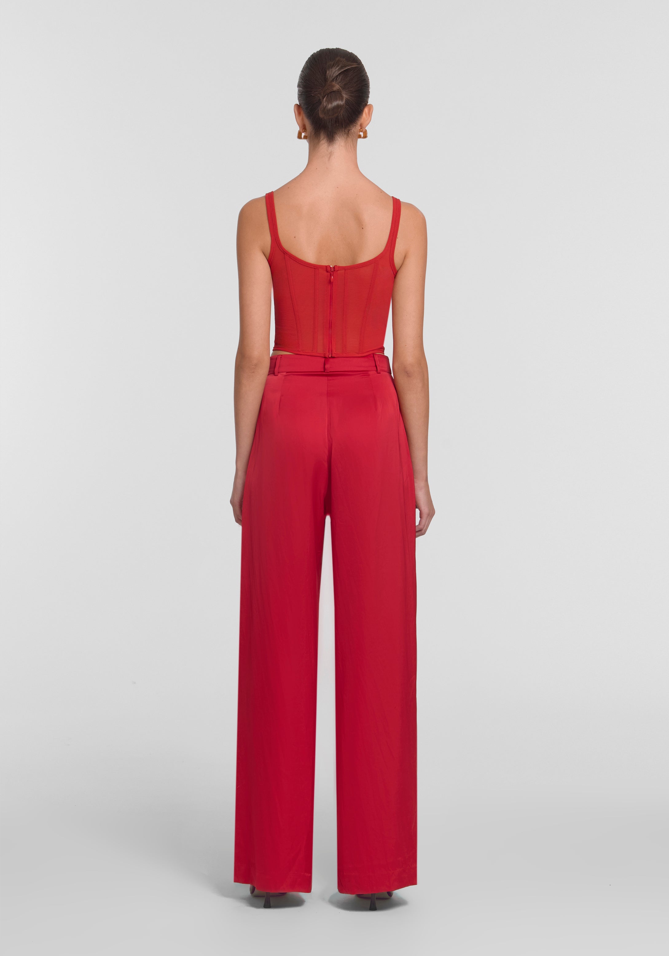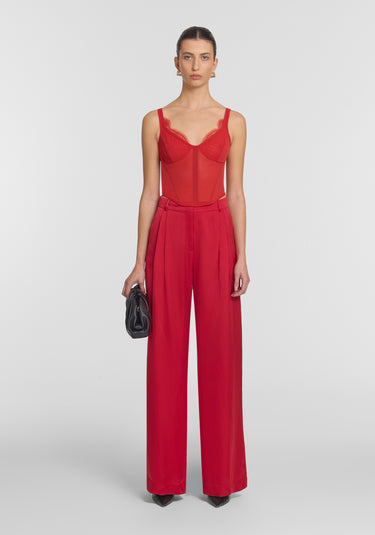 Offering fluid elegance and timeless appeal, the Whirlwind Pant is crafted from a fiery red cupro blend. Featuring a palazzo silhouette and a tailored waistband with belt loops, it’s accentuated with refined double pleats and back darts. Complete the look with this seasons red pieces for a chic, coordinated statement.
