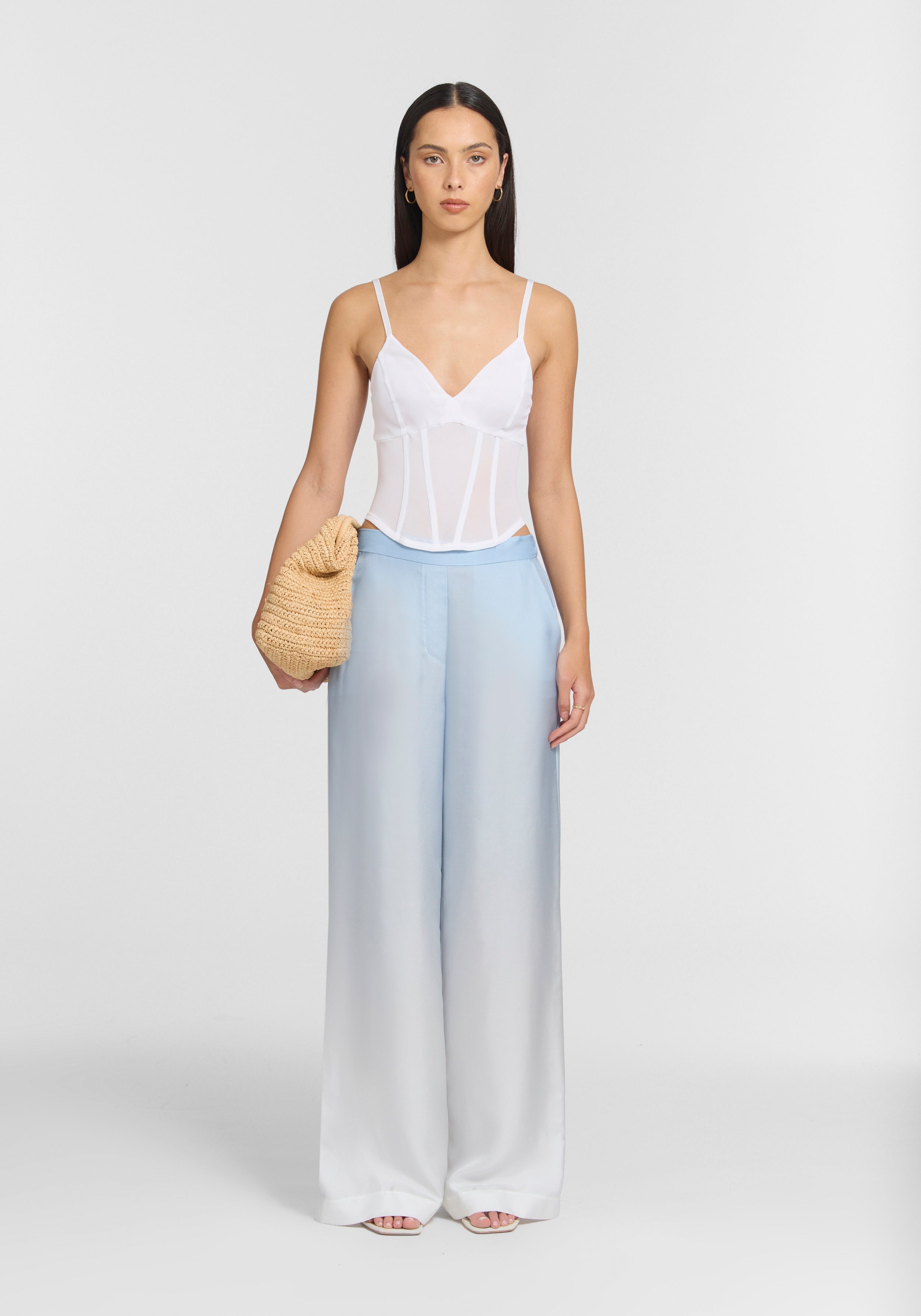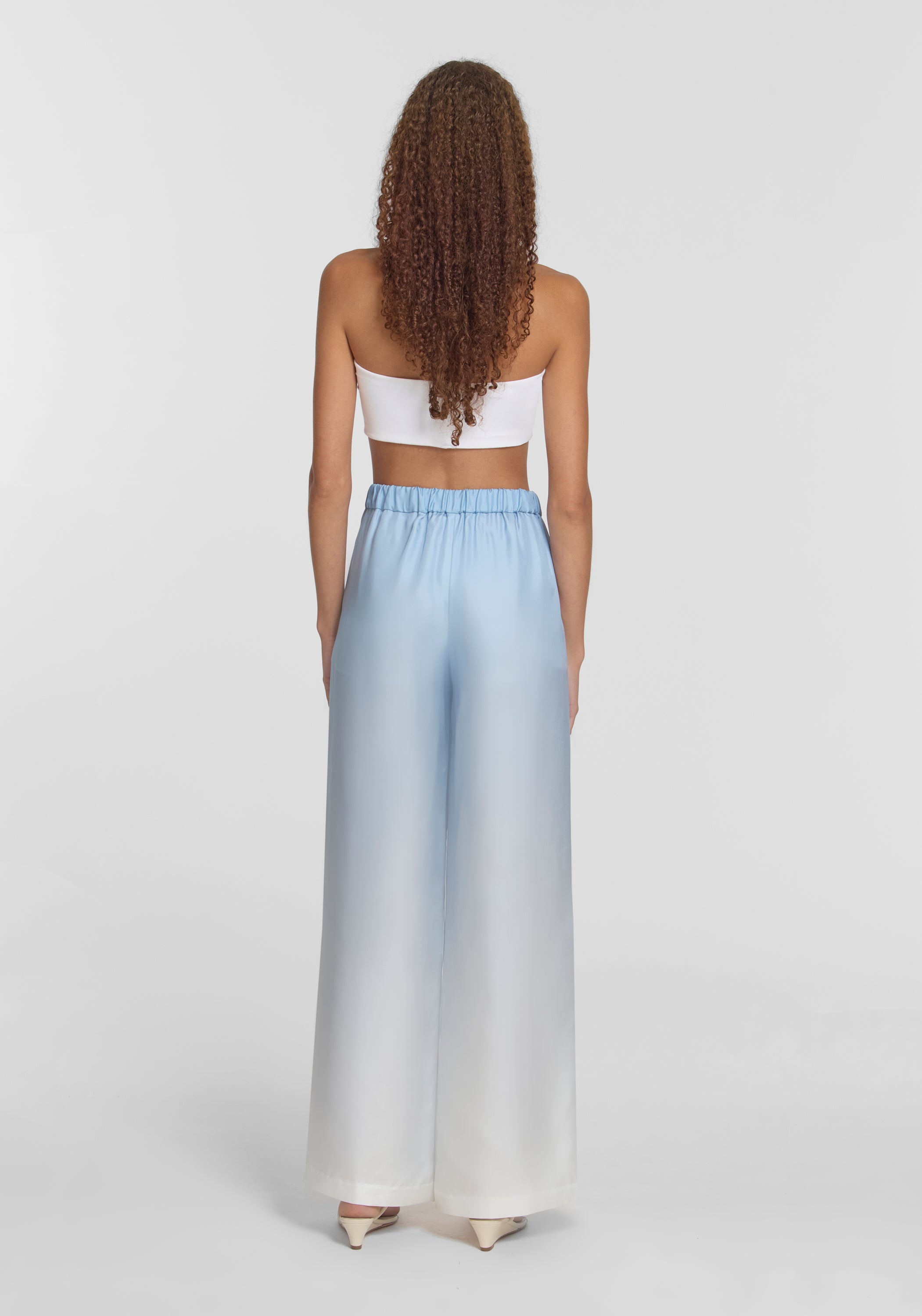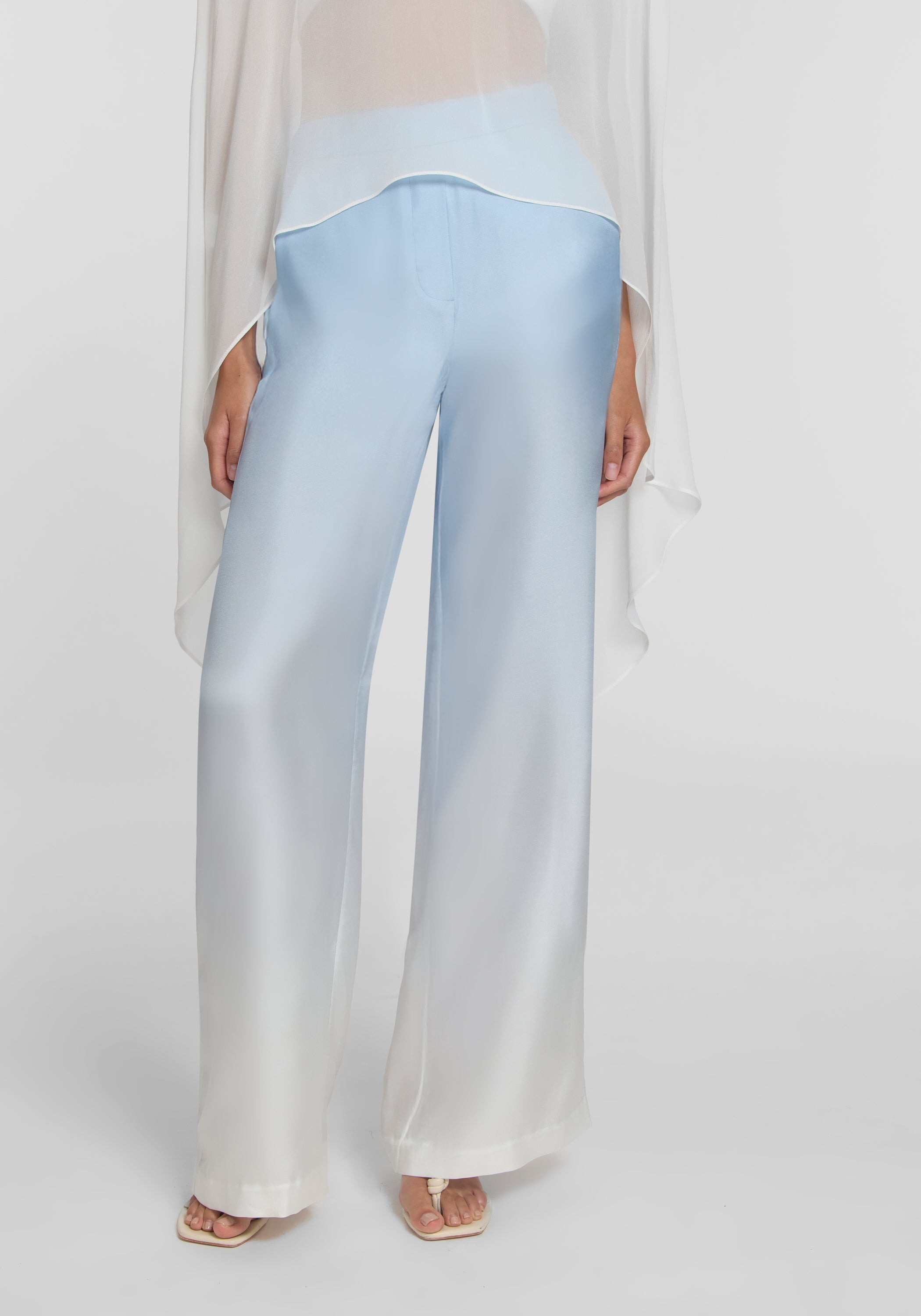 The Willow Pant is crafted from luxurious, weightless silk and realised in a soft blue ombre print, echoing the waves of the sea. Designed in a mid-rise, straight-leg silhouette, it features a flat front waistband, elasticated back, pockets, and a fluid drape that moves effortlessly. Style with the Rosemary Top for a refreshing statement grounded in quiet luxury, offering considered ease and a serene, modern attitude.