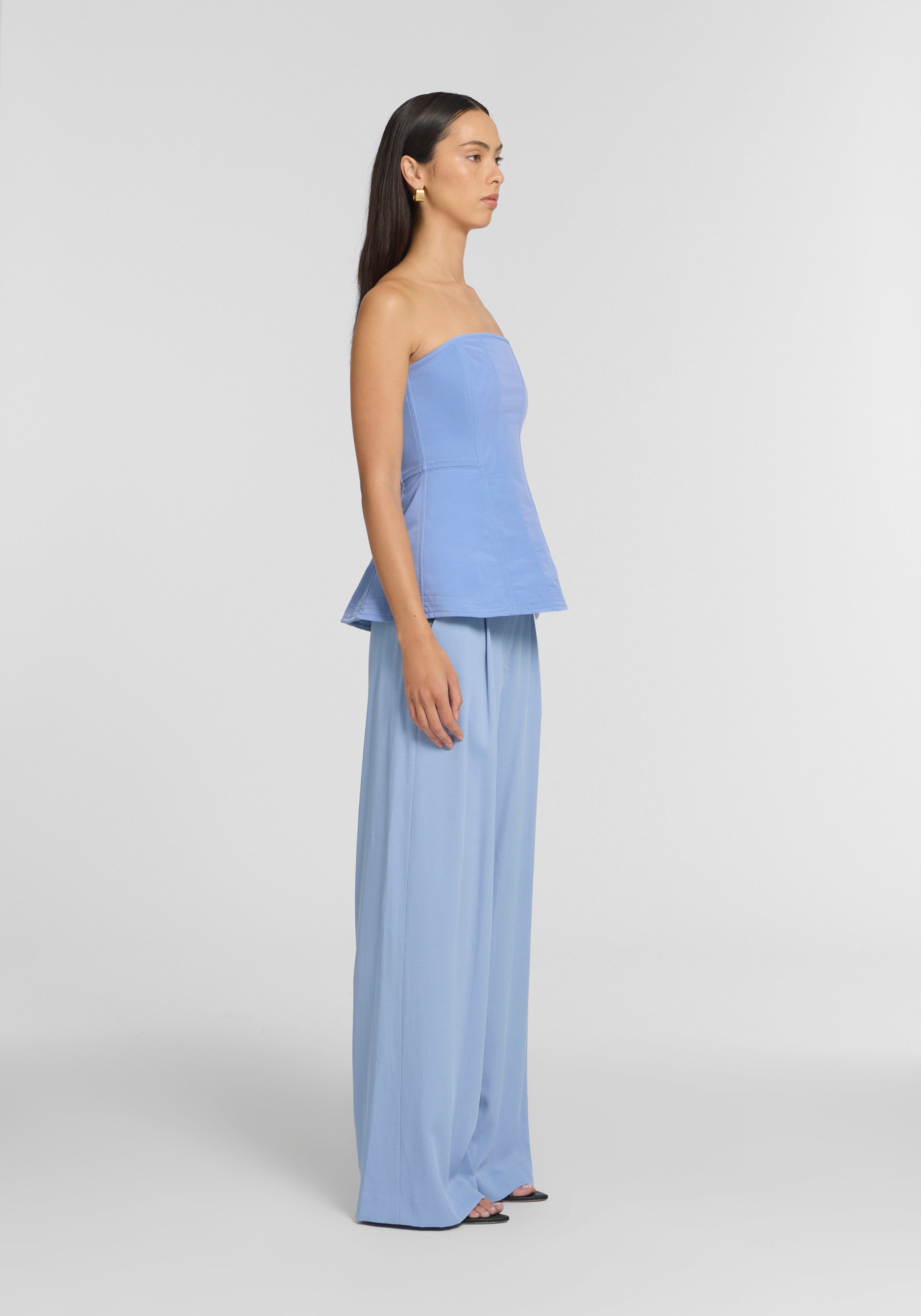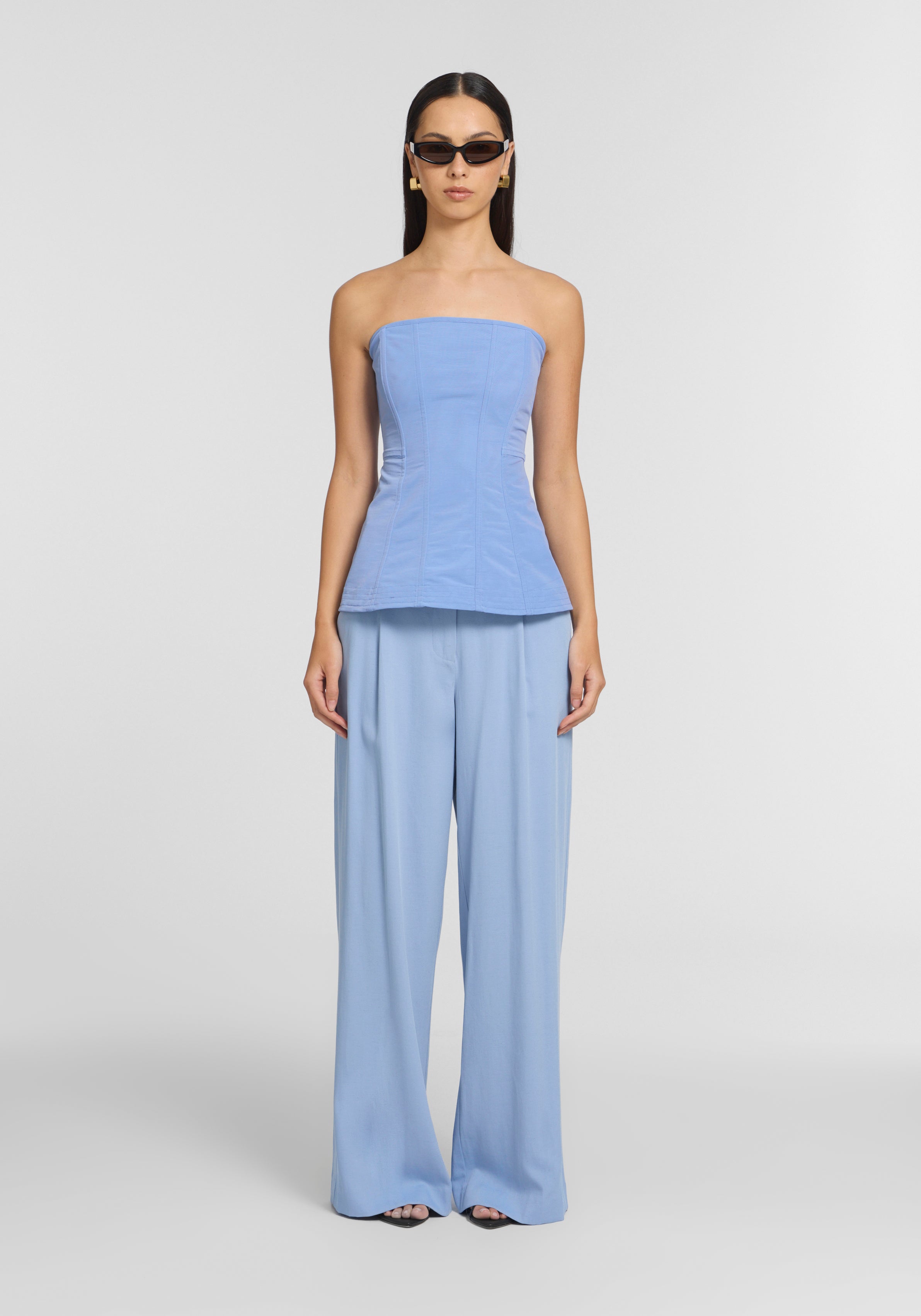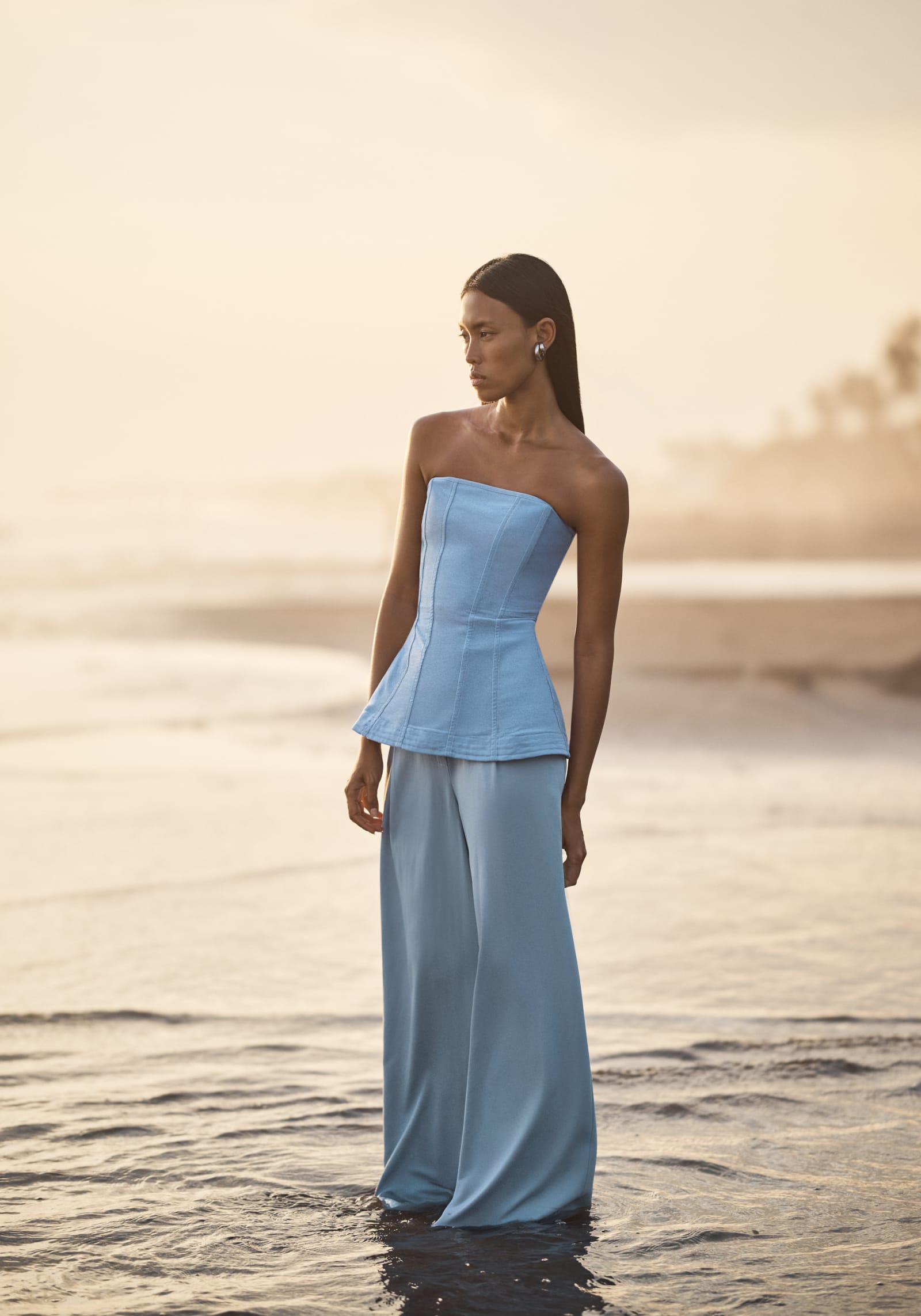 The Winslow Bustier, a modern classic in our signature V&W powermesh in a saltwater blue hue, showcases a flattering peplum silhouette. Expertly engineered with boning and double-layered front panels, it sculpts the silhouette with quiet, architectural power. Complete the look with the Draper Trouser for an elevated look that fuses structure and fluidity.