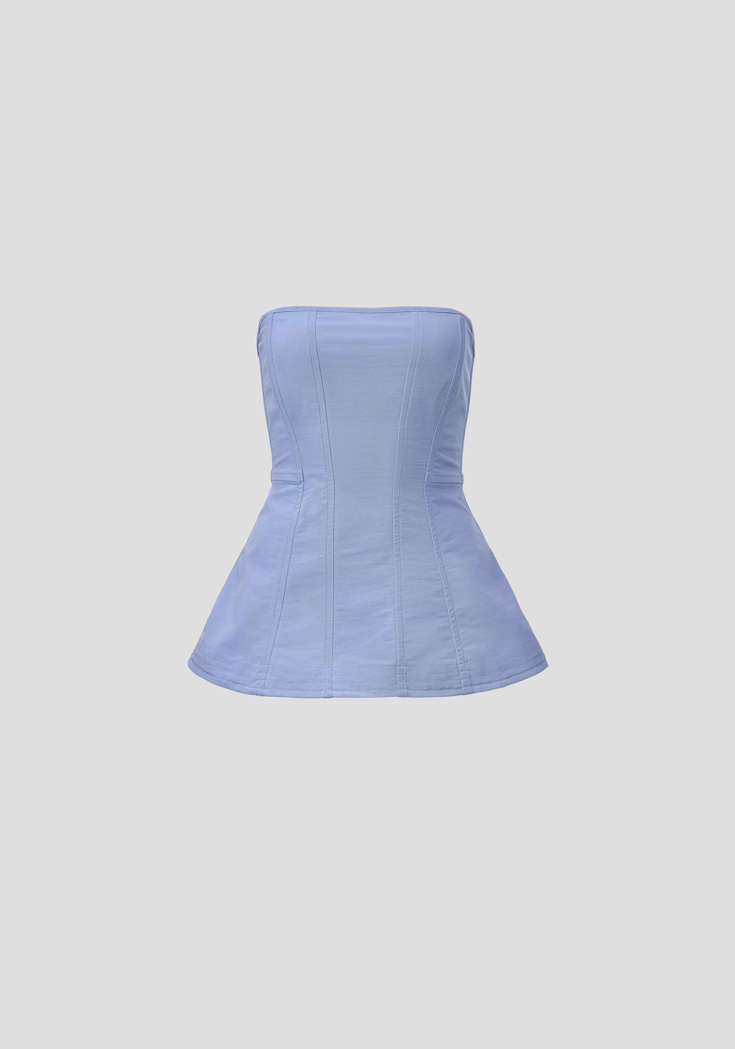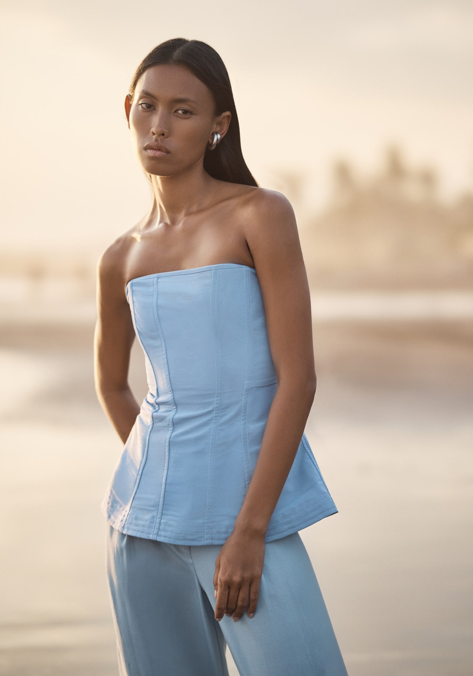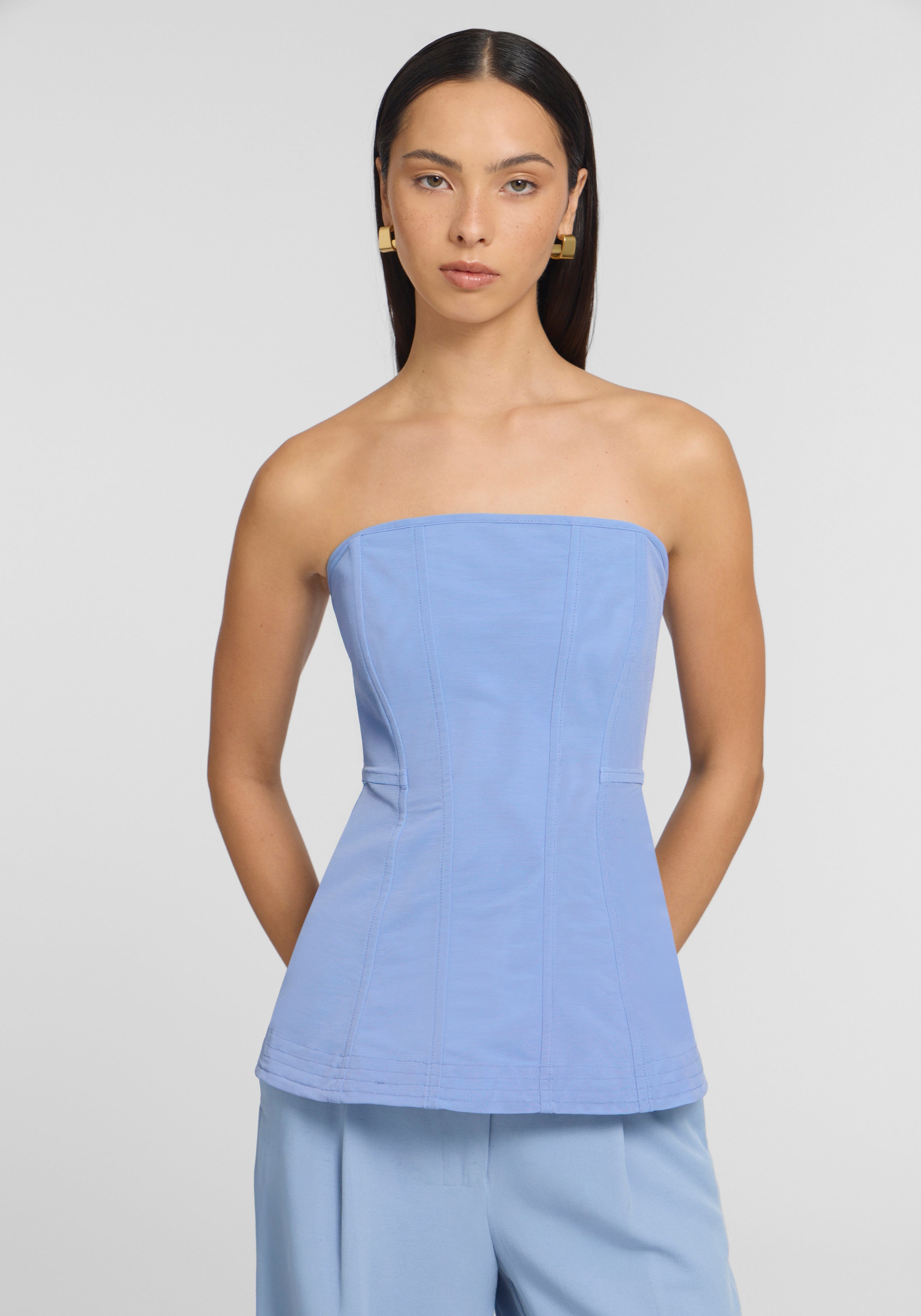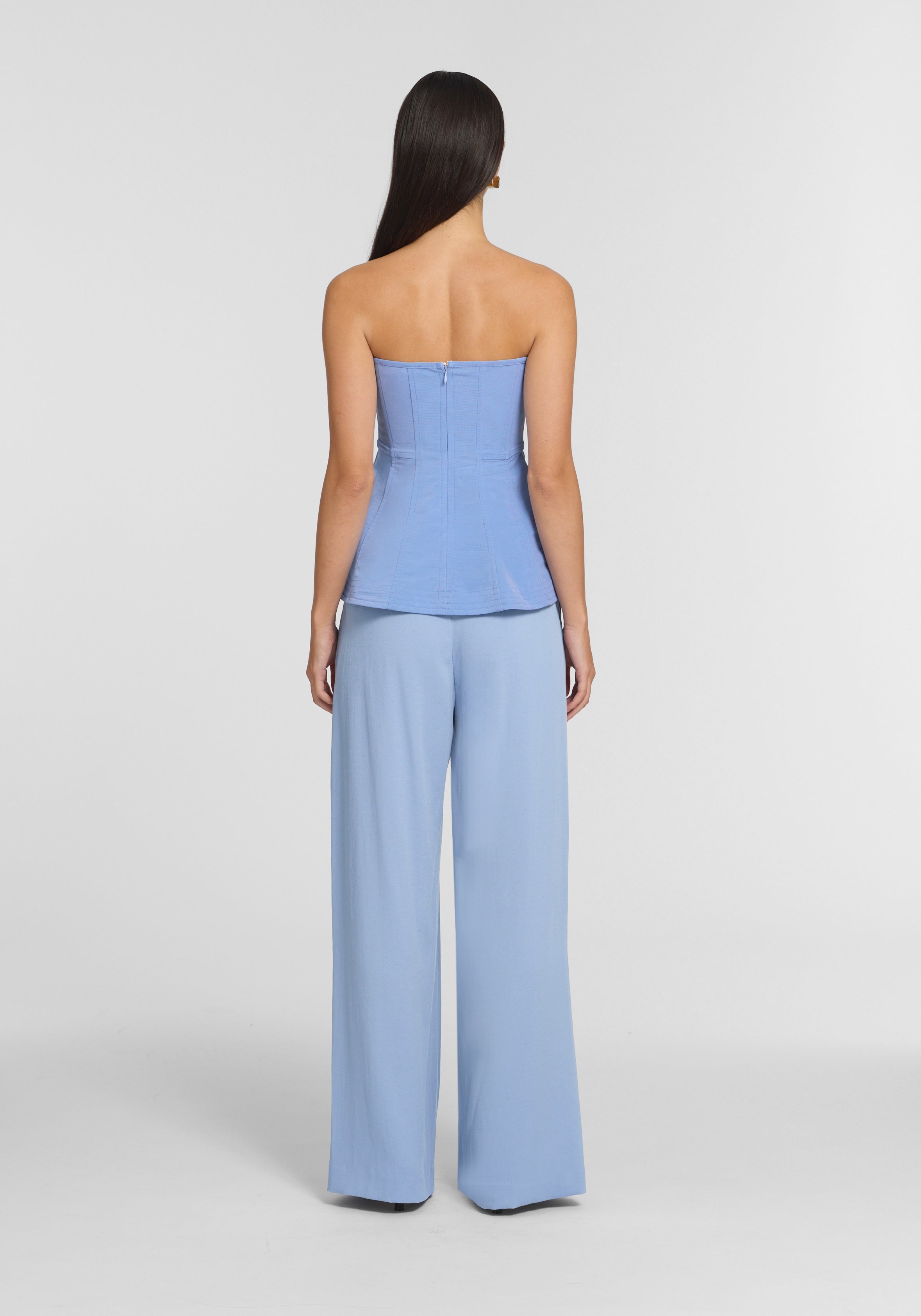 The Winslow Bustier, a modern classic in our signature V&W powermesh in a saltwater blue hue, showcases a flattering peplum silhouette. Expertly engineered with boning and double-layered front panels, it sculpts the silhouette with quiet, architectural power. Complete the look with the Draper Trouser for an elevated look that fuses structure and fluidity.