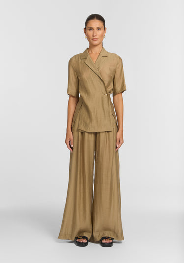 The Wolfhound Shirt, an elevated take on the classic shirt, exudes fluid, sophisticated ease in soft sage. Featuring a front wrap fastening, relaxed shoulders, a collar and lapel, and side-seam splits, it effortlessly carries you through summer events, the workday, and everything in between. Pair with the Irishman Pant for a summer set that speaks to the quiet power of form, or with the Vulture Leather Short for a chic mix of textures.