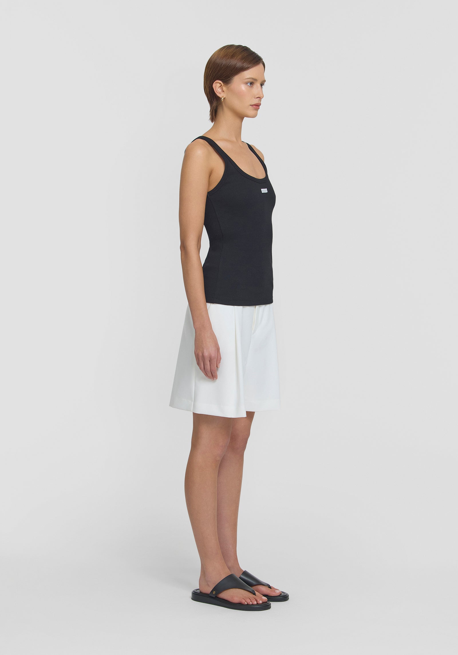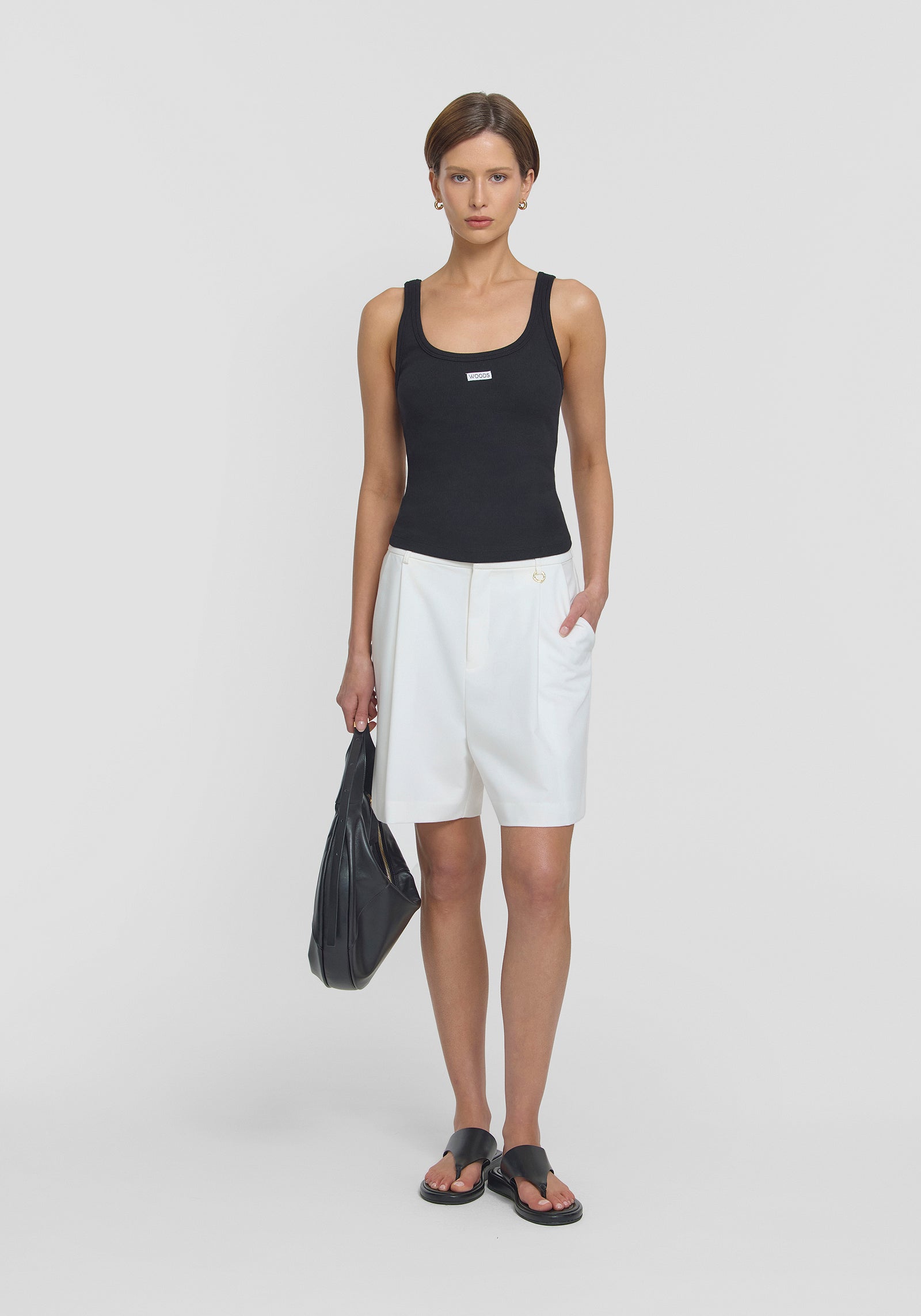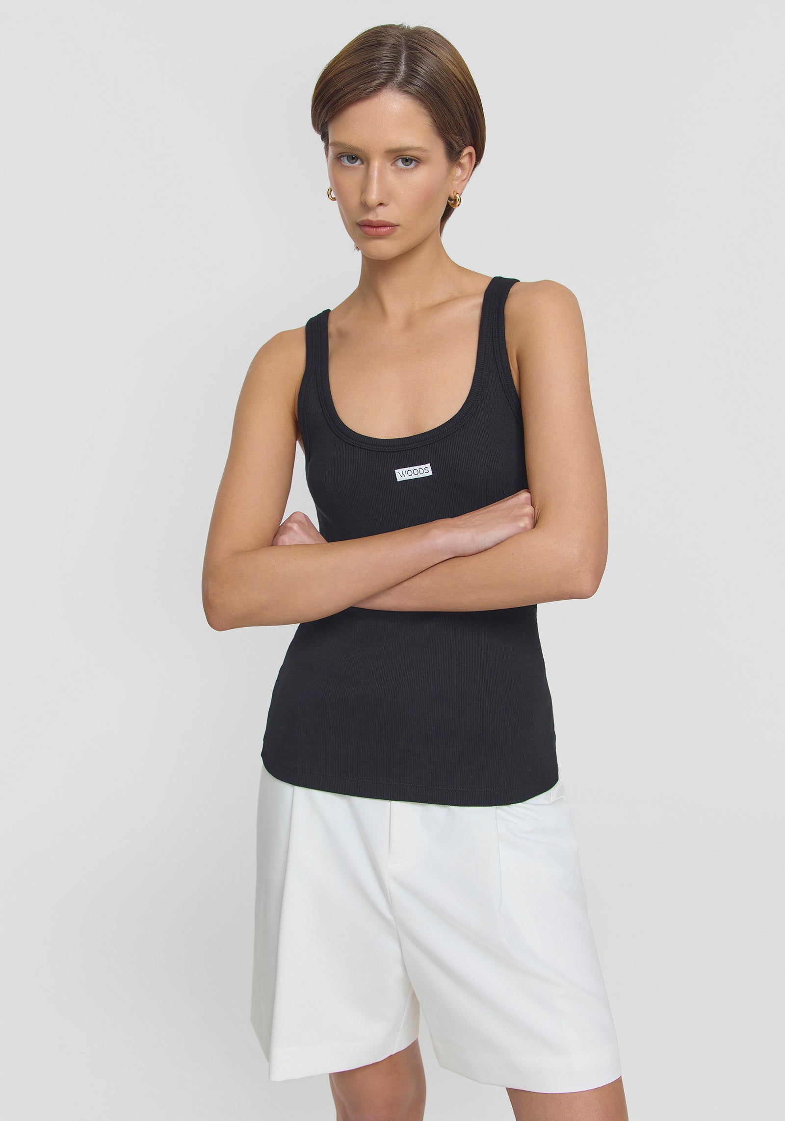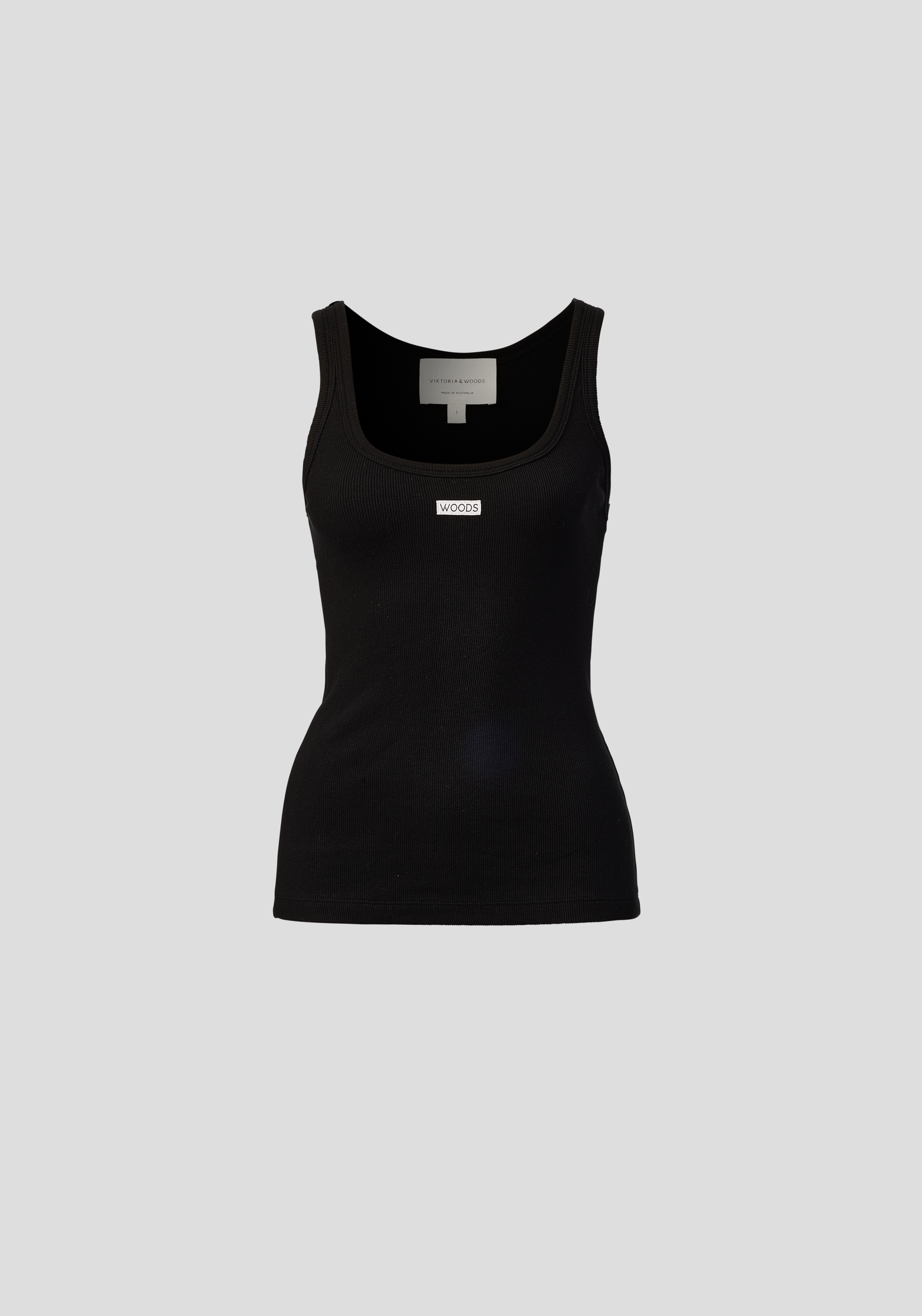 Introducing the Woods Tank in black, a fresh update to our iconic V&W tank with woven contrast WOODS detailing. Crafted from our signature 2x2 cotton rib, it features a scoop neckline, perfect for everyday layering. Pair it with the Unisex Granger Short for a sophisticated, classic look, or style it with denim for effortless, everyday chic.